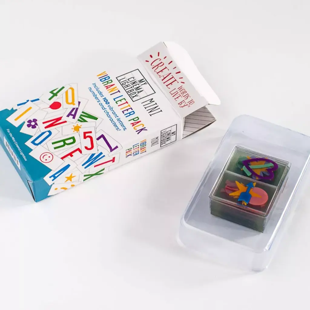 100 color letters, numbers, and symbols for the mini My Cinema Lightbox. Authentic My Cinema Lightbox font in 5 vibrant colors .fits A5 size marquee lightboxes.Includes blank tiles to make your own.Packaged in a box with a holding tray for letters storage. The Mini My Cinema Lightbox classic & color-changing models; most other A5 sized light boxes.full alphabet (multiple letters) and number set; fun symbols and emojis. resealable box with plastic tray. 5 vibrant colors.