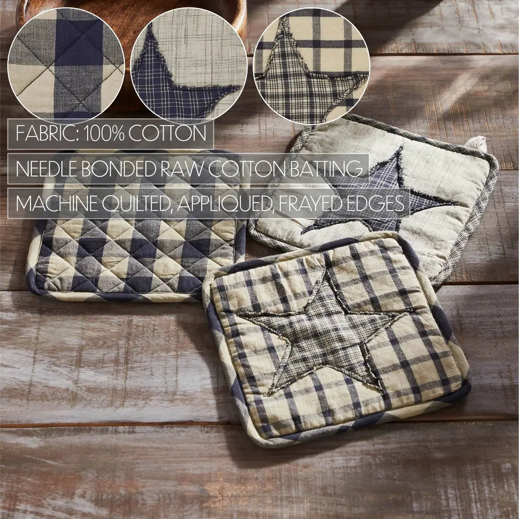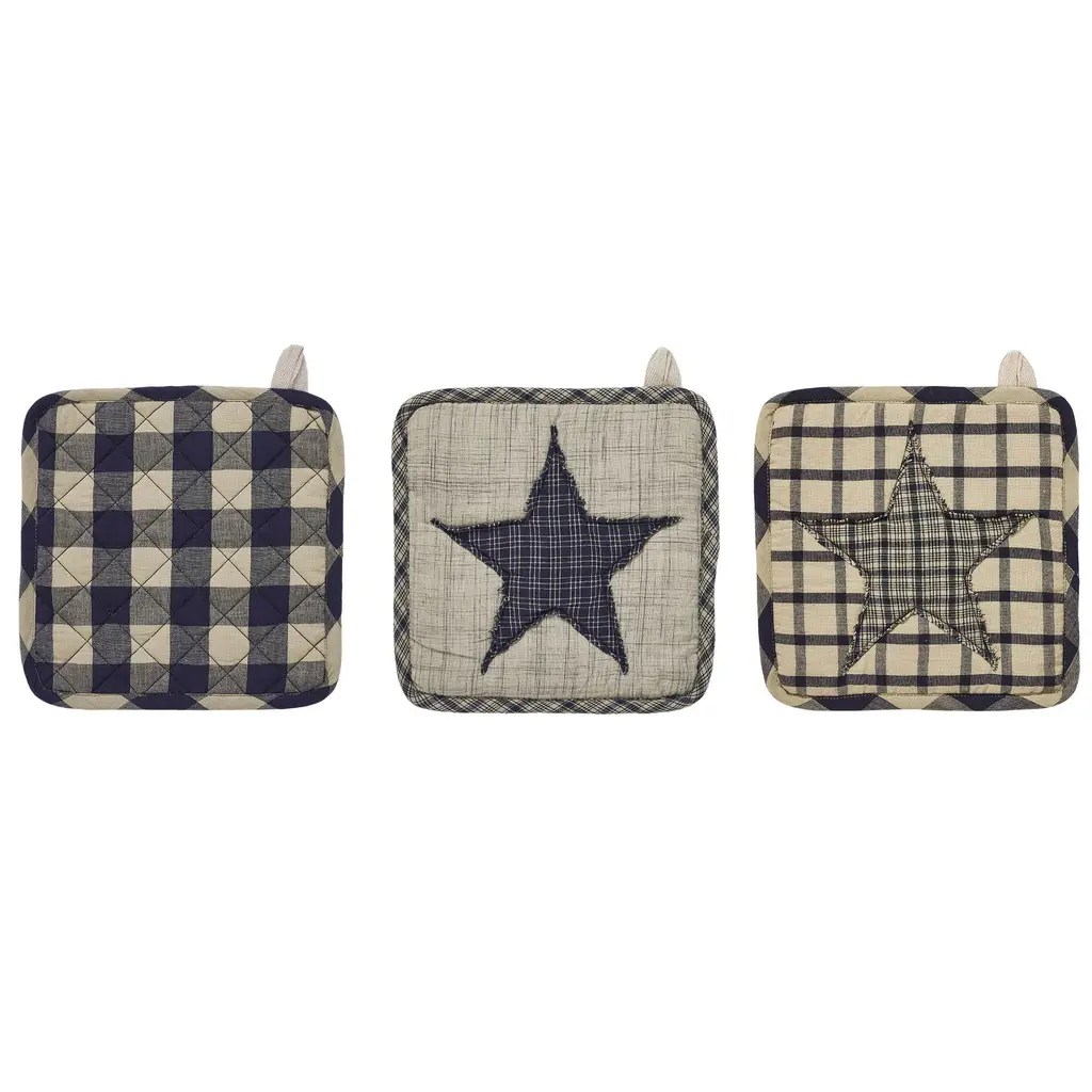 Introducing the VHC Brands Cotton Pot Holder Set of 3 from the My Country Collection - a charming addition to your kitchen decor with a touch of Americana and country style. These square 8x8-inch pot holders not only offer heat resistance but also feature an eye-catching star design, perfectly capturing the essence of a country home. Crafted in a flat weave, these pot holders combine both form and function, making them a fantastic addition to your kitchen. Embrace the spirit of Americana with the My Country Collection pot holders, featuring a classic star pattern that adds a patriotic touch to your culinary space. The flat weave texture enhances the durability of these pot holders, ensuring they can handle the heat while exuding country charm. The rich navy color provides a timeless backdrop for the charming star design, adding character to your kitchen while protecting your hands. Enhance your kitchen with this set of pot holders that embody the essence of country living. The VHC Brands Cotton Pot Holder Set of 3 from the My Country Collection combines warmth, style, and functionality to elevate your culinary experience. Perfect for both everyday use and special occasions, these pot holders infuse your kitchen with a touch of Americana while offering reliable heat protection, making them a versatile and appealing choice for any home chef.