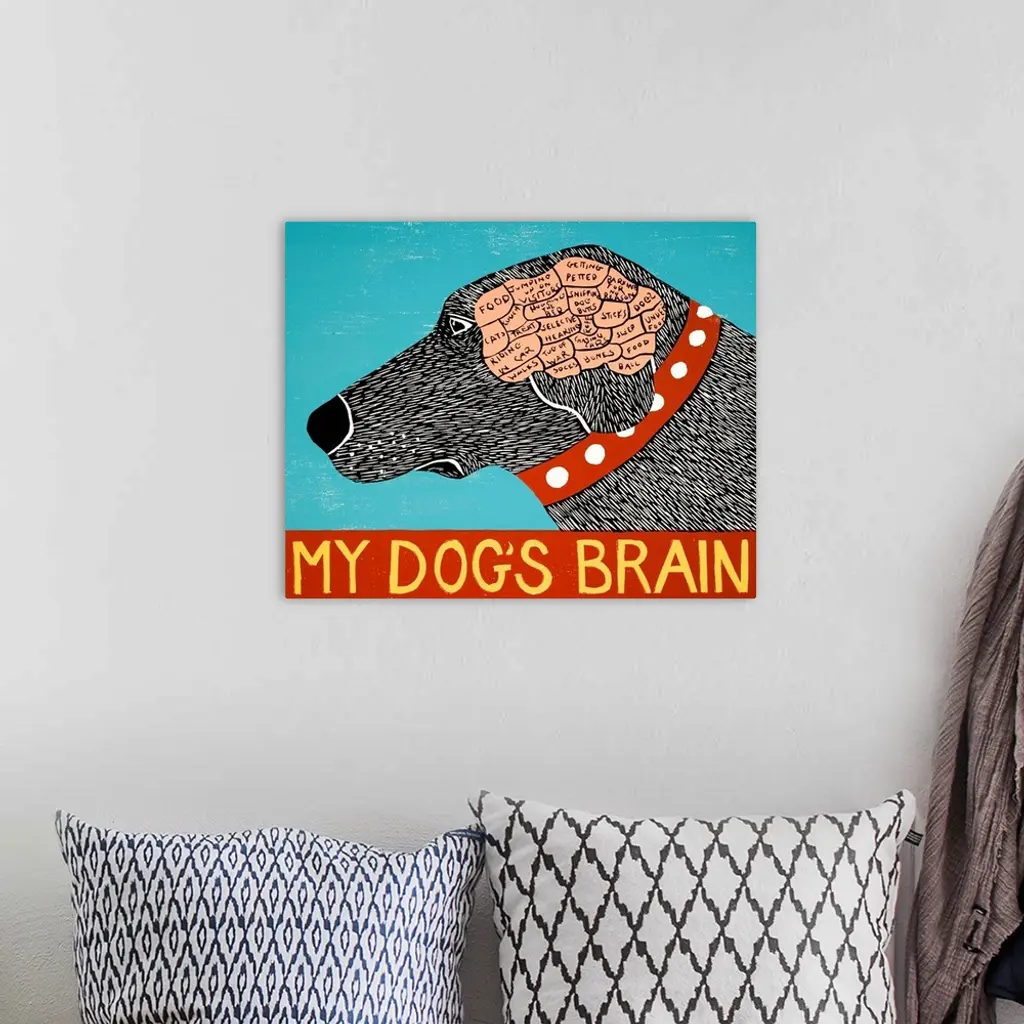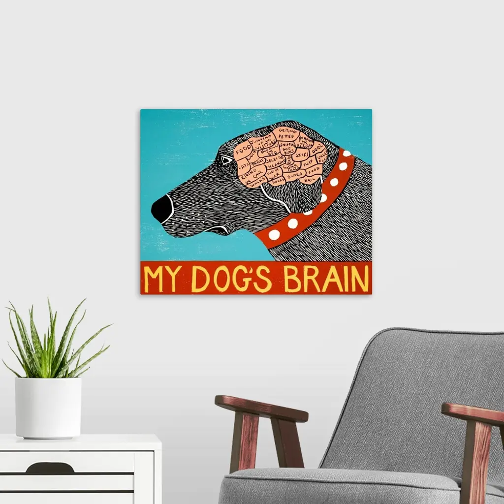 Illustration of a black lab showing its brain and how its brain is divided up with the phrase "My Dog's Brain" written on the bottom.