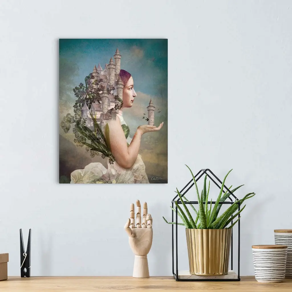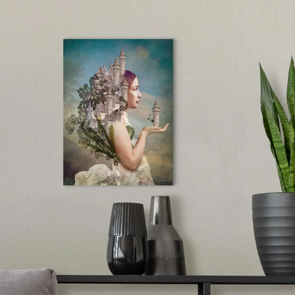 A lady has a castle coming out of her hand and back with a cloudy background.
