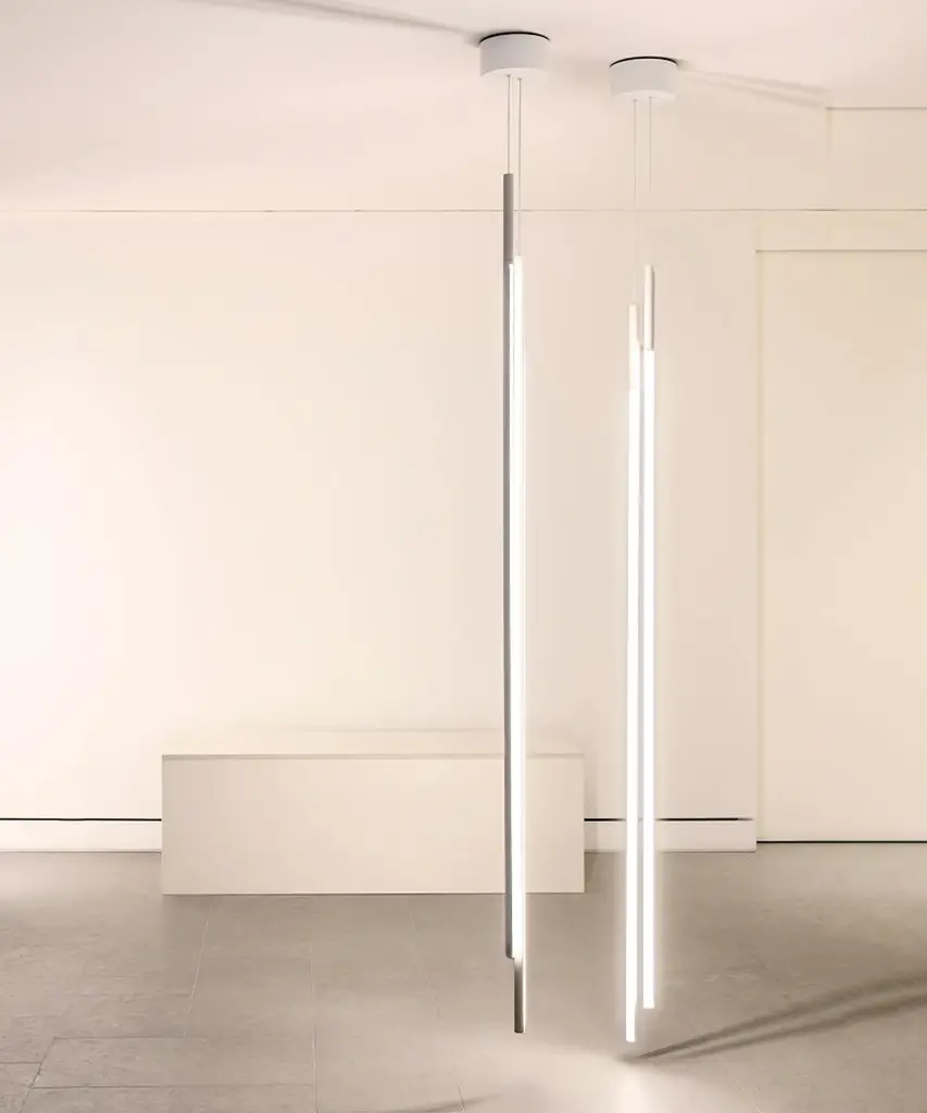 My Lines is a suspended lamp with diffused light composed of two vertical bars that can be oriented, and attached to a canopy with a matte white finish. Each element is made of extruded anodized aluminum with a matte white finish and a diffuser in platinum optical silicone with an integrated LED strip (CRI 90). Usable power cable length 300 cm and adjustable brightness 10–100%. The canopy has to be ordered separately, the electronics integrated with the canopy enable the use of dimming systems: PUSH dimming, 1-10V, and DALI. This authentic design is produced in Italy exclusively by Flos.