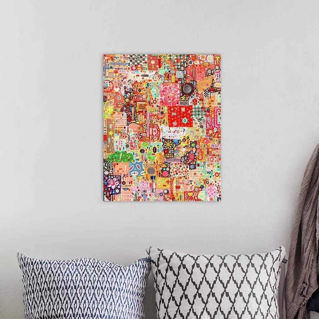 Mixed media abstract art with hundreds of found elements, including text, illustrations, and symbols.