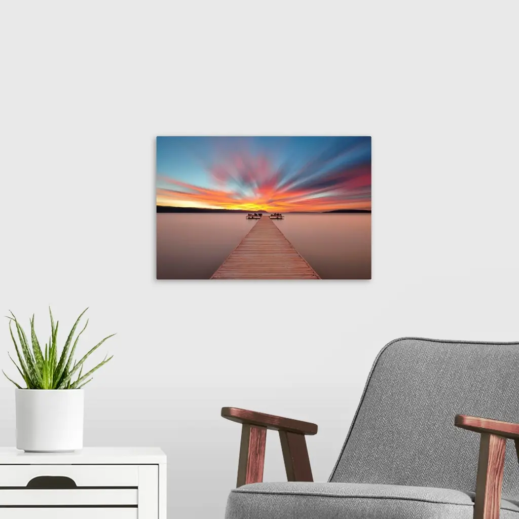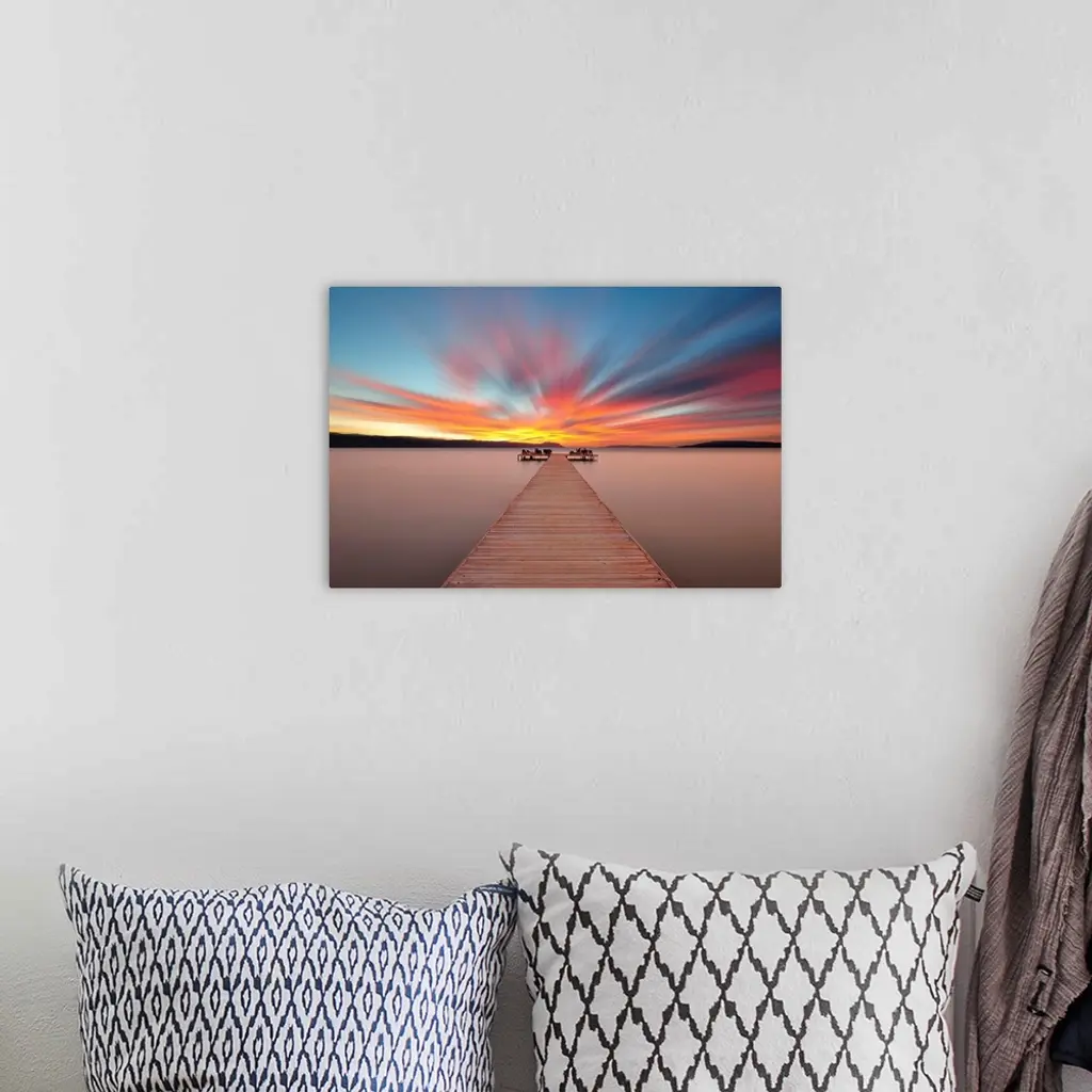 A wooden pier stretching out onto the water under a brightly colored sunrise sky.