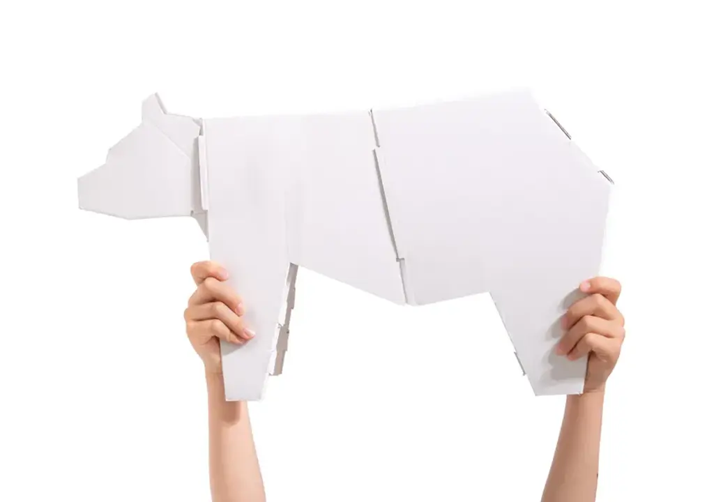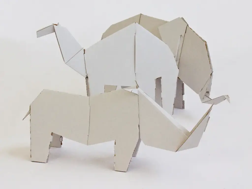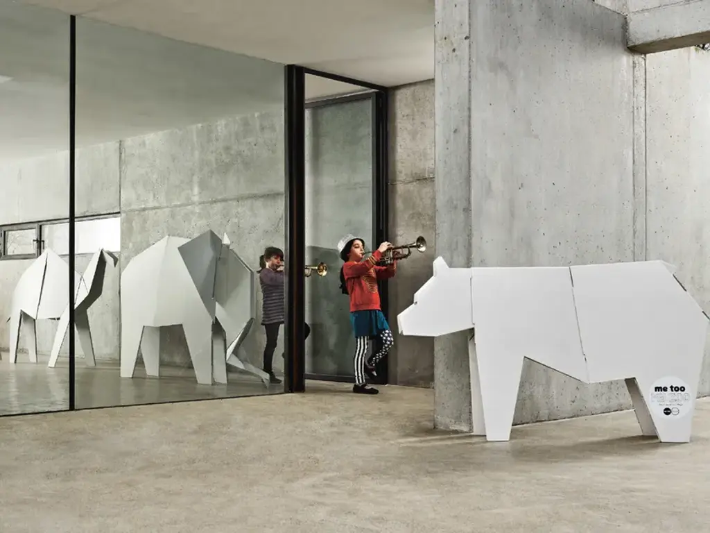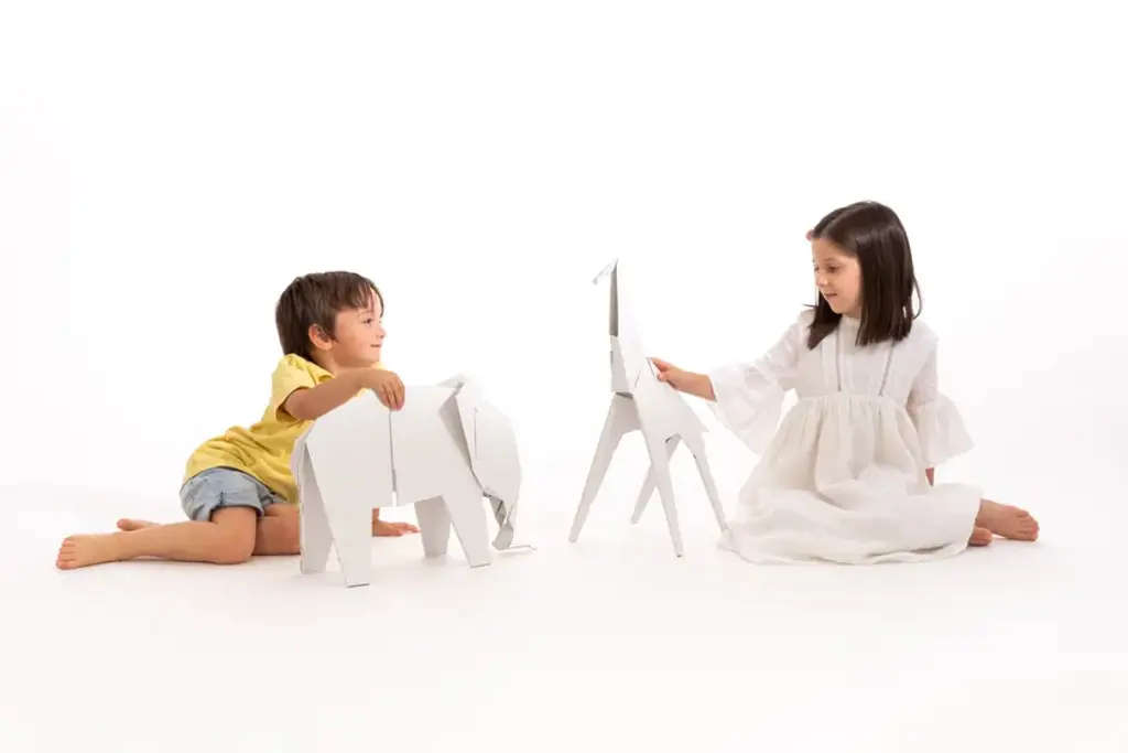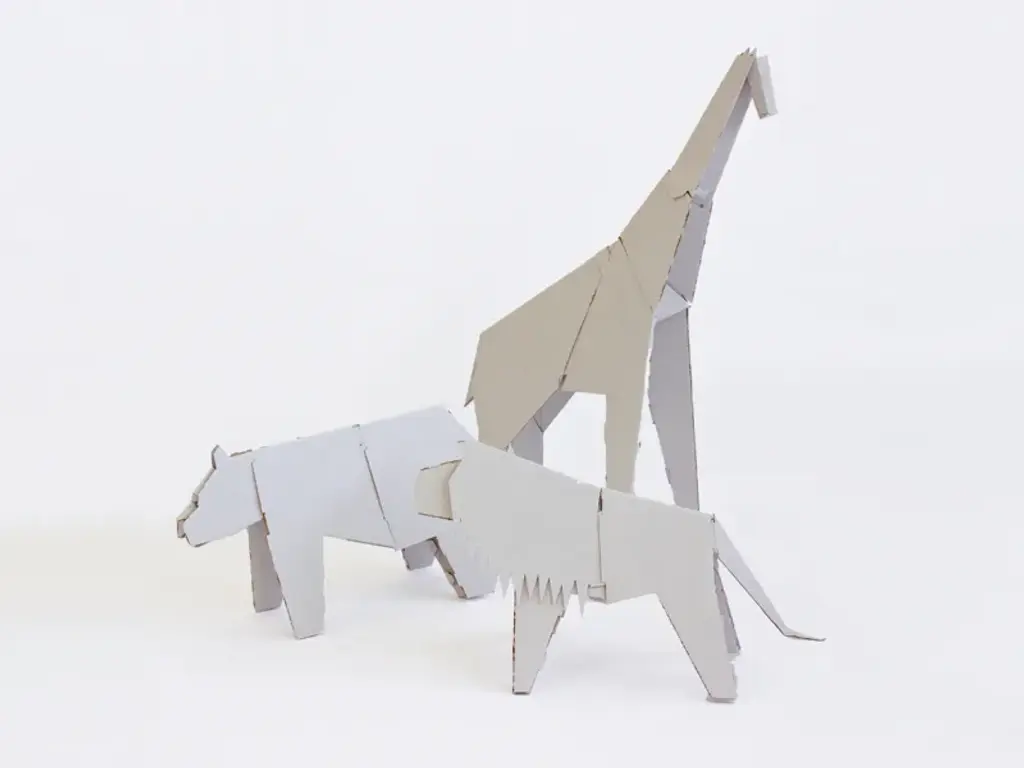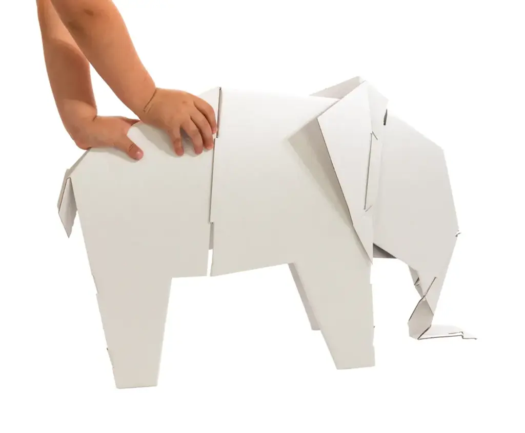 My Zoo is a collection of animals in white cardboard, which will be on the market disassembled and therefore the various pieces have to be folded and assembled. Once this figures have been assembled, they can be drawn in pastels, in wax, tempera or water colours, as you like most. Elephant, giraffe, lion and dromedary are really very big …. and you can even enter the whale mouth to reach its belly, to do a very long trip, up to the reality boundaries. However, all animals are good, they do not bit, they do not weigh and moreover they can be recycled as they are made of cardboard.
