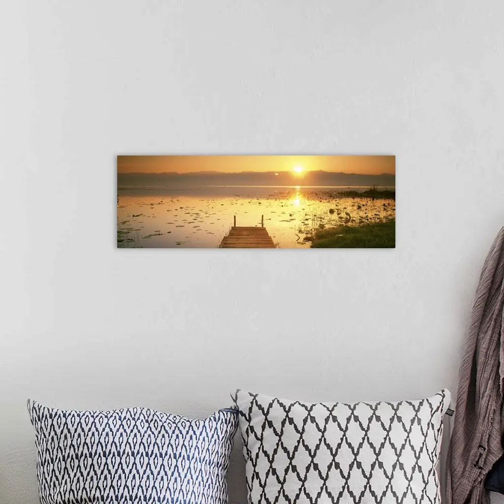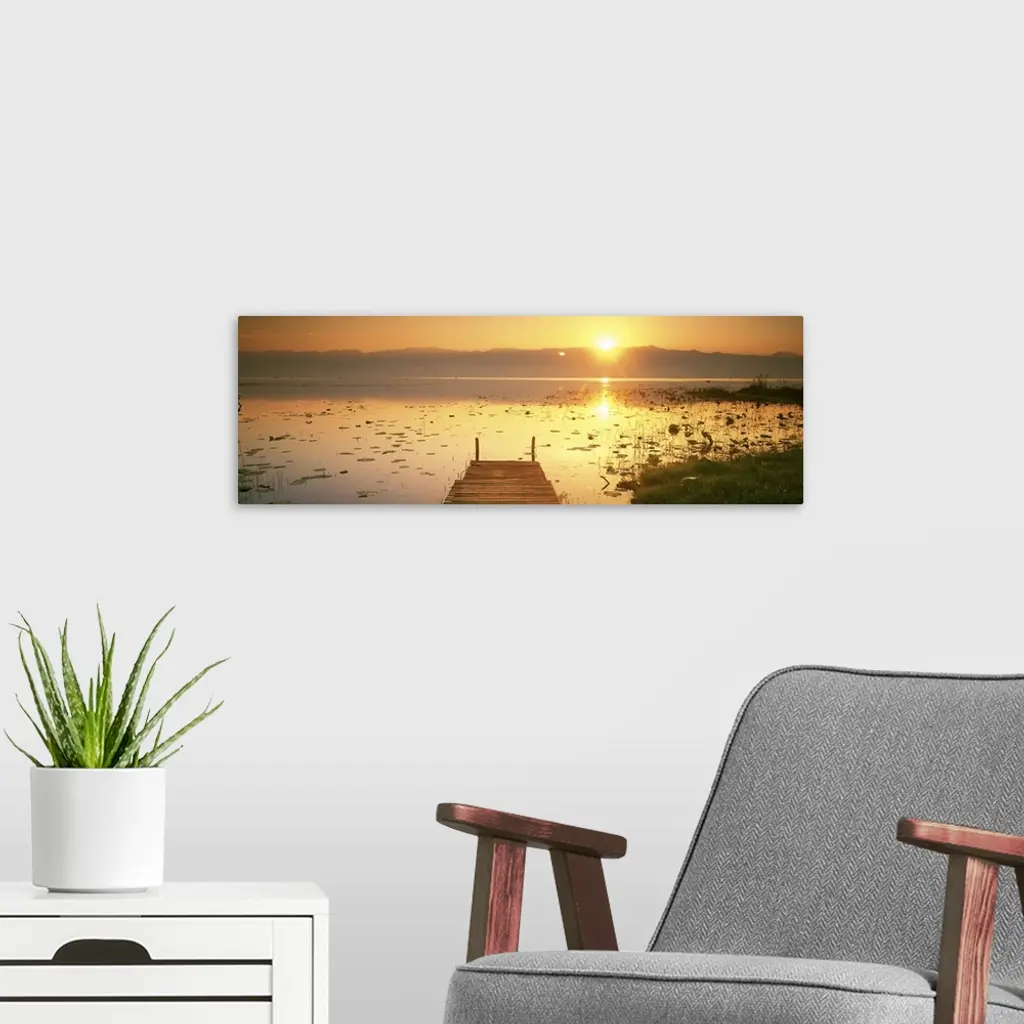 Myanmar, Inle Lake, View of the sunset and pier wall art for home and office decor. Discover canvas art prints, photos, mural, big canvas art and framed wall art in GreatBigCanvas.com's varied collections.