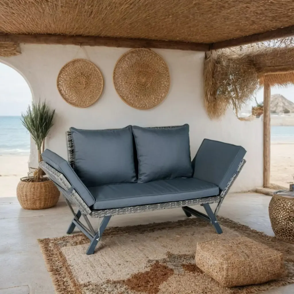 This multi-functional patio bench combines practicality and beauty. The frame is made of powder-coated, rust-resistant high-quality steel with non-slip feet for durability and stability; the hand-woven all-weather rattan is environmentally friendly and durable, making daily maintenance and cleaning a hassle-free experience. The modern and stylish combination of gray wicker and dark gray cushion, whether placed indoors or outdoors, all show the style. Unique foldable side armrests are designed to be comfortable to lean on and easy to hold books and other items when flat. Detailed instructions and a full set of hardware are included for quick and easy installation, bringing you a high-quality lounging experience.