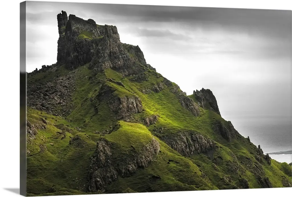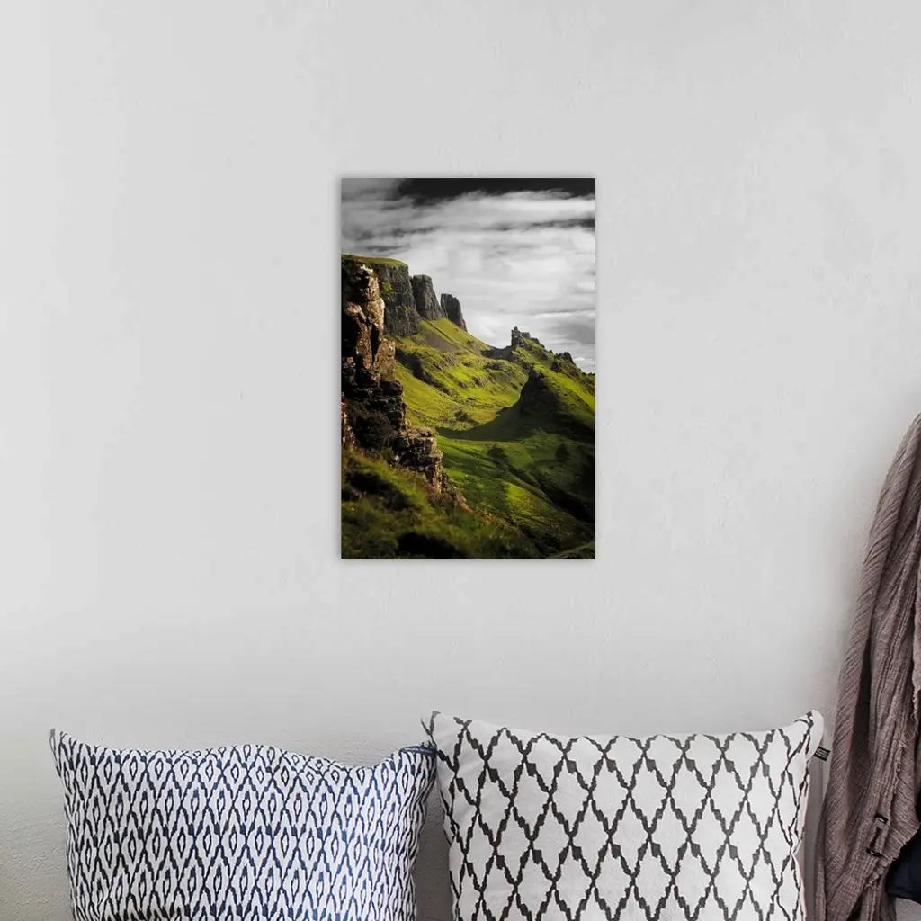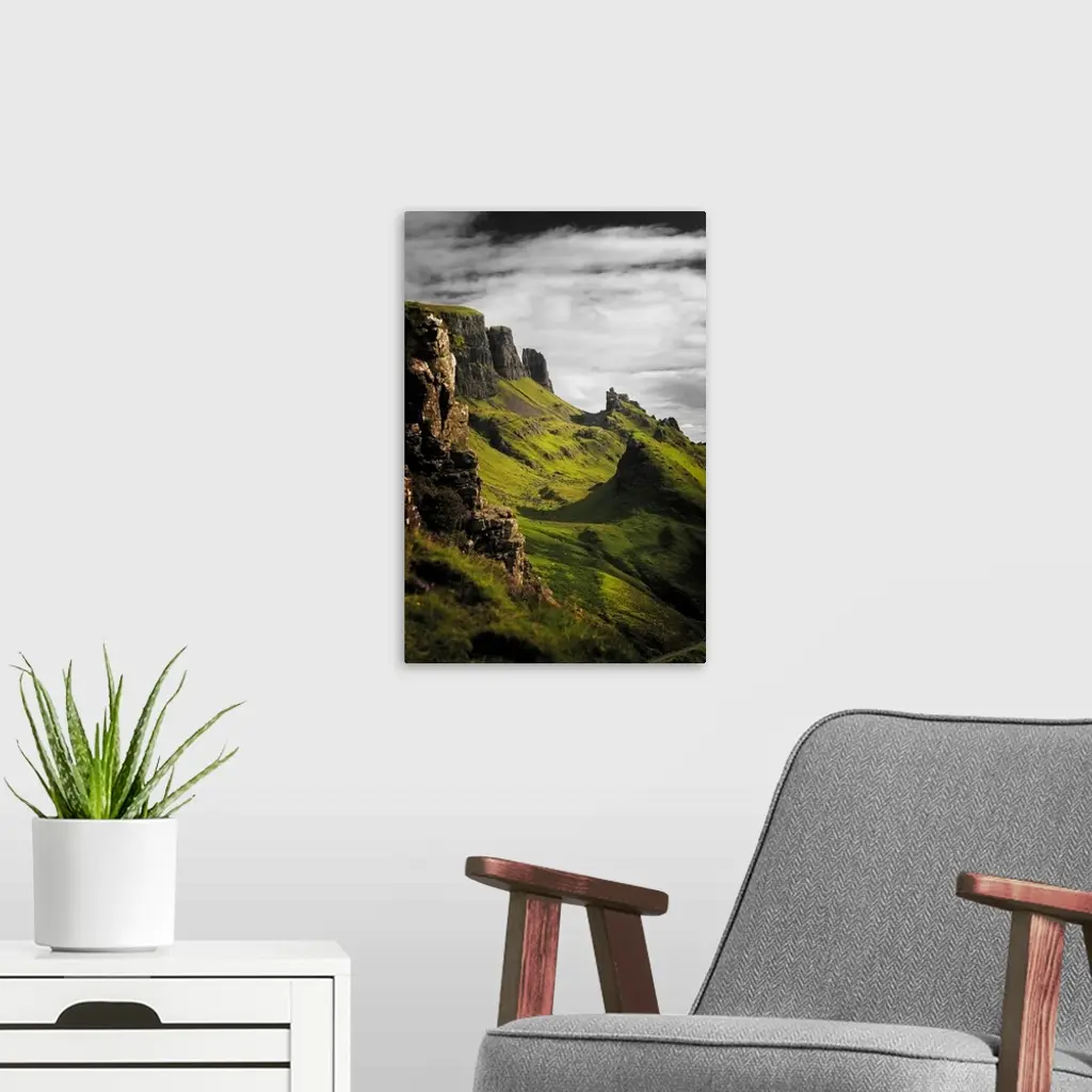 Fine art photo of a misty valley surrounded by steep cliffs.