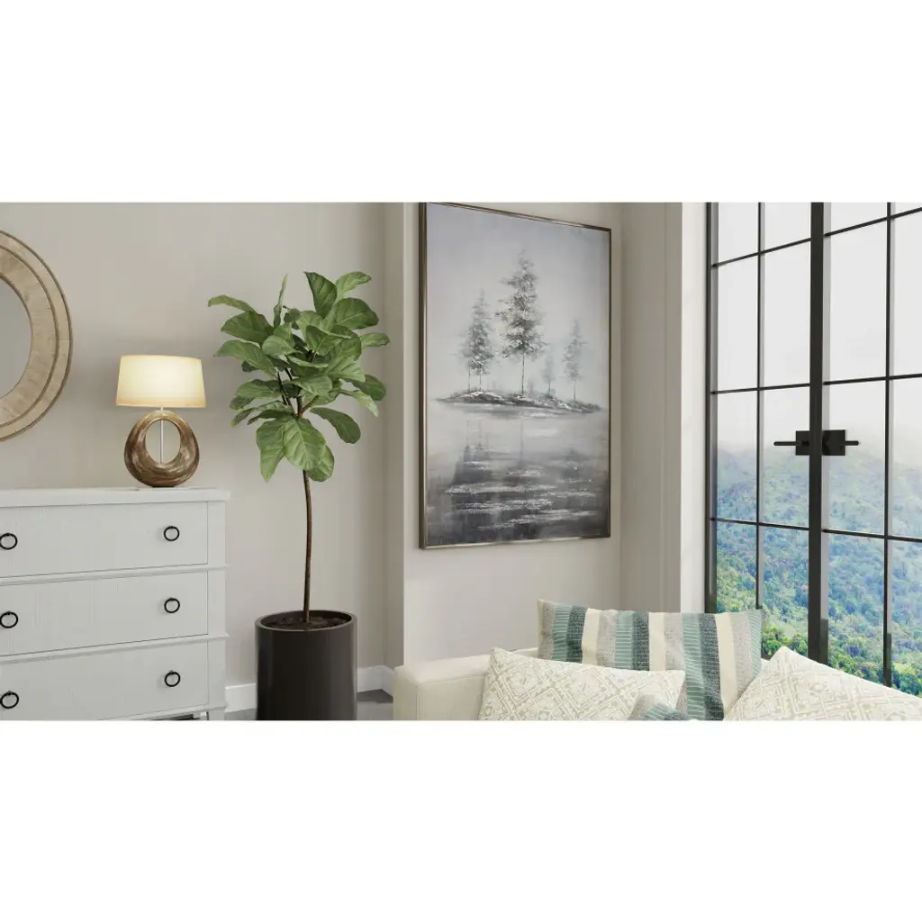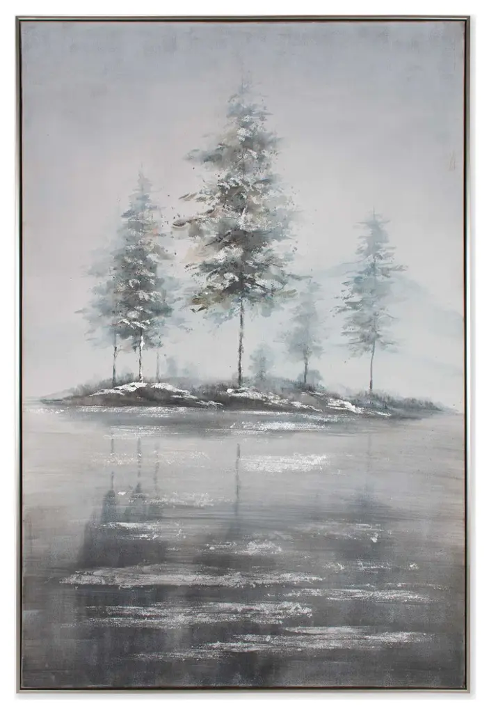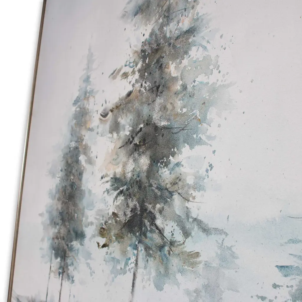 Get lost in the serene calm of these mystic woods. Exquisitely designed and 100% hand painted this large canvas features a silver floater frame and silver leafing. The neutral calming color palette makes a perfect addition to any space41" x 2" x 61"100% Hand PaintedFramedReady to Hang