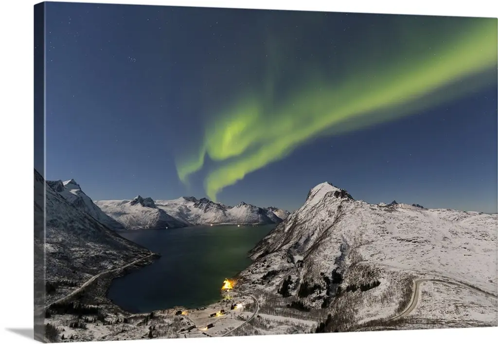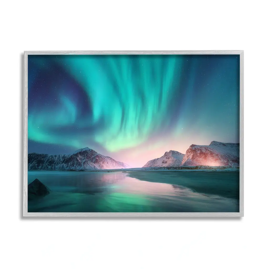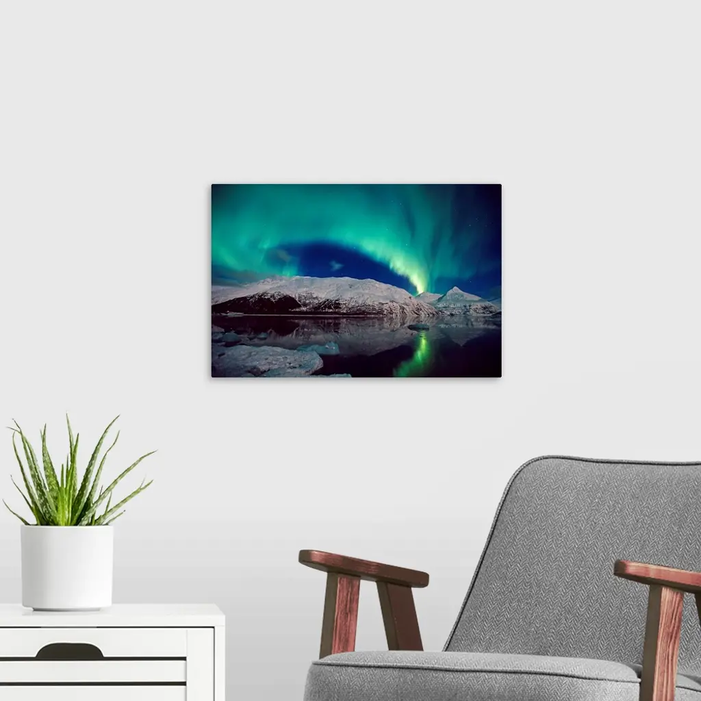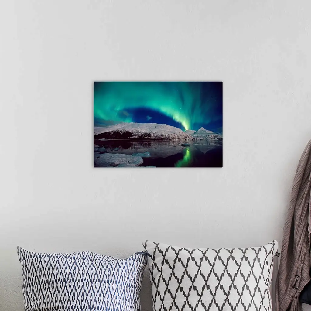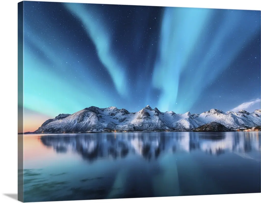 Canvas photo art of northern lights in the sky above snow covered mountains near water.