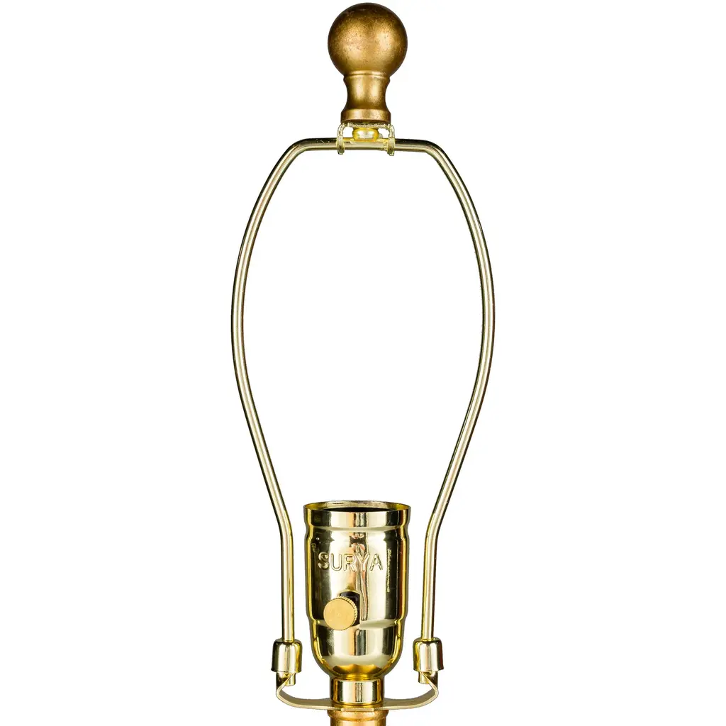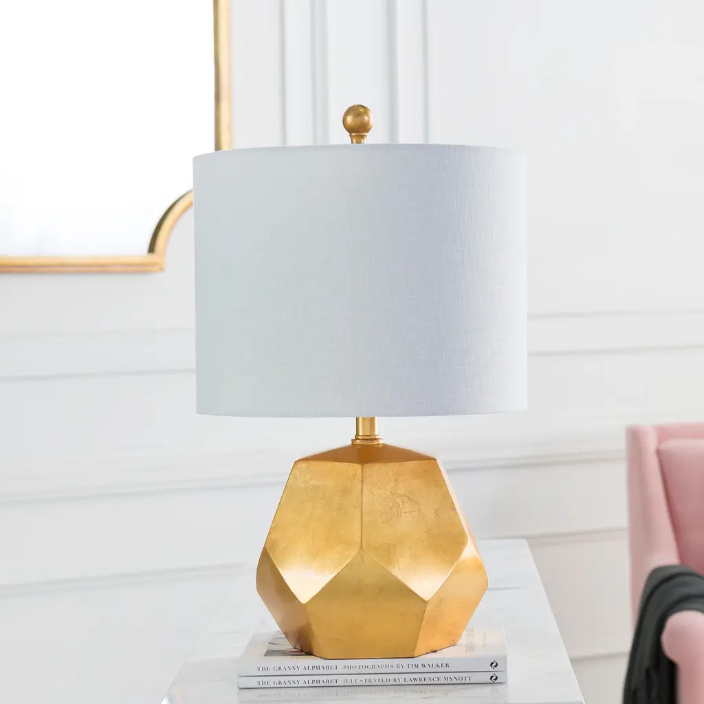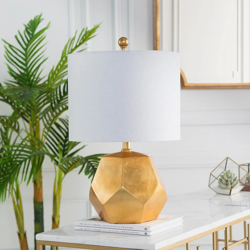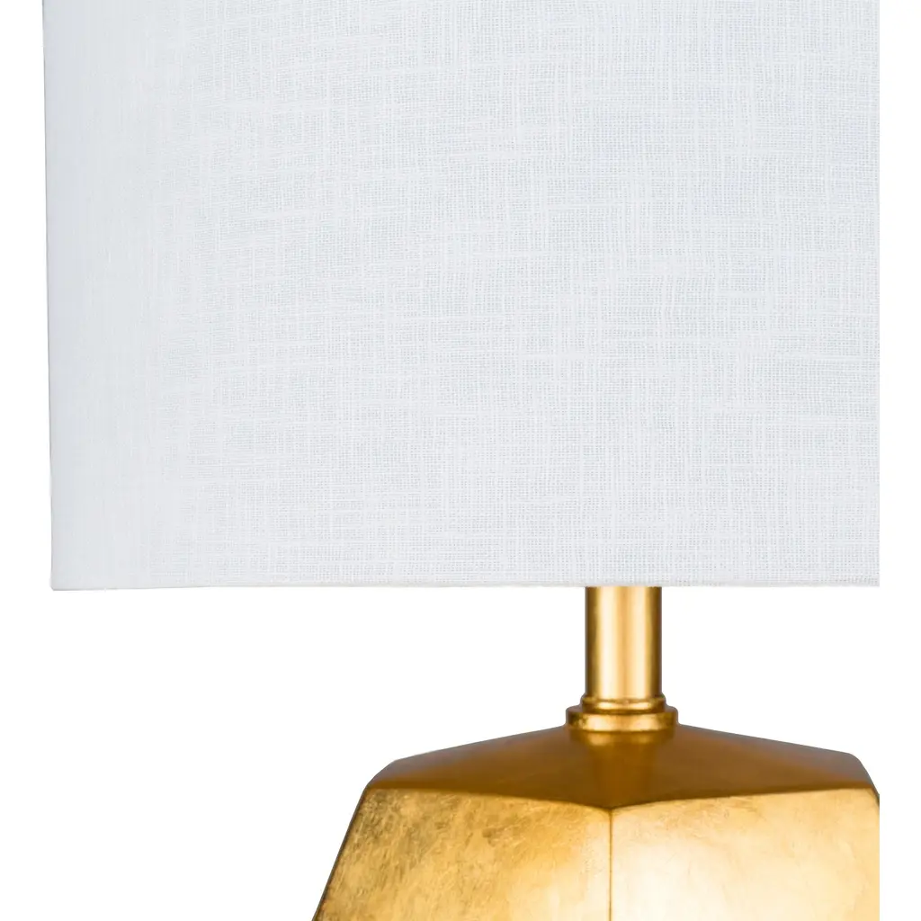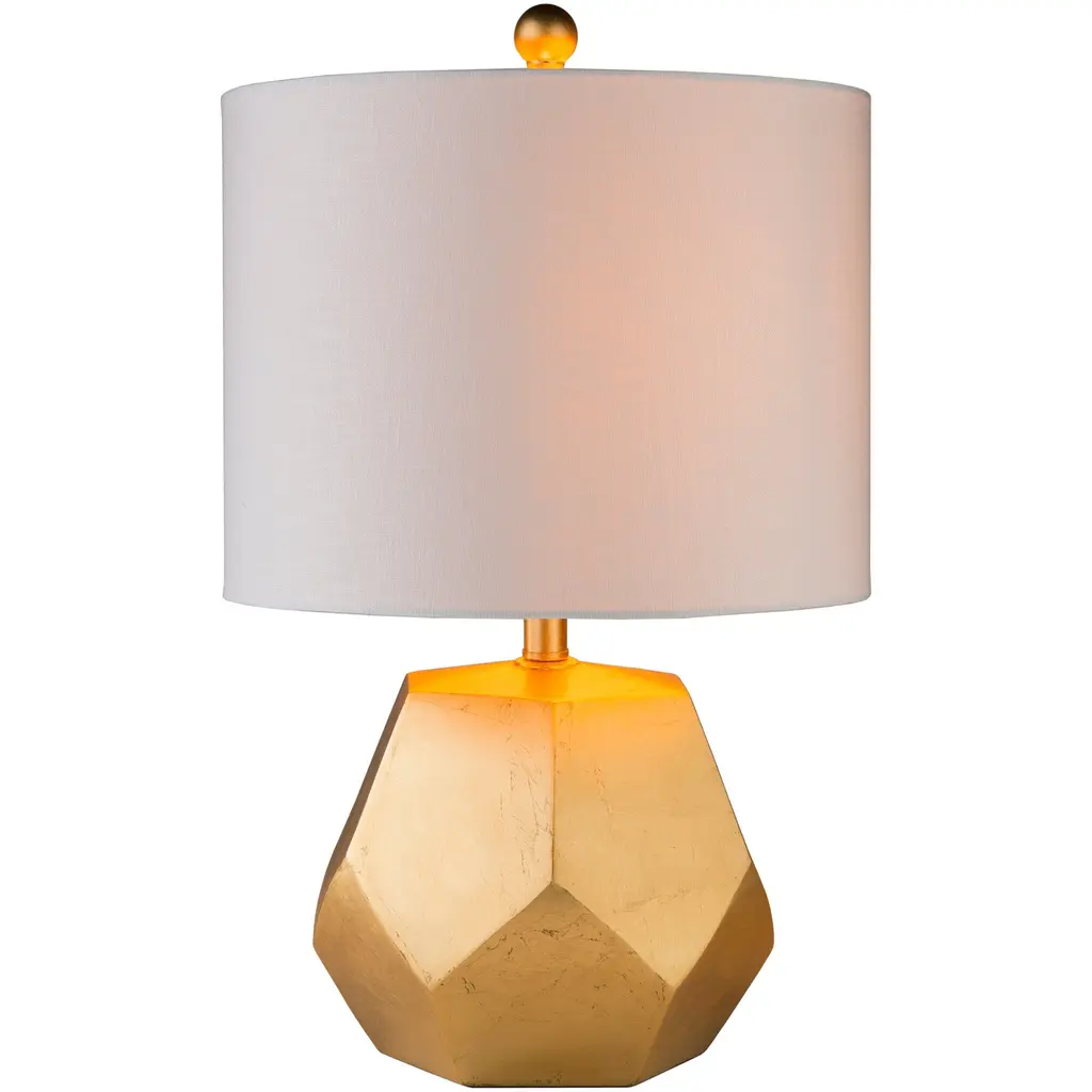 The Naahs collection offers this unique piece. A golden gemetric shape embodies the base of this piece that is simply eye-catching. This shimmering lamp completes itself with a class cylindrical shade.Bulb Wattage: 100 WShade Material: LinenLighting Type: Table LampNumber of Lights: 1 LightProduct Features: UL ListedLamp Type: Table LampMaterial: ResinLight Direction: DownlightHeight: 14 in or lessSetting: IndoorSwitch Type: Rotary SwitchLighting Style: ModernWidth: 16 in or lessColor: GoldDimensions: 21.5 L x 13 W x 13 H