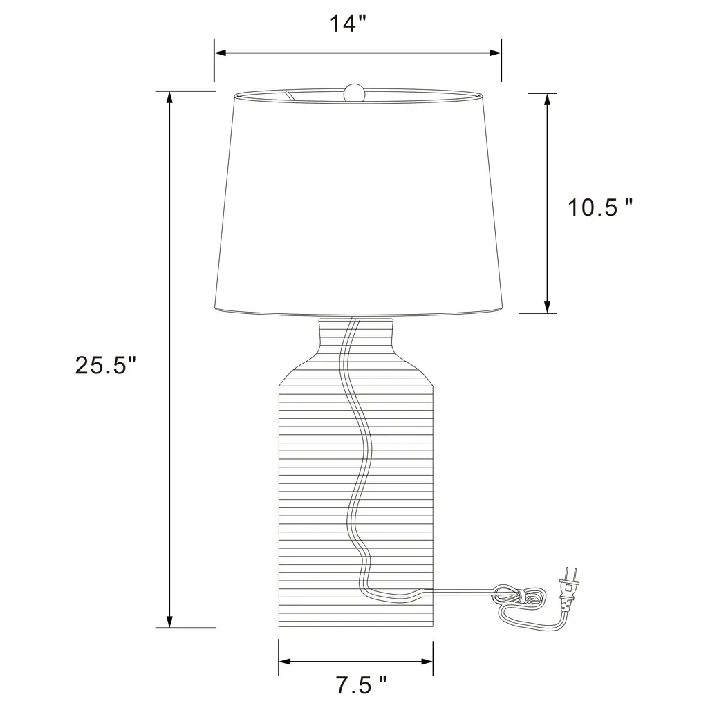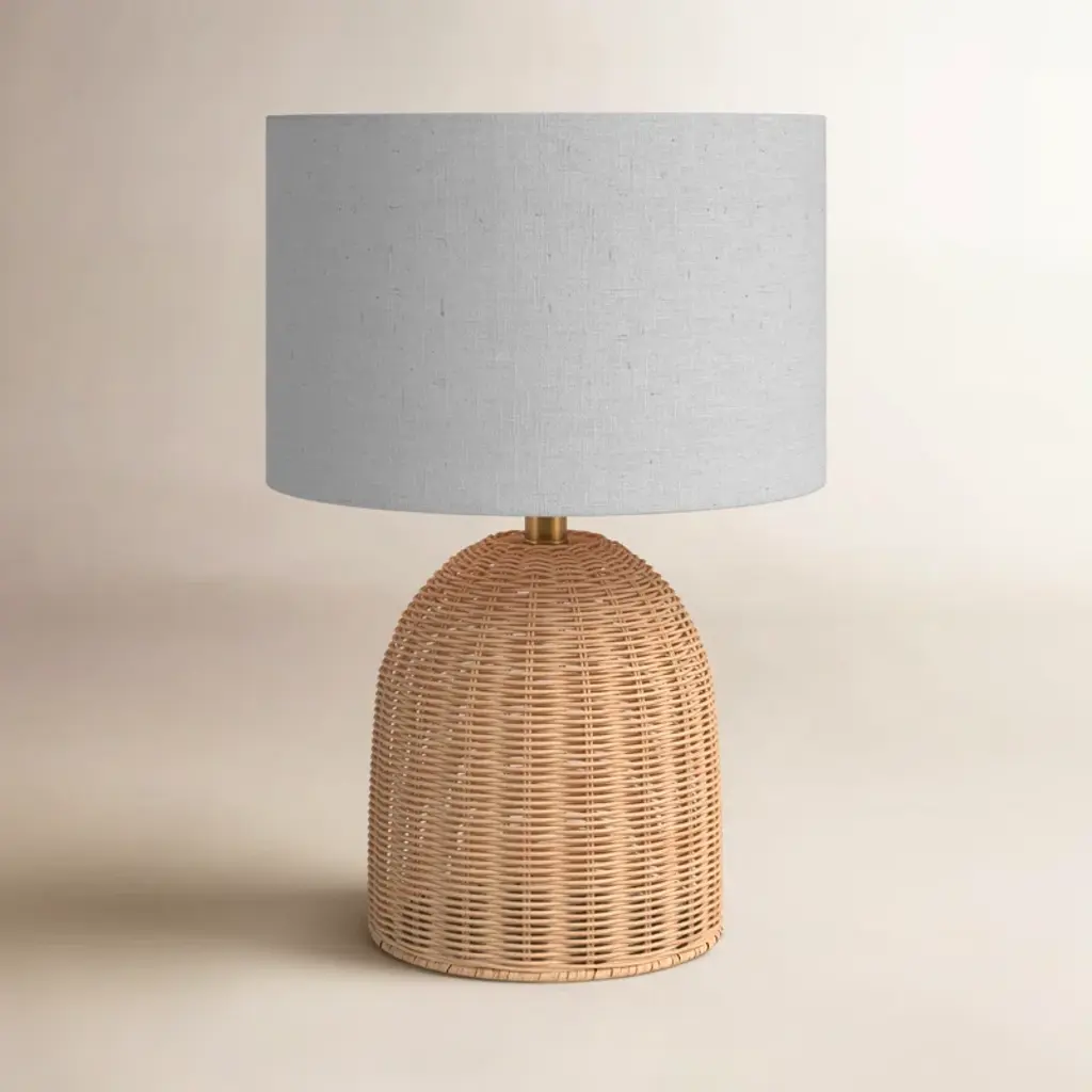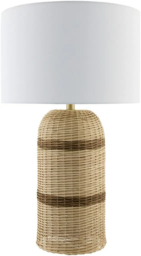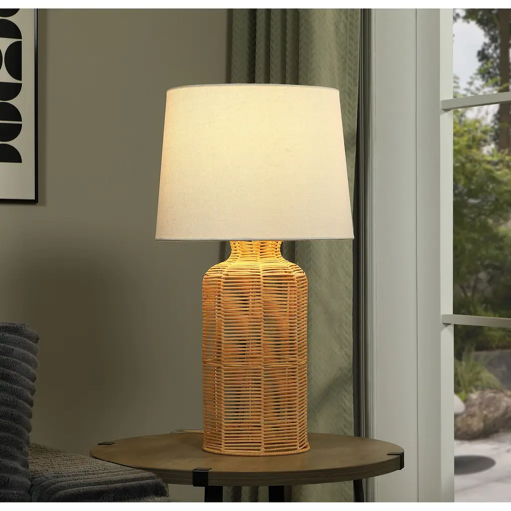This table lamp seamlessly combines natural textures with modern elegance. Featuring a handcrafted rattan base in a cylindrical shape, it exudes a warm appeal. The neutral fabric shade beautifully complements the rattan, softly diffusing light to create a cozy ambiance. Supported by a durable metal frame, this lamp offers both style and longevity. Perfect for bedrooms, living rooms, or entryways, it brings a touch of earthy sophistication to any space. Item Contents: Includes: One (1) table lamp Item Bullets: Table lamp with cylindrical base handcrafted from natural rattan for a warm look Neutral white fabric empire shade diffuses light, creating a soft and inviting glow Sturdy metal frame ensures durability and long-lasting quality Perfect for side tables, nightstands, or accenting a living room or entryway Features a simple, reliable two way on/off rotary switch for easy operation Materials: Materials: Fabric, Rattan, Metal Features: Fabric Color: White Finish Color: Natural Upholstery: Fabric Fabric Content: Cotton 50%, Linen 50% Clean Code: S Assembly Type: Full Assembly Required Dimensions: Table Lamp: 14.00 inches wide x 14.00 inches deep x 25.50 inches high Accessories pictured are NOT included.