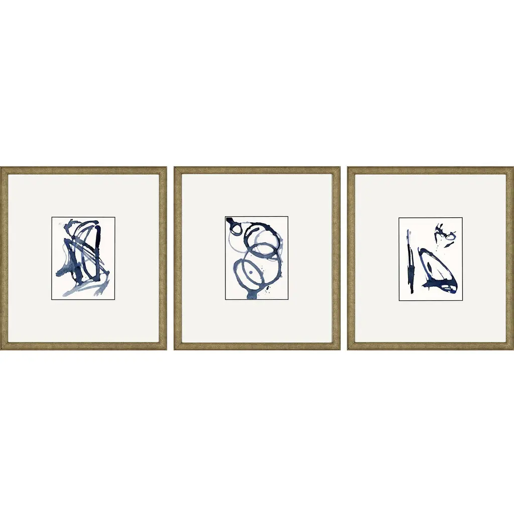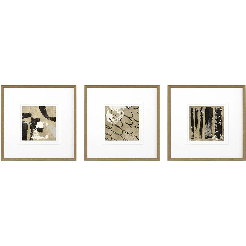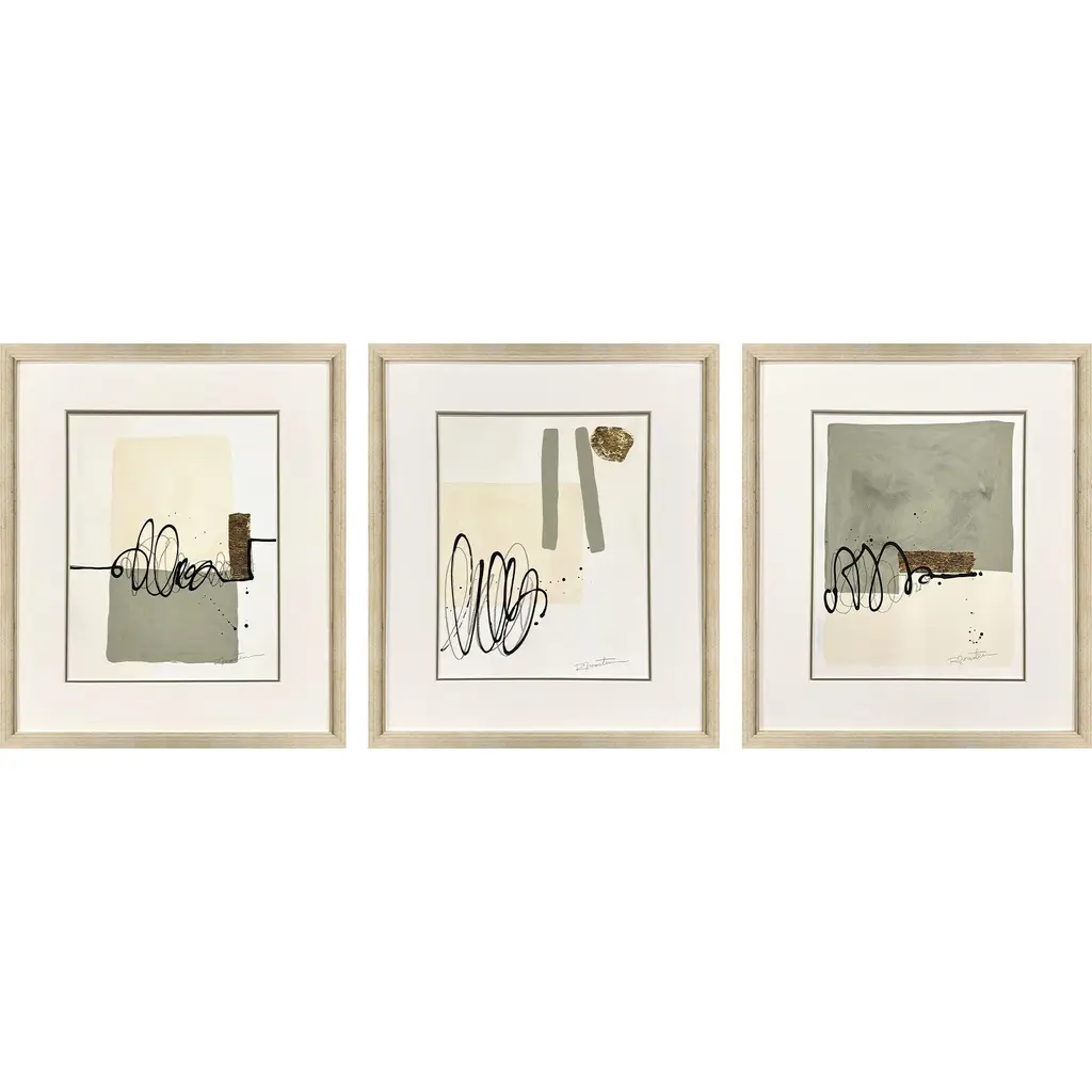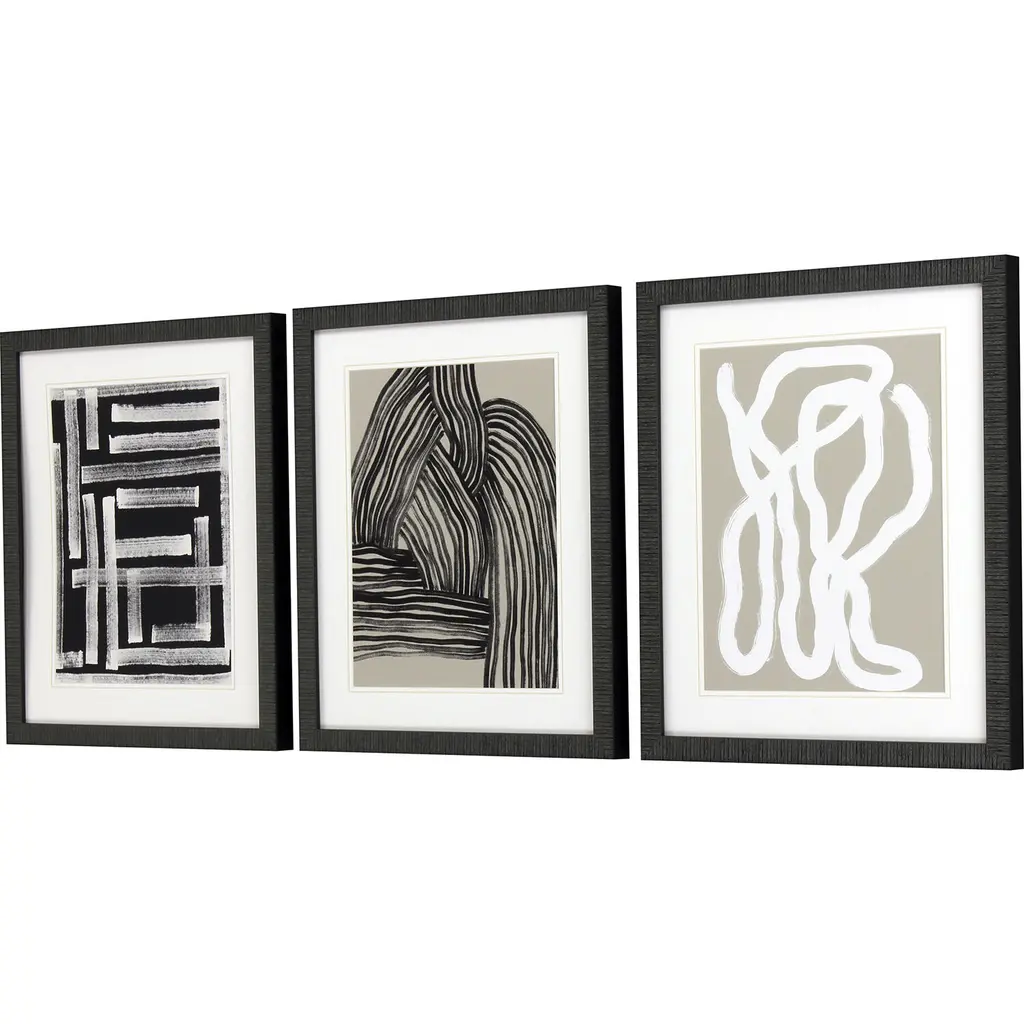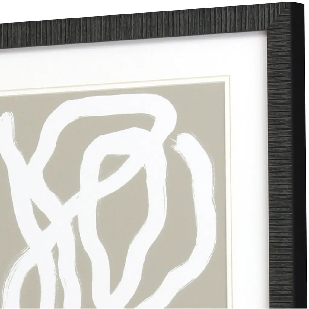 An abstract series features twirling lines in geometric shapes. Matted in white and framed in a distressed black finish moulding with gray wash.