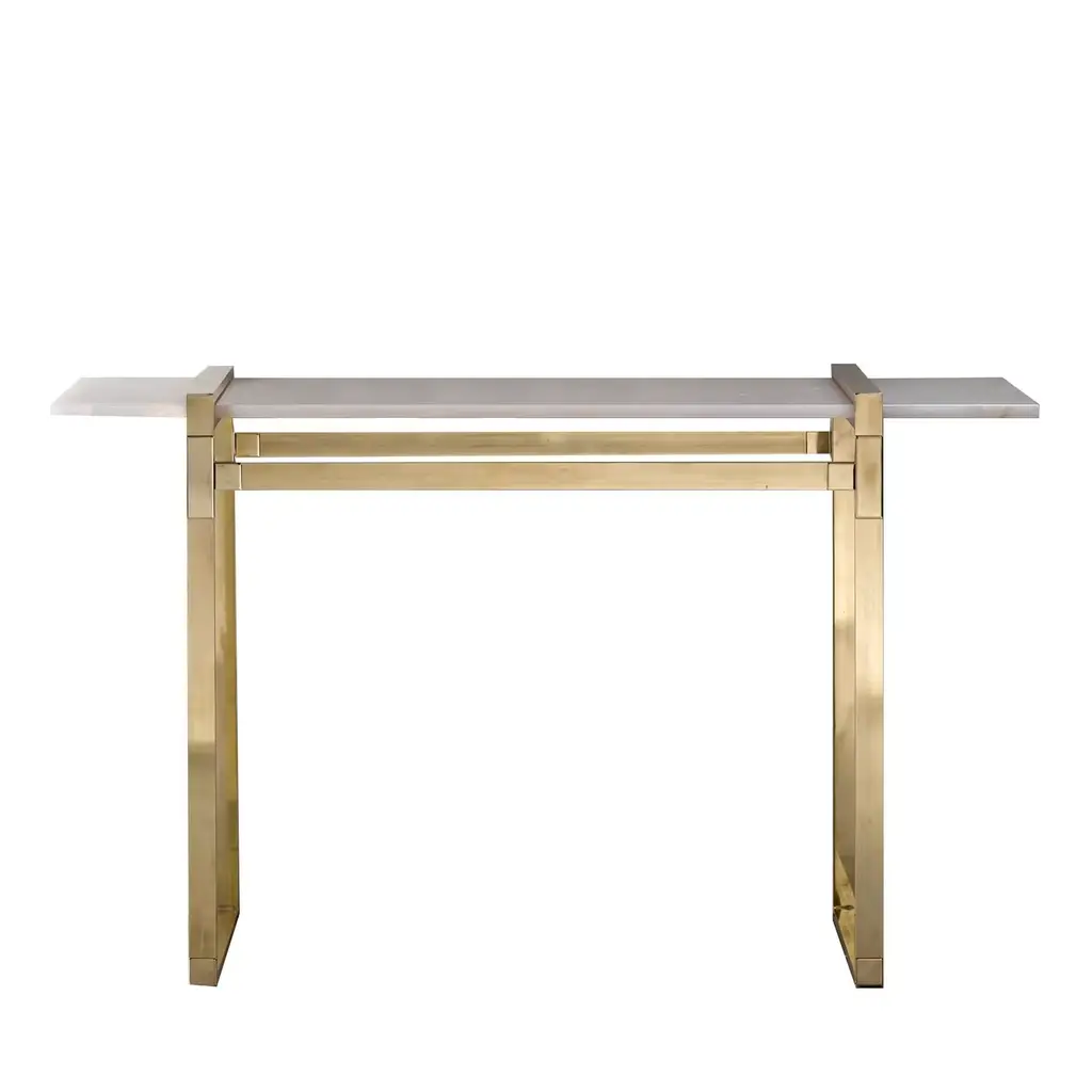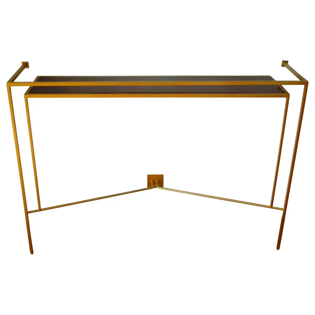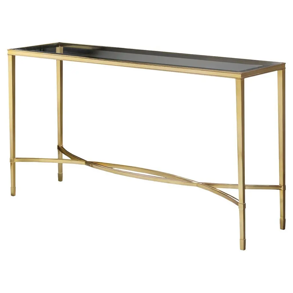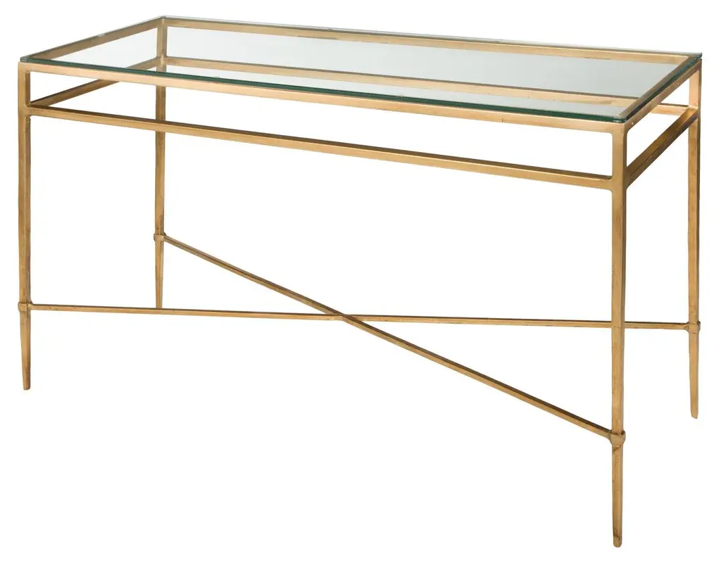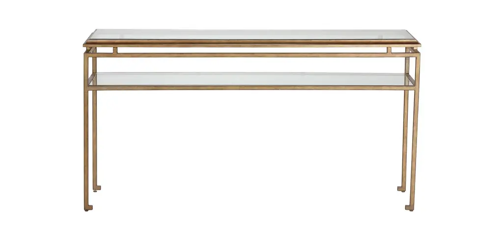 Our expansive console table gets its luxe look from a sleek iron frame finished in luminous gold lacquer. Topped with a tempered glass surface, the Nala's clean, modern design lends an elevated edge to the foyer or living room.