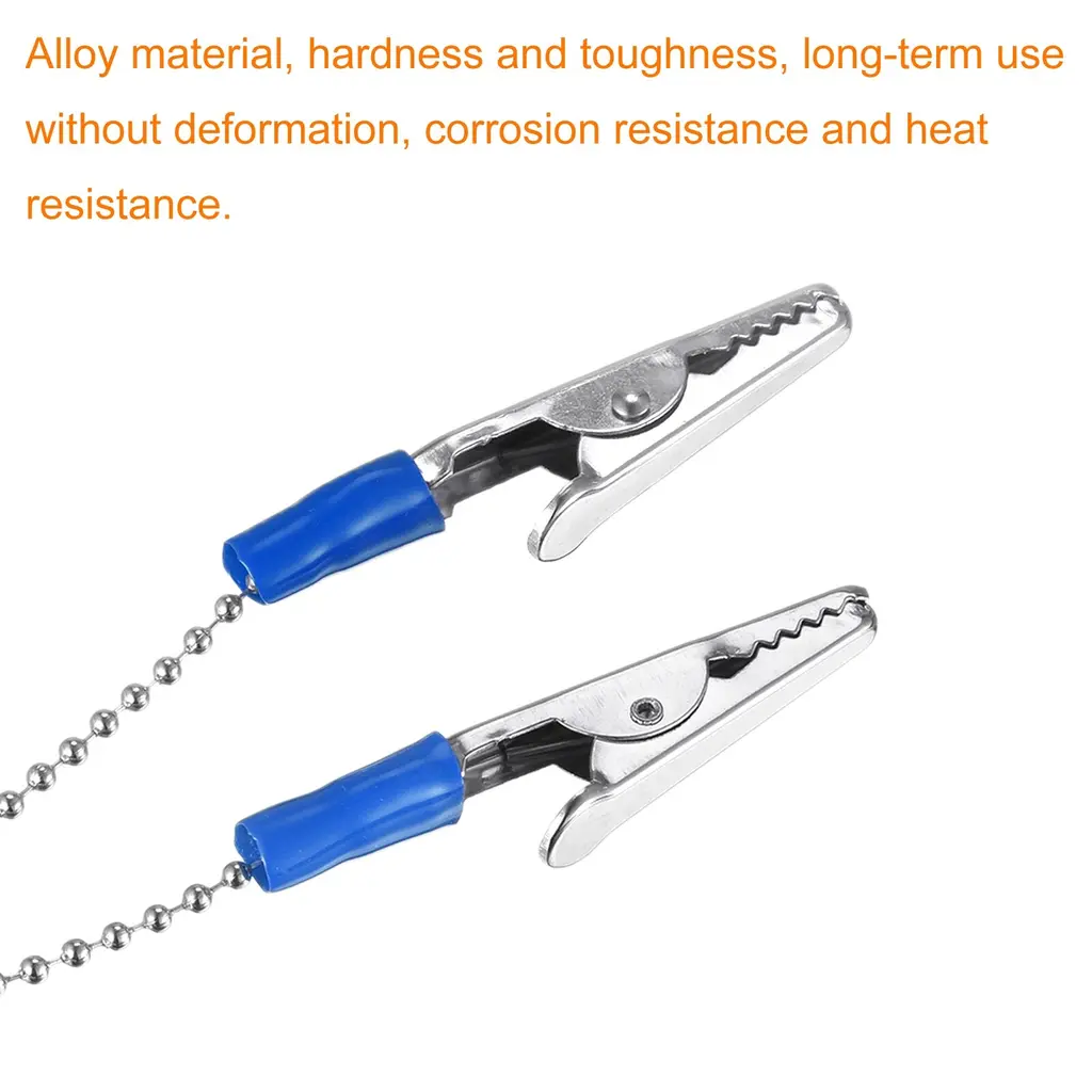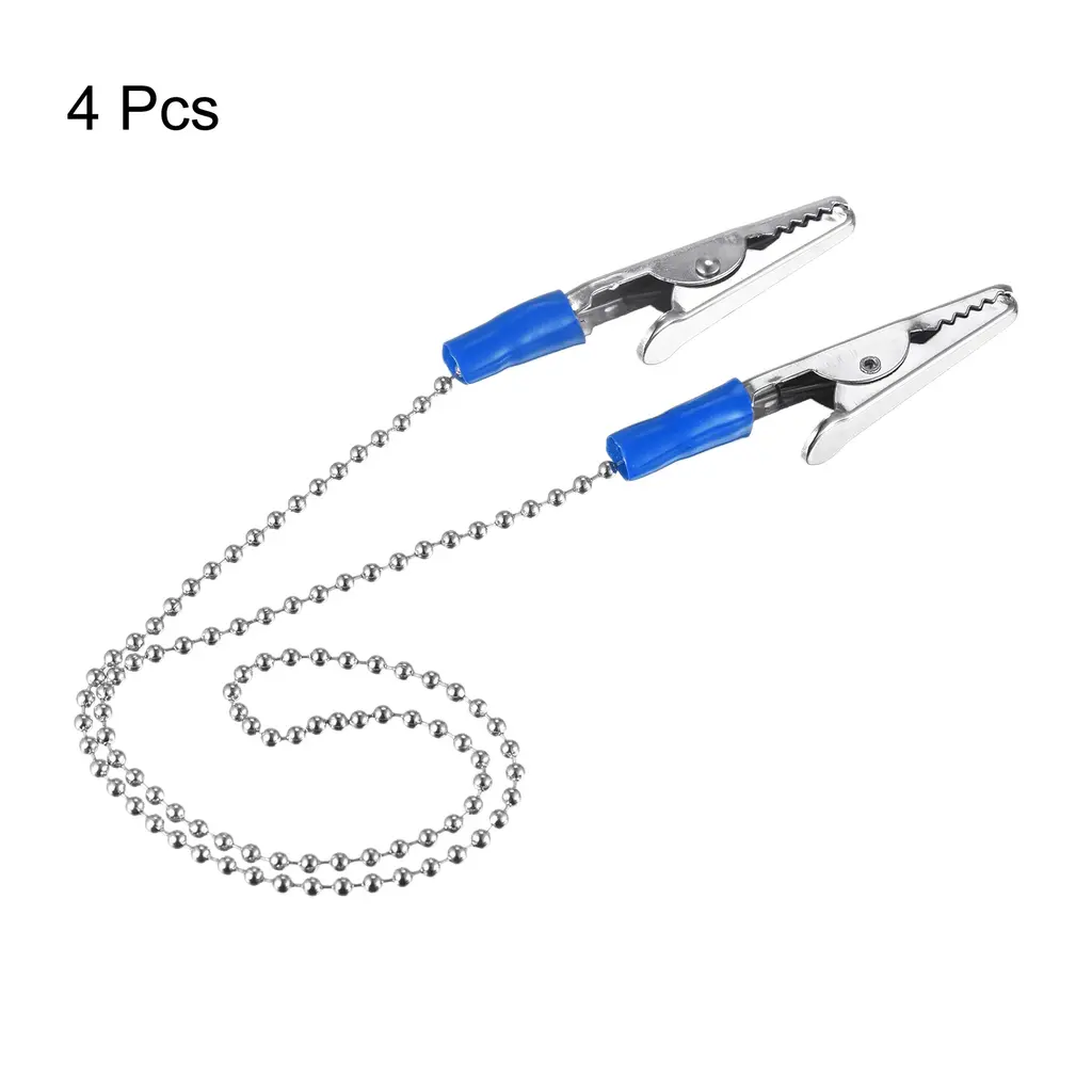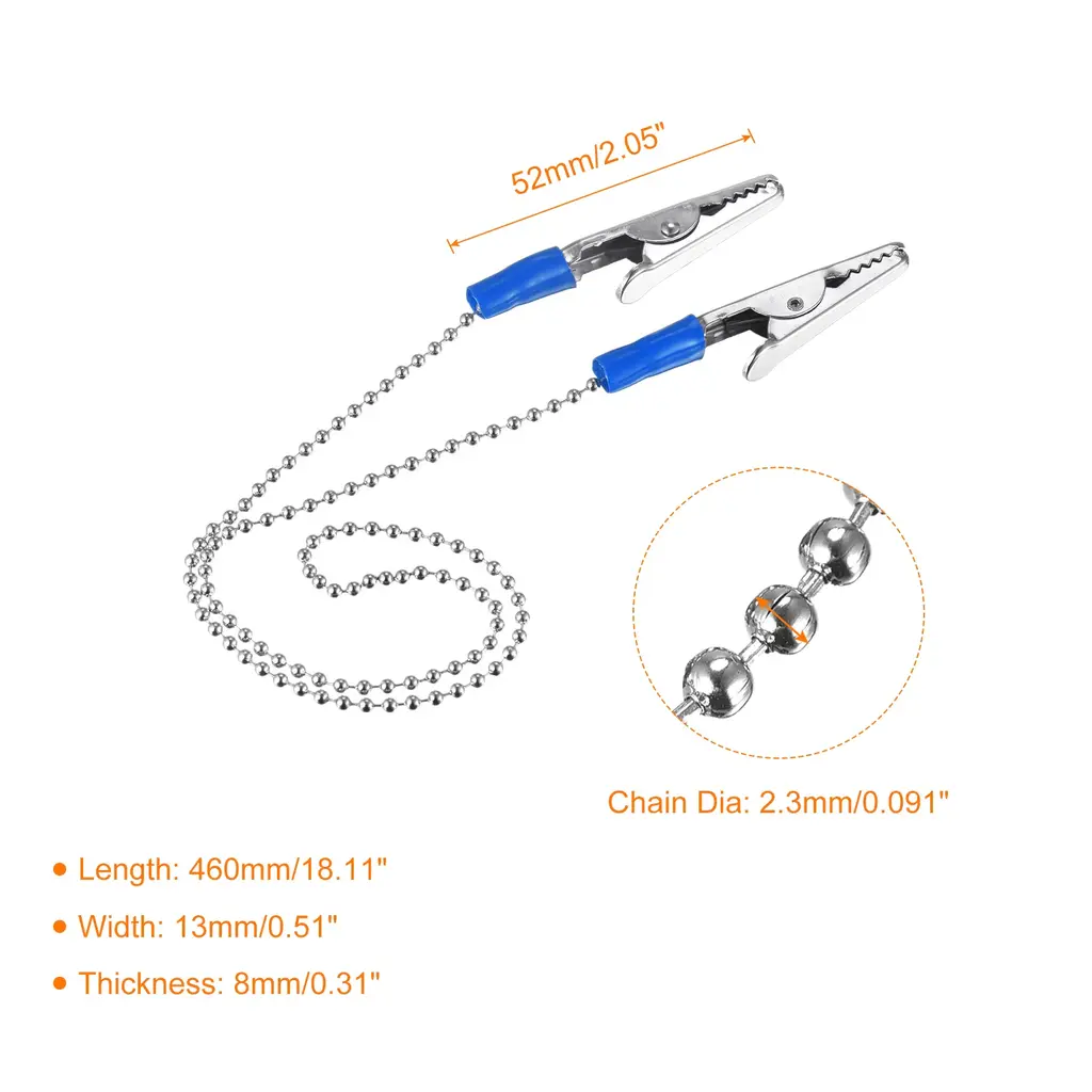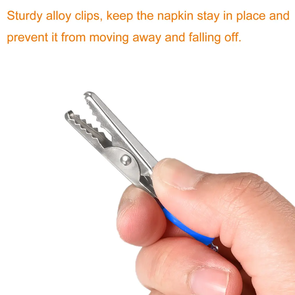 Descriptions:Made of alloy material that is hardness and toughness. It has excellent properties such as long-term use without deformation, corrosion resistance, heat resistance.The bib holder chain provides fixed and windproof functions that keep the napkin stay in place and prevent it from moving away and falling off. The portable design helps you enjoy meal and workouts without dirt your clothes and affecting your movement.This strap includes two sturdy alloy clips. You can easily clamp both sides of the clip onto a napkin or hats.Widely used to fasten the napkin around the neck when people of any age on birthdays, weddings, Valentine's Day, and Christmas at home or outside restaurants. Also, it can be used as a hat or cap lanyard to secure in sports or any action, such as sun hats, cowboy hats, baseball caps, flat caps, etc.Product Specifications:Material: AlloyColor: Blue, Silver ToneTotal Size: 460mm x 13mm x 8mm/18.11" x 0.51" x 0.31"(L*W*T)Clip Length: 52mm/2.05"Chain Dia: 2.3mm/0.091"Package Included:4/5/6 Pcs x Napkin Holder Chains
