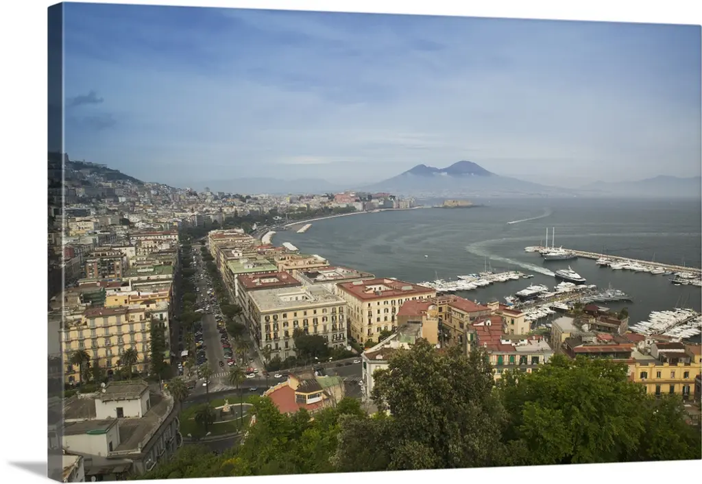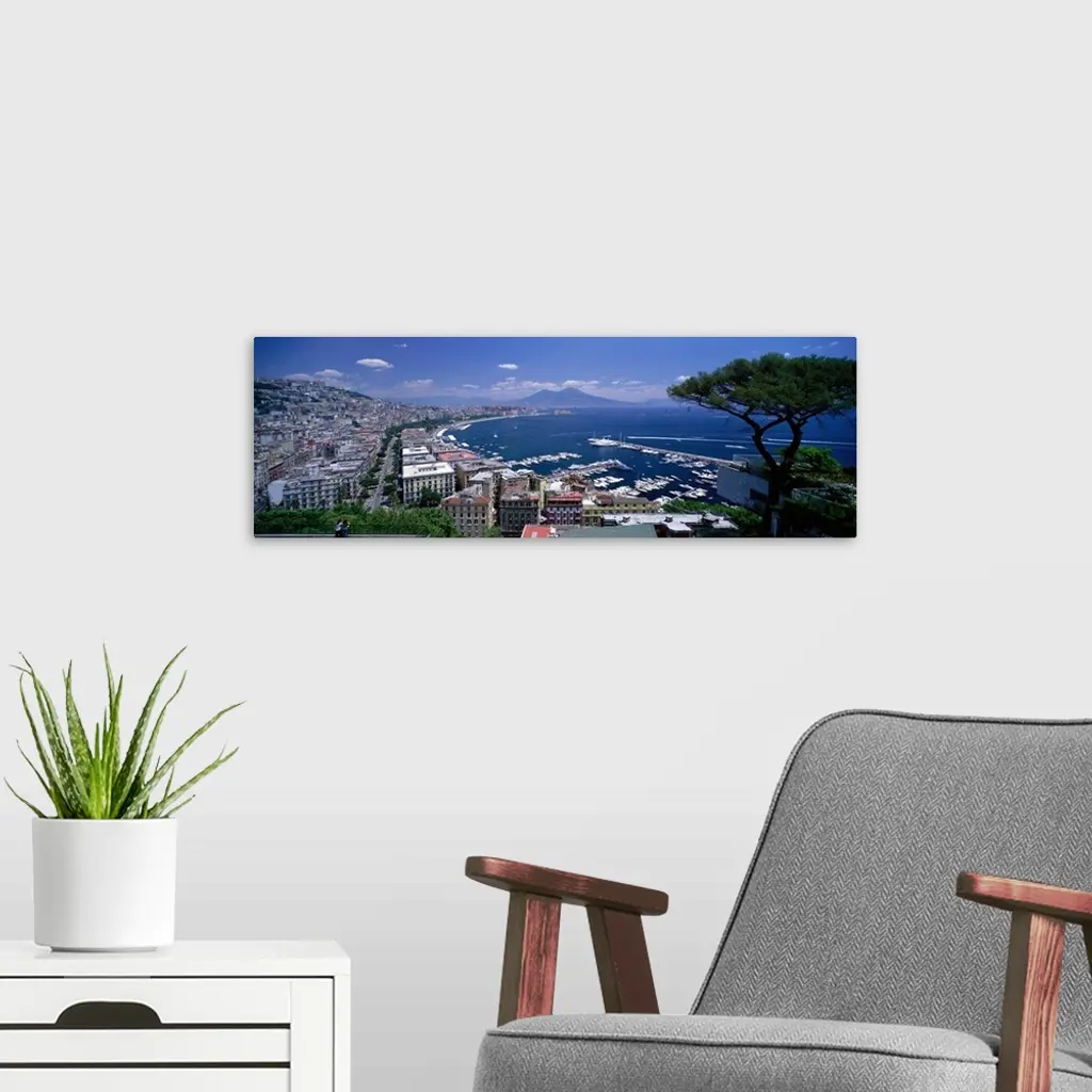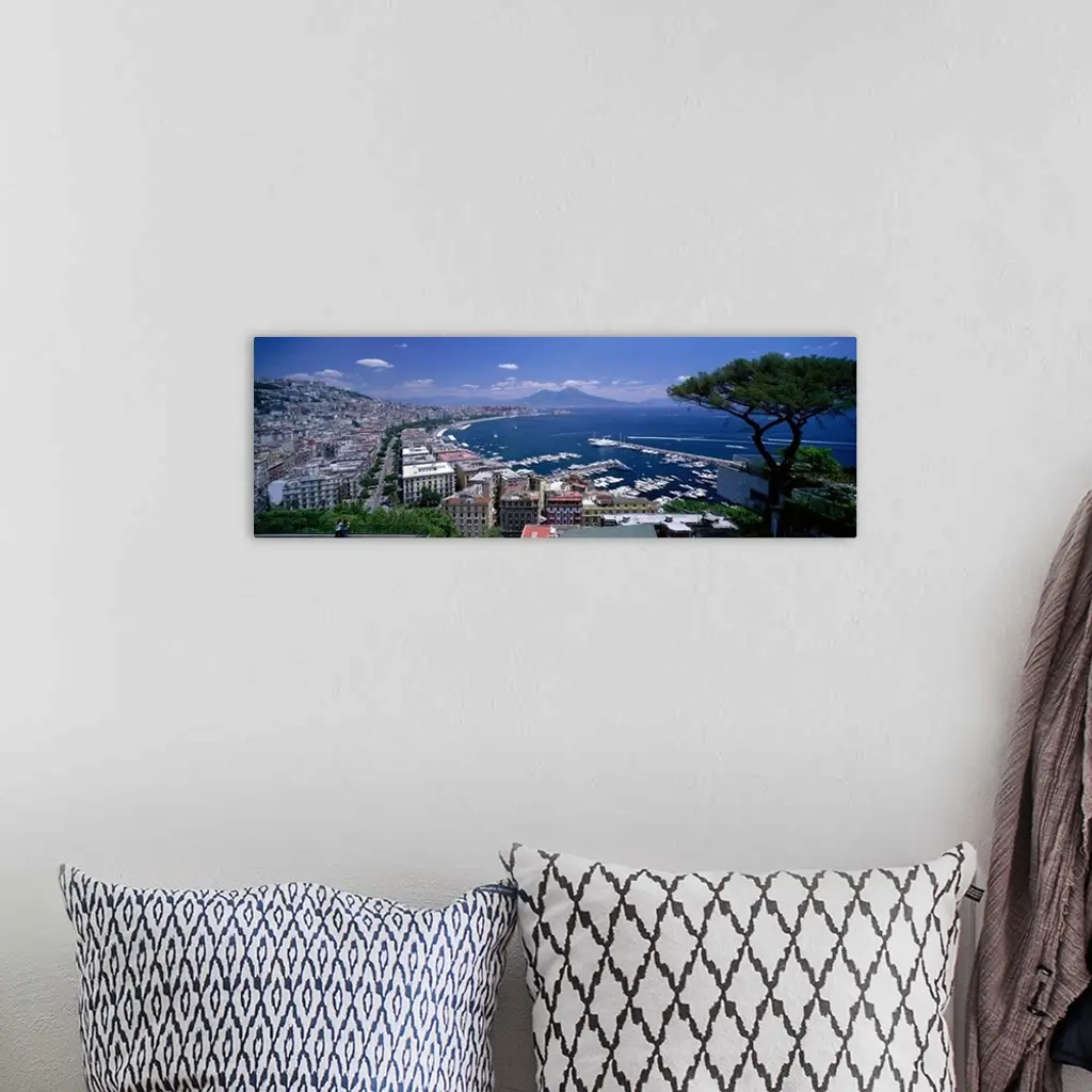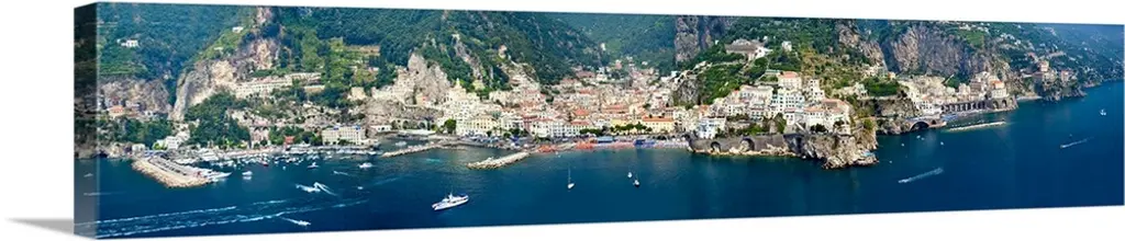 A high angle panoramic photograph of buildings and homes that reach far back and curve around a body of water where boats are docked.