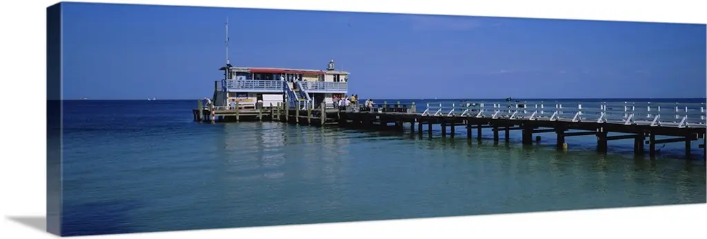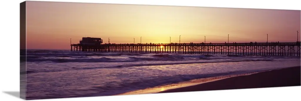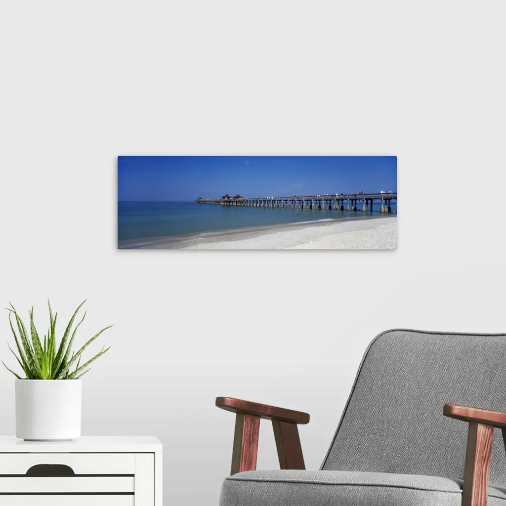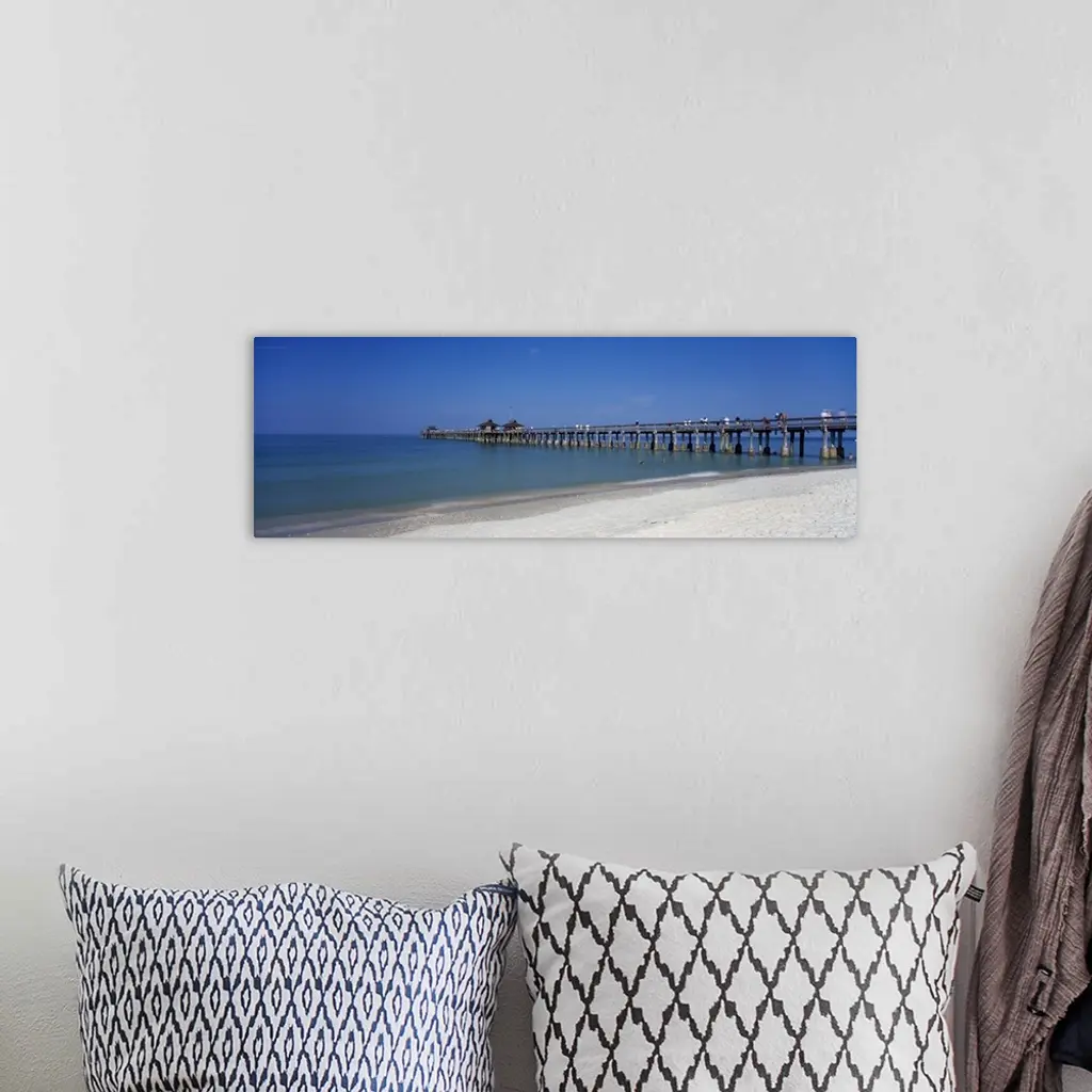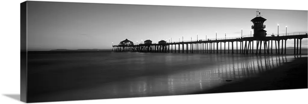 This wall art is a panoramic photograph of a beach board walk extending into the ocean.