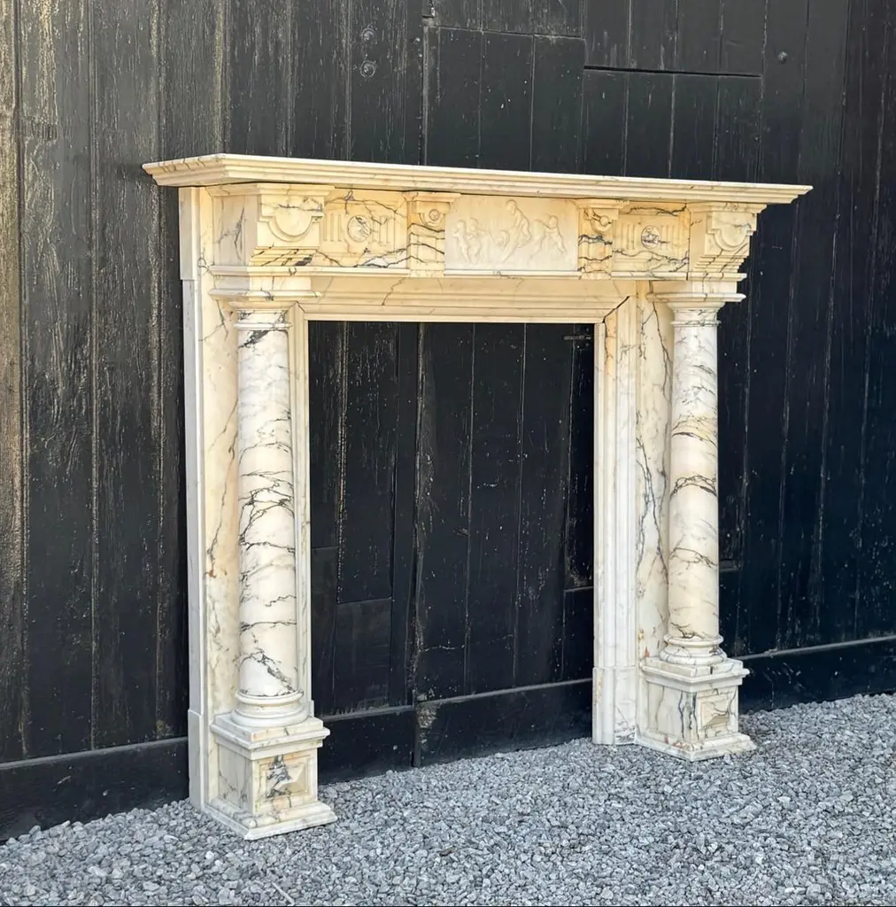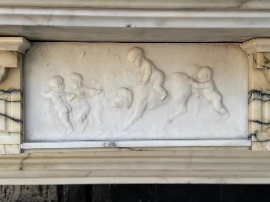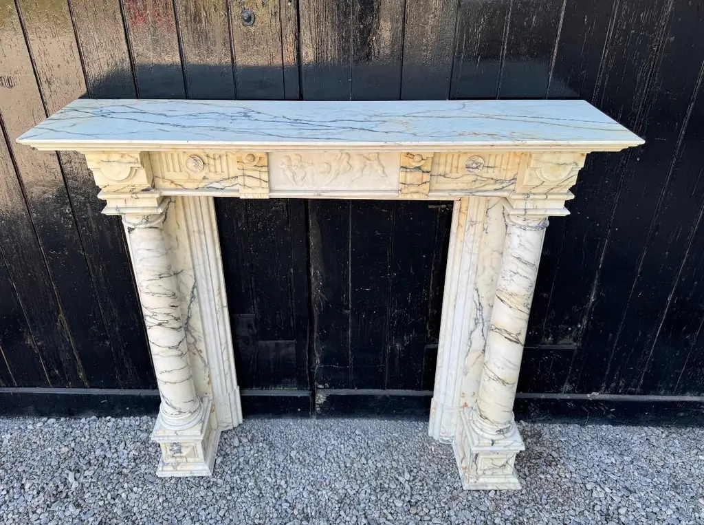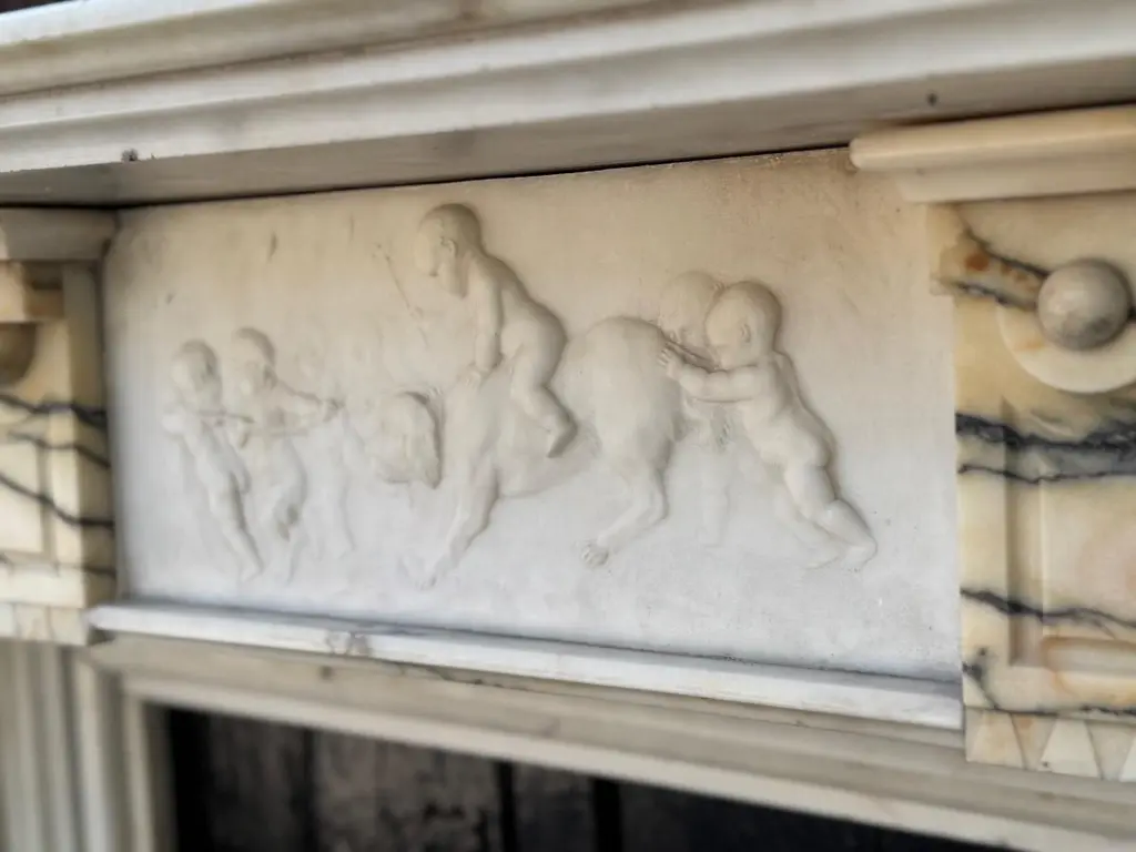 Napoleon III mantel in Paonazzo marble, Cartouche in Statuary White Marble circa 1880Napoleon III mantel in Paonazzo marble, statuary white marble cartouche, putty playing with a dog, circa 1880dimensions of hearth: 103.5 x 78cm
