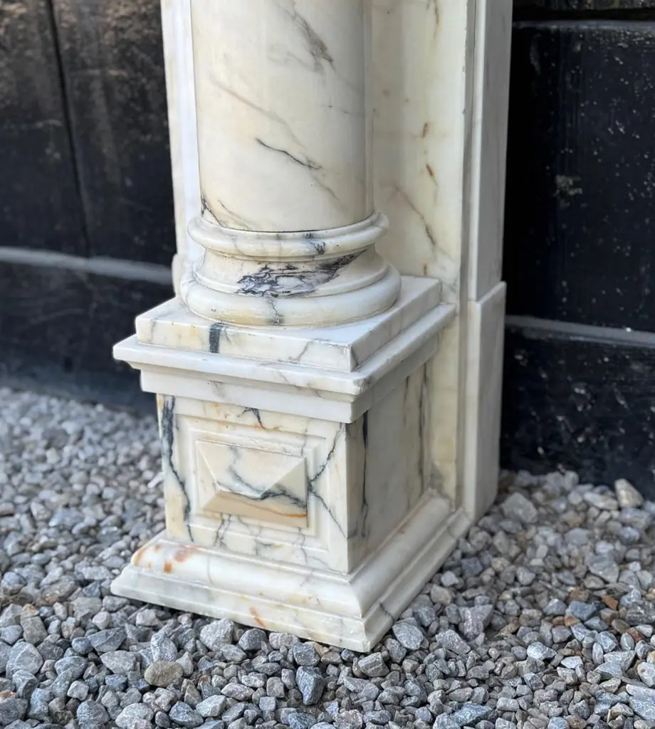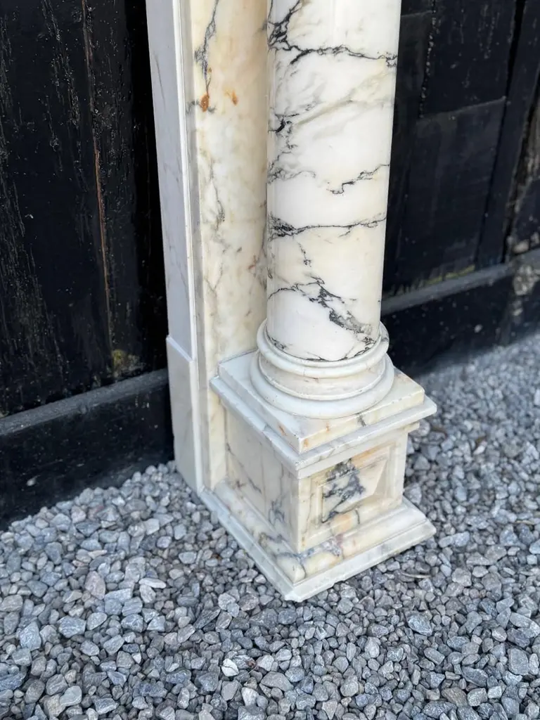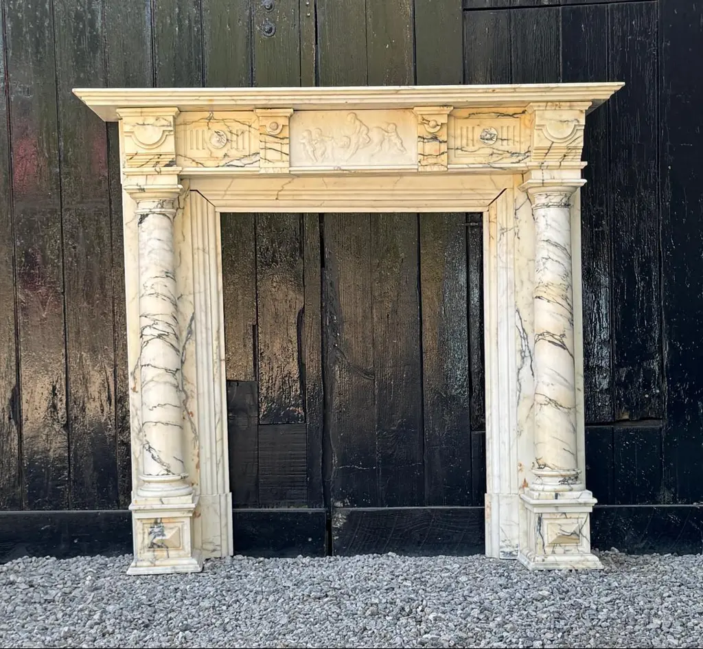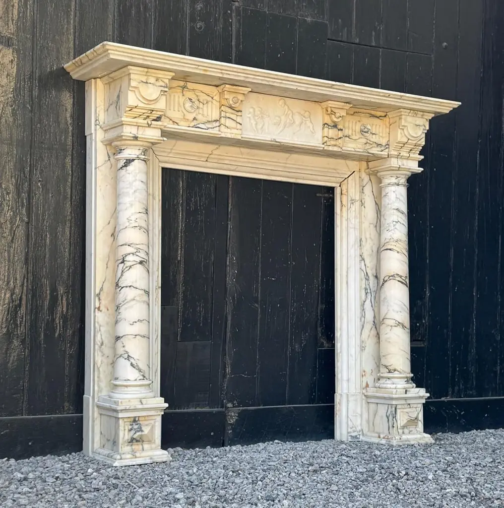 Napoleon III mantel in Paonazzo marble, Cartouche in Statuary White Marble circa 1880Napoleon III mantel in Paonazzo marble, statuary white marble cartouche, putty playing with a dog, circa 1880dimensions of hearth: 103.5 x 78cm