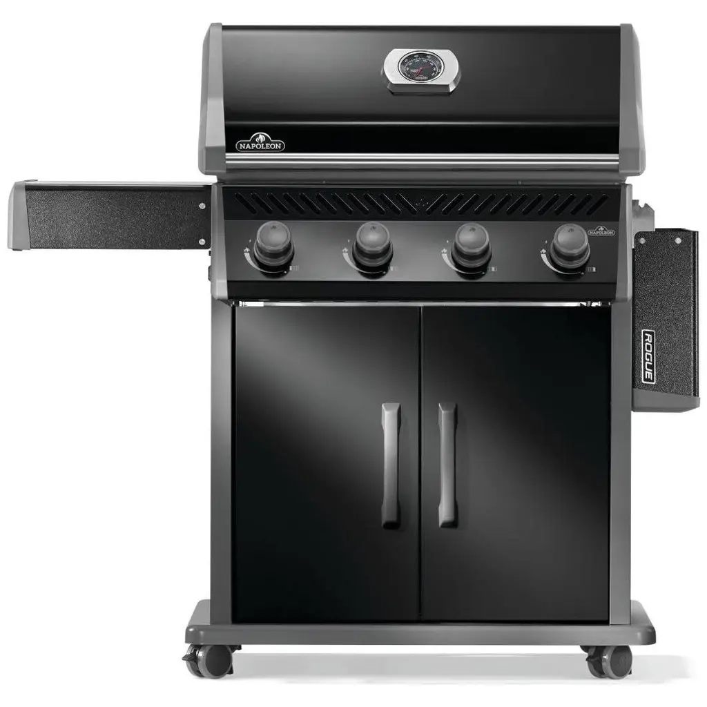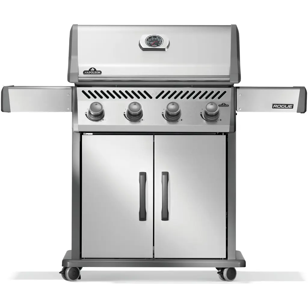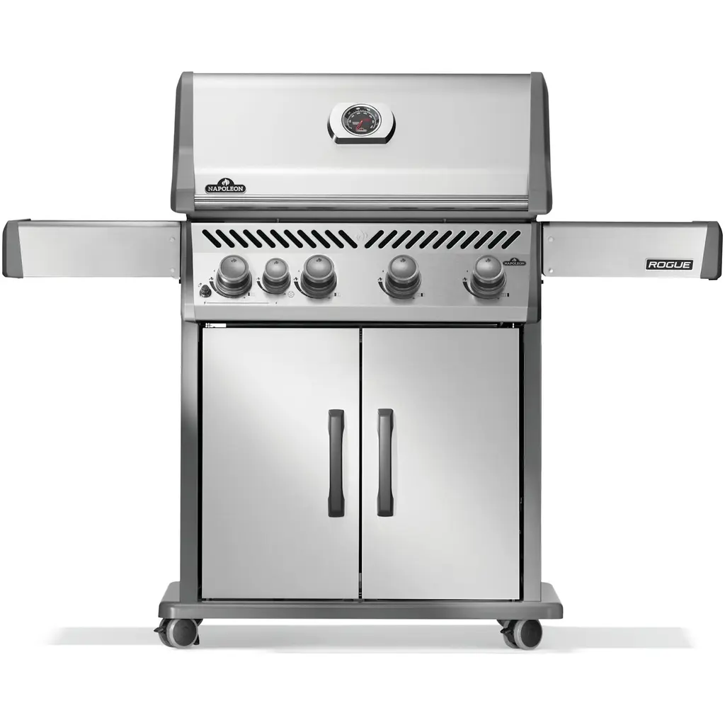 The sleek Napoleon Rogue® 525 Natural Gas Grill is a stylish upgrade for your outdoor living space. Achieve the best sear marks with their Wave cast iron grids. Four stainless steel burners ensure precise temperature control, while dual-level sear plates intensify flavors by vaporizing drippings. With ample cooking space, create mouthwatering meals for any occasion. The easy to maintain porcelainized lid and powder-coated body seamlessly blend with your outdoor decor. Maneuver with ease using locking casters and save space with folding stainless steel side shelves. Experience unmatched versatility, quality, and affordability with this Napoleon Rogue® Gas Grill.Features:Product Technologies:Specifications: