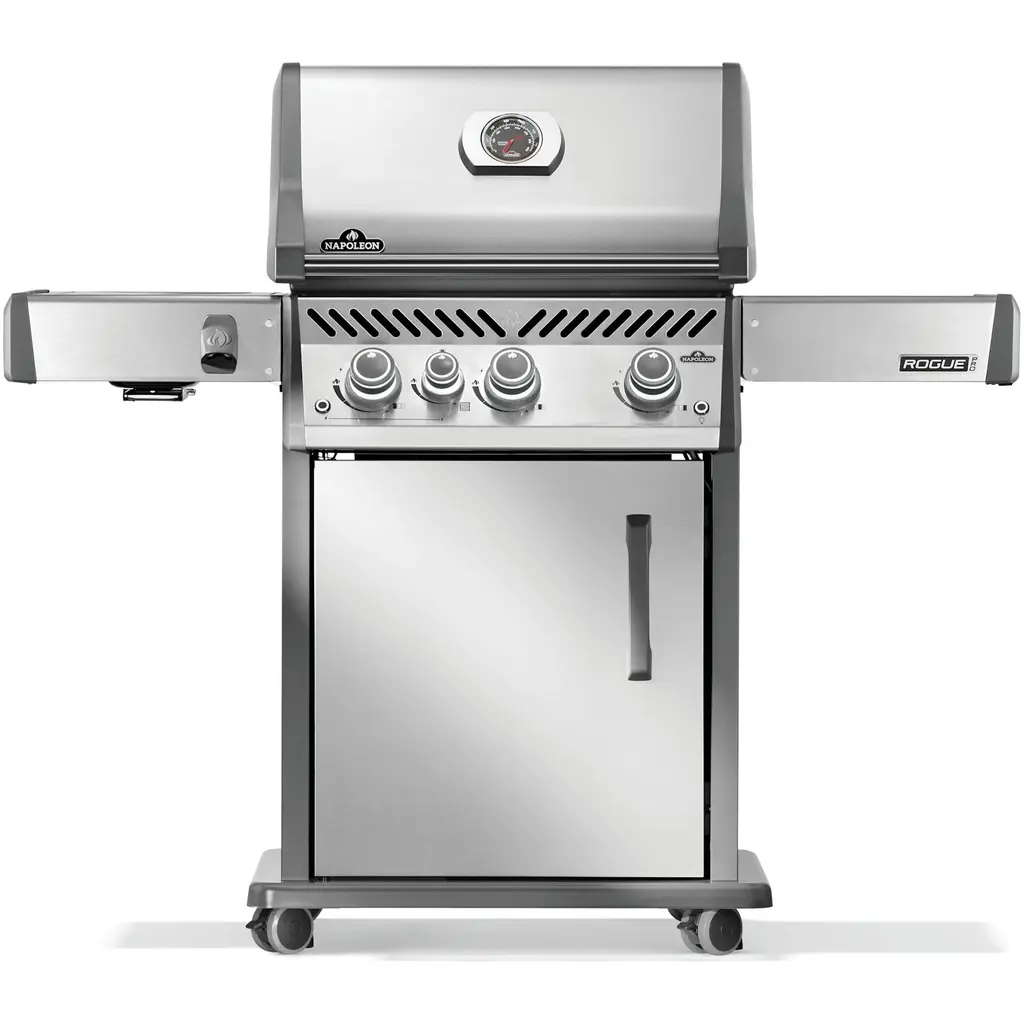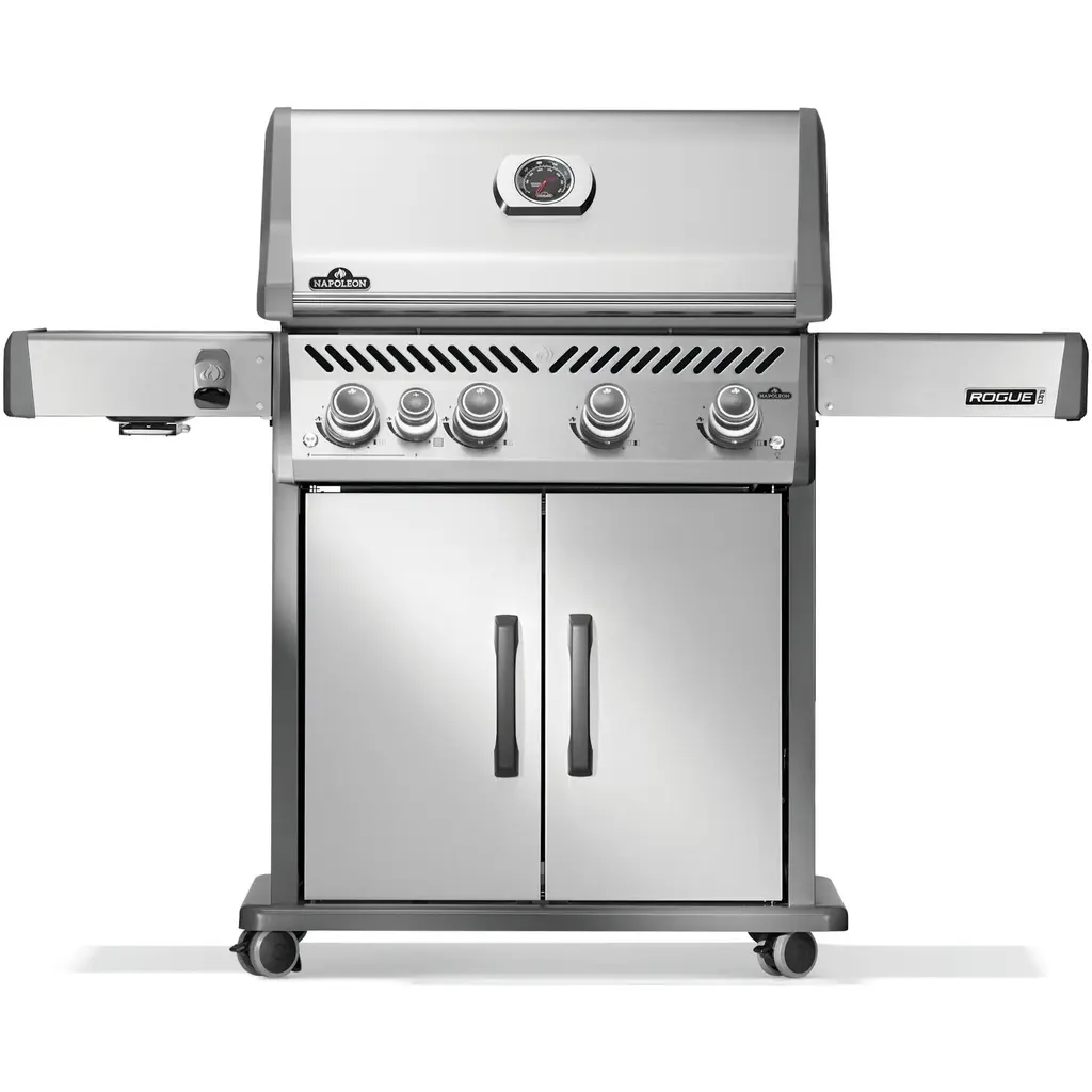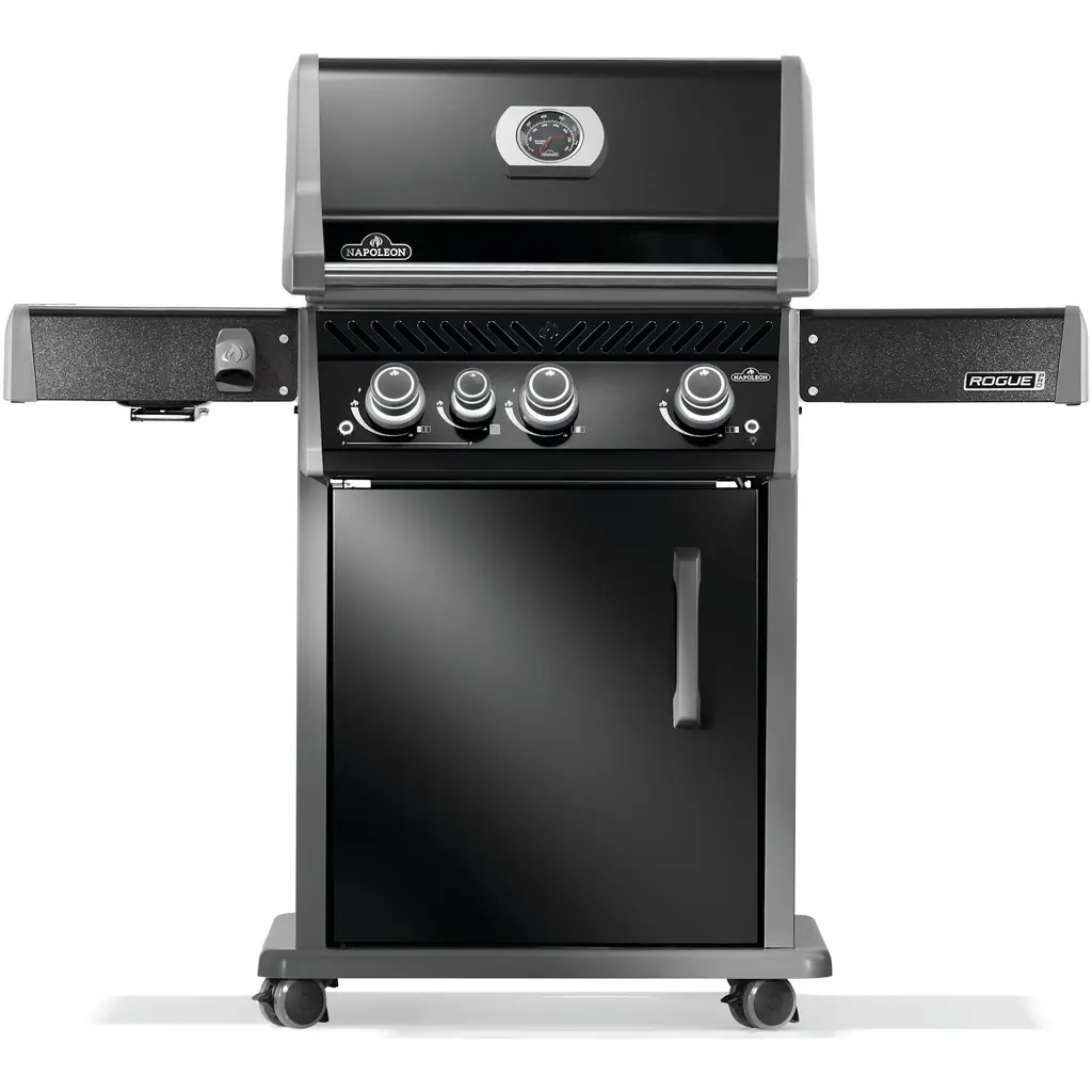 The sleek Napoleon Rogue® 525 Natural Gas Grill is a stylish upgrade for your outdoor living space. Achieve the best sear marks with their Wave cast iron grids. Four stainless steel burners ensure precise temperature control, while dual-level sear plates intensify flavors by vaporizing drippings. With ample cooking space, create mouthwatering meals for any occasion. The easy to maintain porcelainized lid and powder-coated body seamlessly blend with your outdoor decor. Maneuver with ease using locking casters and save space with folding stainless steel side shelves. Experience unmatched versatility, quality, and affordability with this Napoleon Rogue® Gas Grill.Features:Product Technologies:Specifications: