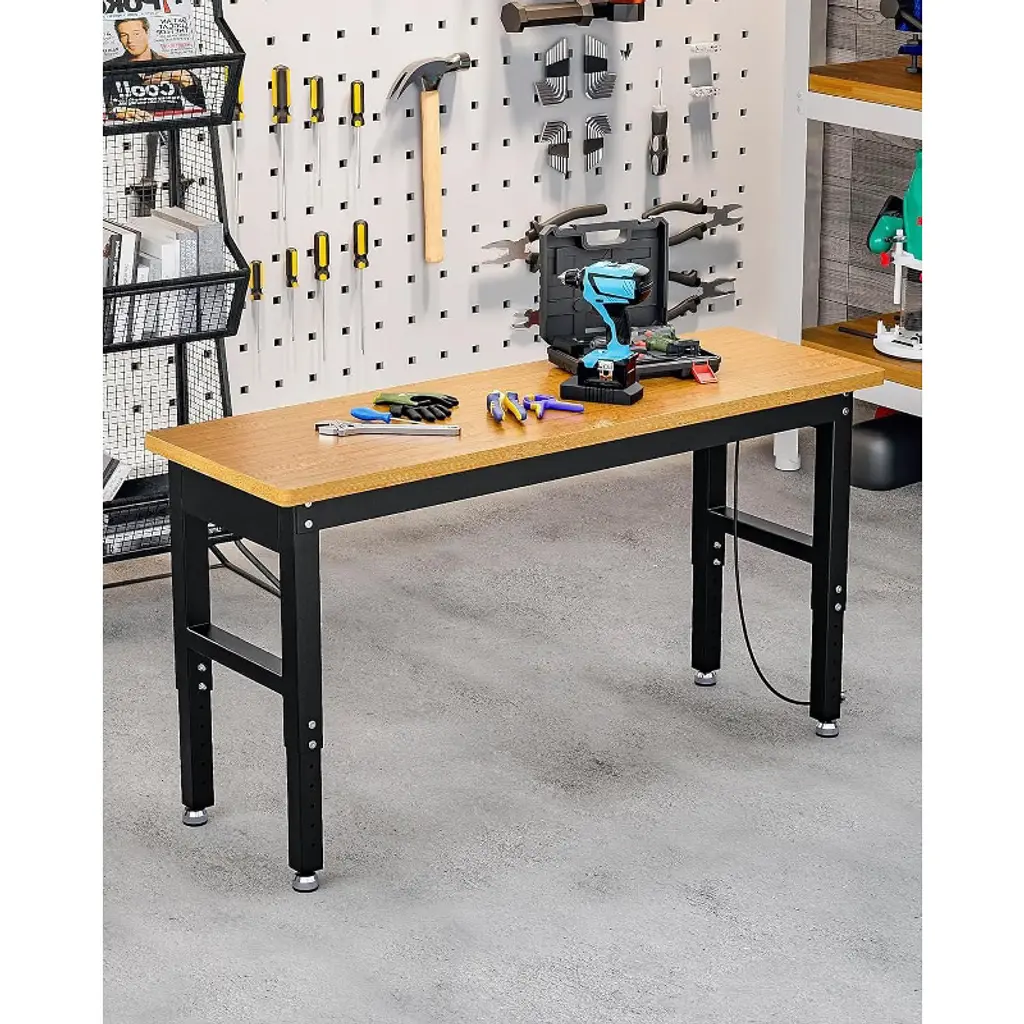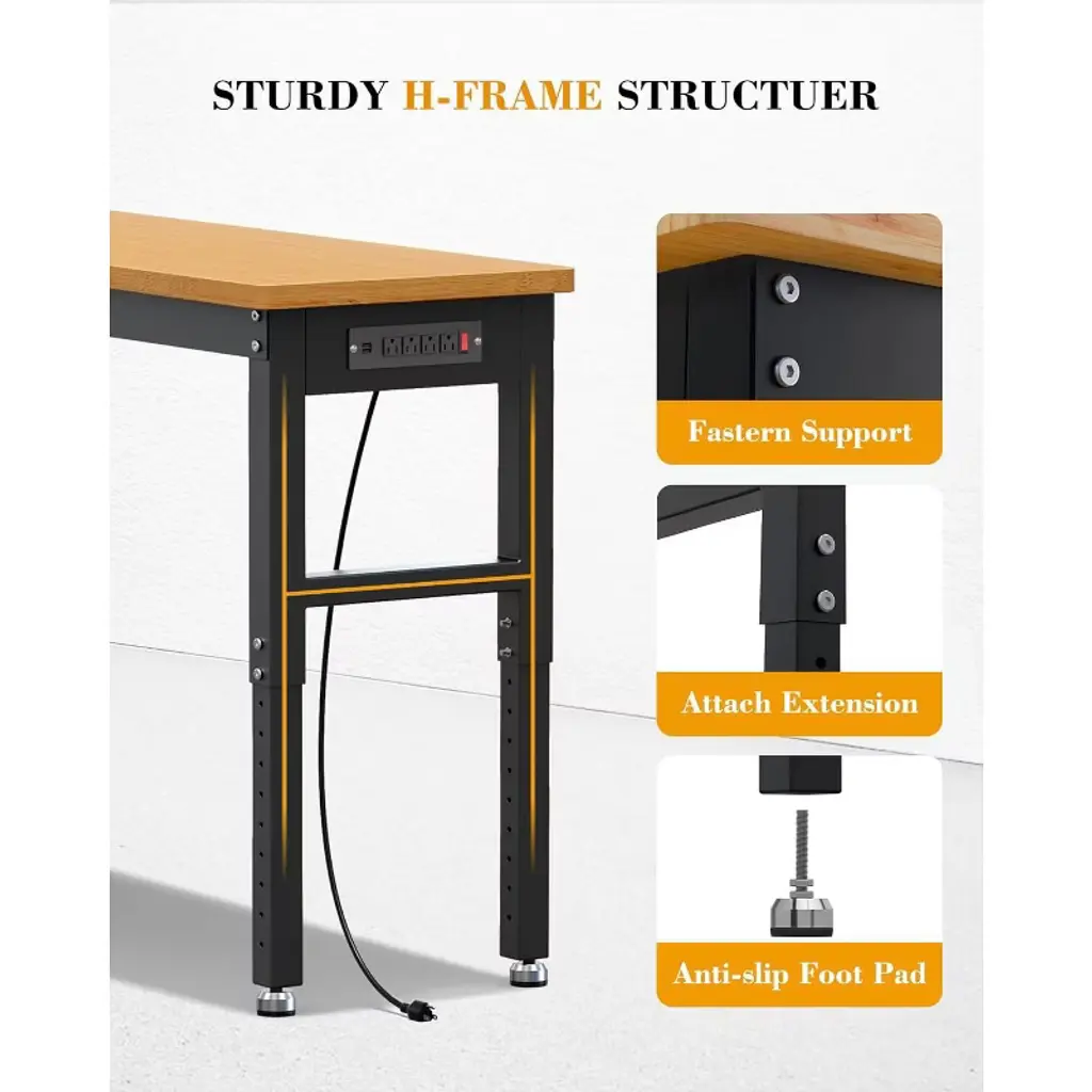 This professional-grade 60" x 20" workbench features an ultra-sturdy H-frame steel construction supporting 2200 lbs, with your choice of mobile wheels or stabilizing base. The premium bamboo top offers a durable, lacquered work surface while the tool-free height adjustment (27.6"-42.1") enables ergonomic sitting/standing positions. Integrated power includes 4 grounded outlets and 2 USB ports with 5' power switch for tools/lighting. Non-slip foot pads ensure stability on uneven floors. Ideal for garages, workshops, or commercial spaces - combines industrial strength with modern functionality in a versatile workstation solution.