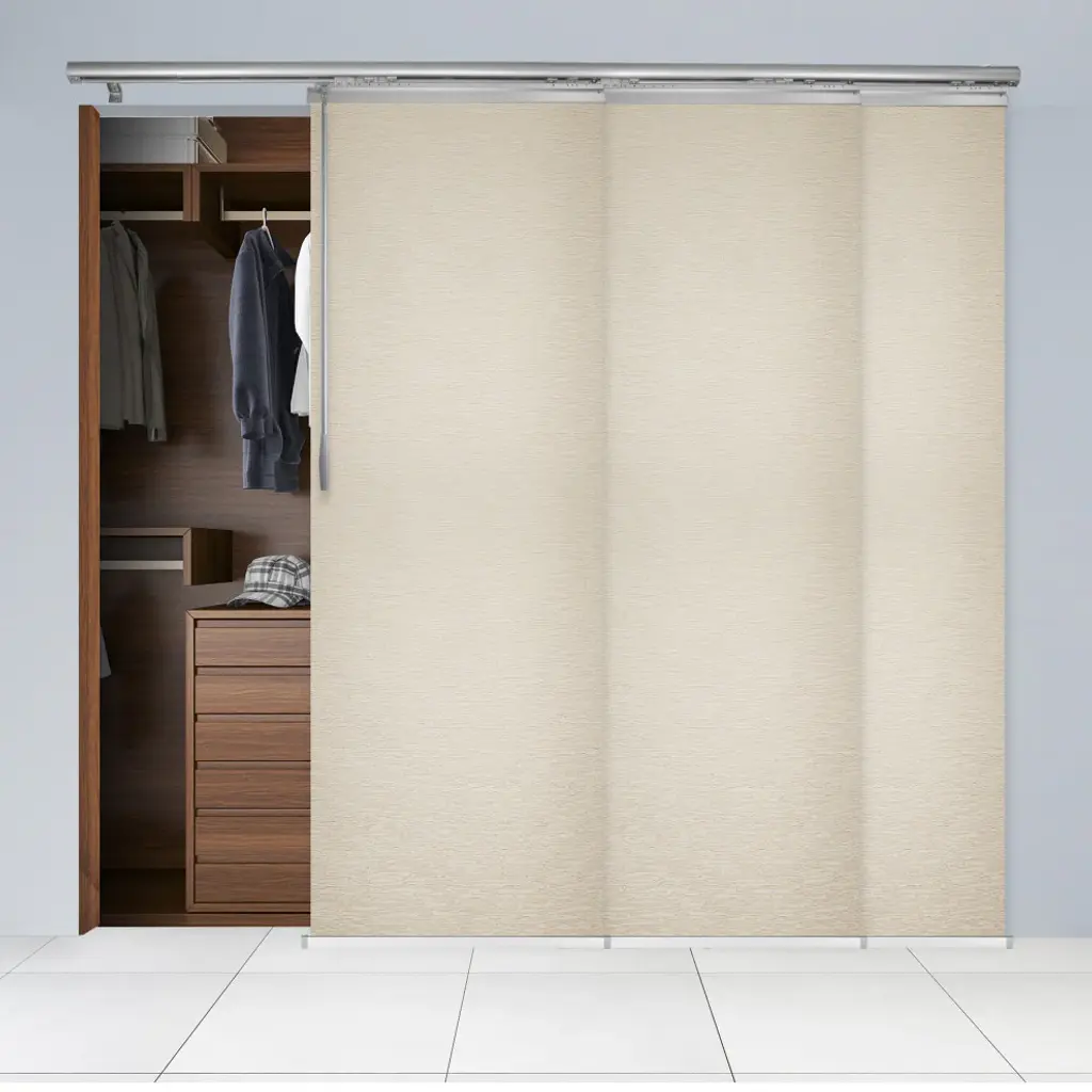 Central Design Products is pleased to introduce a new innovative panel track that offers easy 2-way installation, adding an alluring style and refined touch to your home decor. The single rail design of the track is sleek, compact, and reduces the overall footprint and weight of the installation, eliminating bulky, intrusive window treatments. Adjusting the panel height is a breeze � simply trim the panel, re-attach the liner, and install the panel weight. Detailed instructions are included.The panel track also features a patented slider design, made with aluminum and fitted with bearings that allow for durable and smooth operation. The sliders are stacked closer together than conventional panel tracks, reducing light bleed coming from the gaps between panels. This track has endless uses from dividing rooms, garages, offices, and closets to decorating windows and patios. Available in larger sizes including 8, 10, and 12 panels. Extends from 36-66� wide. Each panel measures 23.5" wide and 91.5" tall, with a total installation height of 94" (includes the 2.5" rail track). The track can be wall or ceiling mounted. The panels can stack on the left or the right. The clearance from the wall is extendable from 1.25� to 3.25� and projection from the wall is extendable from 3� to 4.25�. Natalia panel is made from 70% Polyester 30% Acrylic, with a blackout shade.