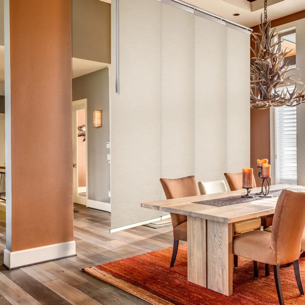 Central Design Products is pleased to introduce a new innovative panel track that offers easy 2-way installation, adding an alluring style and refined touch to your home decor. The single rail design of the track is sleek, compact, and reduces the overall footprint and weight of the installation, eliminating bulky, intrusive window treatments. Adjusting the panel height is a breeze � simply trim the panel, re-attach the liner, and install the panel weight. Detailed instructions are included.The panel track also features a patented slider design, made with aluminum and fitted with bearings that allow for durable and smooth operation. The sliders are stacked closer together than conventional panel tracks, reducing light bleed coming from the gaps between panels. This track has endless uses from dividing rooms, garages, offices, and closets to decorating windows and patios. Available in larger sizes including 8, 10, and 12 panels. Extends from 48-88� wide. Each panel measures 23.5" wide and 116" tall, with a total installation height of 118.5" (includes the 2.5" rail track). The track can be wall or ceiling mounted. The panels can stack on the left or the right. The clearance from the wall is extendable from 1.25� to 3.25� and projection from the wall is extendable from 3� to 4.25�. Natalia panel is made from 70% Polyester 30% Acrylic, with a blackout shade.