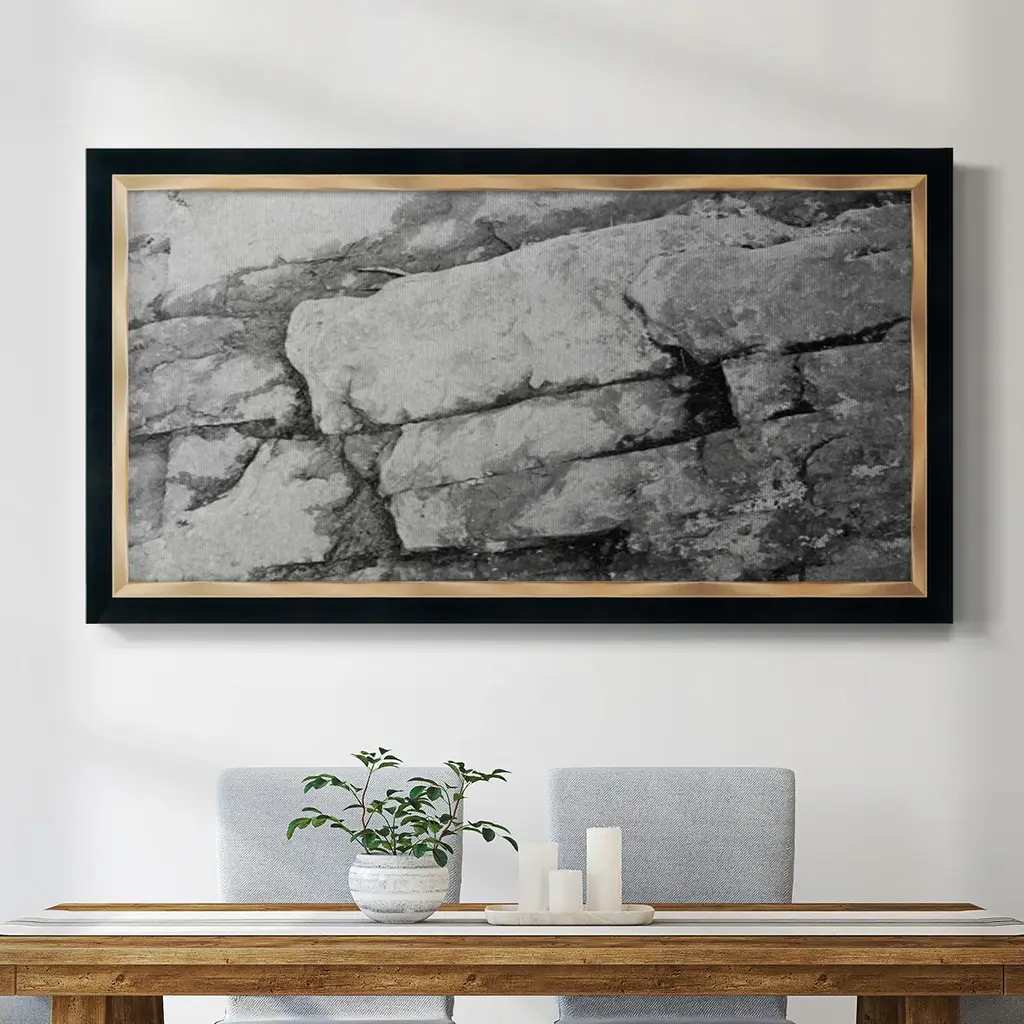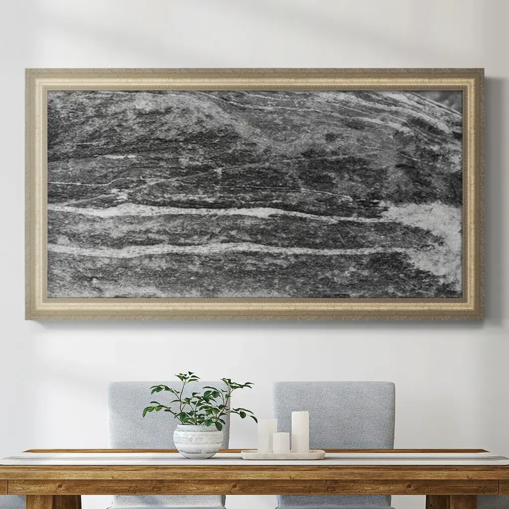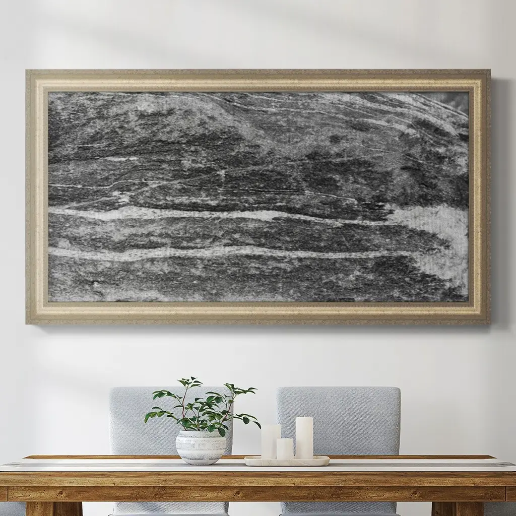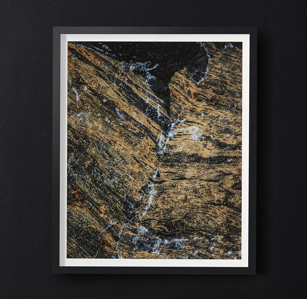 Obsidian is formed when molten lava cools rapidly, sometimes mixing with other materials in the process. Nathan DeHart creates abstracted geological studies of outcroppings where this mixture is at its most dramatic. The stone is striated with honey tones and flecked with white, rough outer textures contrasting with glassy black patches.