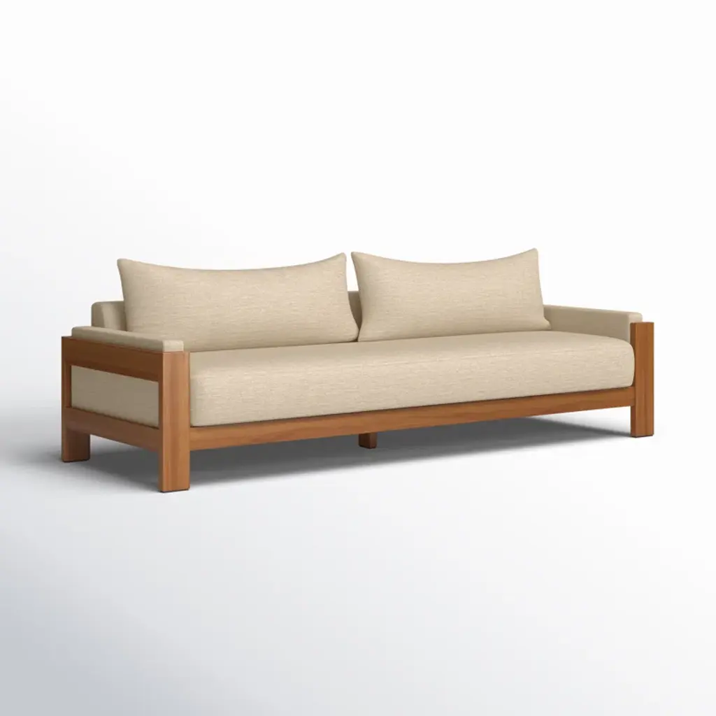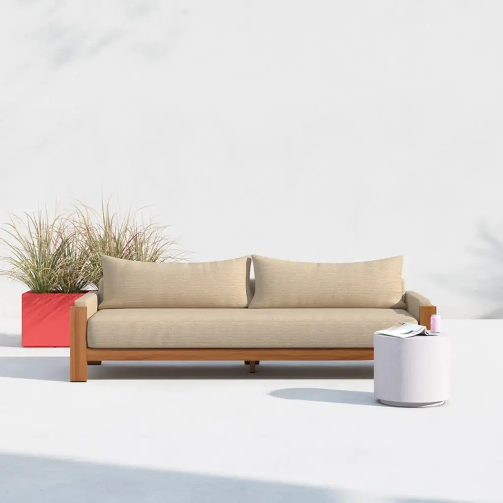 Framed by FSC®-certified teak with light, natural finish, wide proportions, and loose box cushioning offers effortless comfort designed for outdoor lounging. The neutral beige hue and minimalist form make this an easy piece to move between different styles and settings.