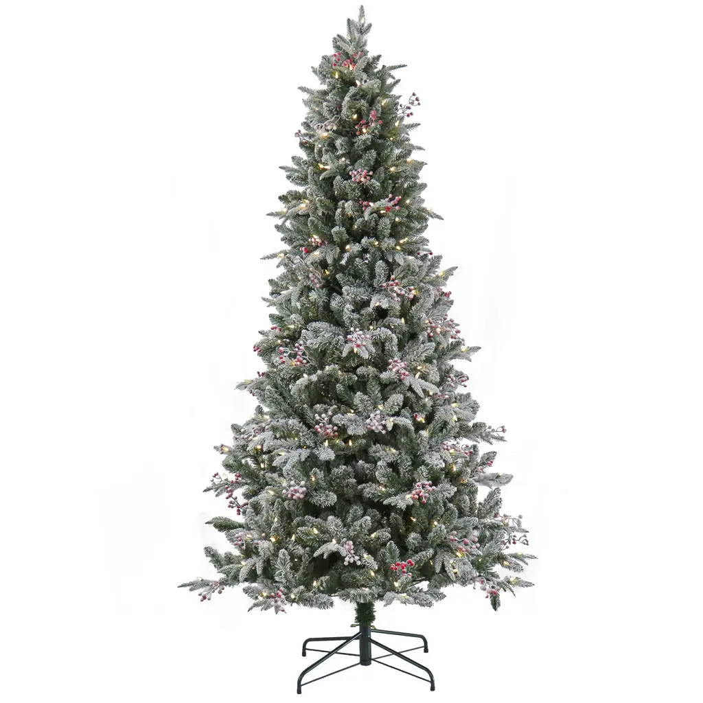 The Snowy Poechmann Fir tree features Feel Real® branch tip technology, creating a tree with remarkable realism. These crush-resistant branch tips are molded from real tree branches for an authentic living tree appearance. This tree is trimmed with red berries and dusted with the look of freshly fallen snow. It also offers a slim profile making it a great choice for display in corners or rooms with limited floor space. It is pre-strung with 400 warm white LED lights that are long lasting and energy efficient. This three-section tree is designed with hinged branches for ease of assembly. Sturdy folding metal tree stand is included.
