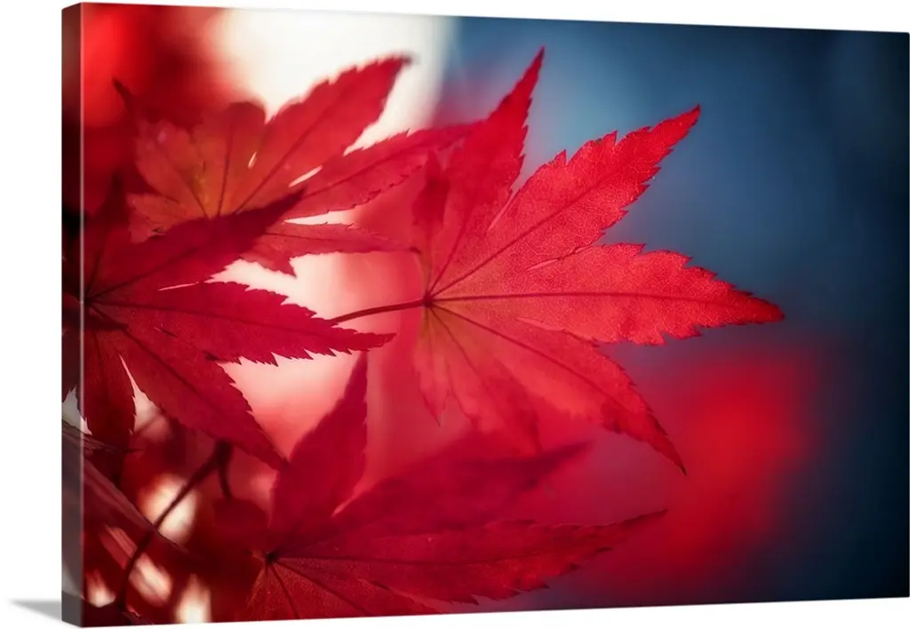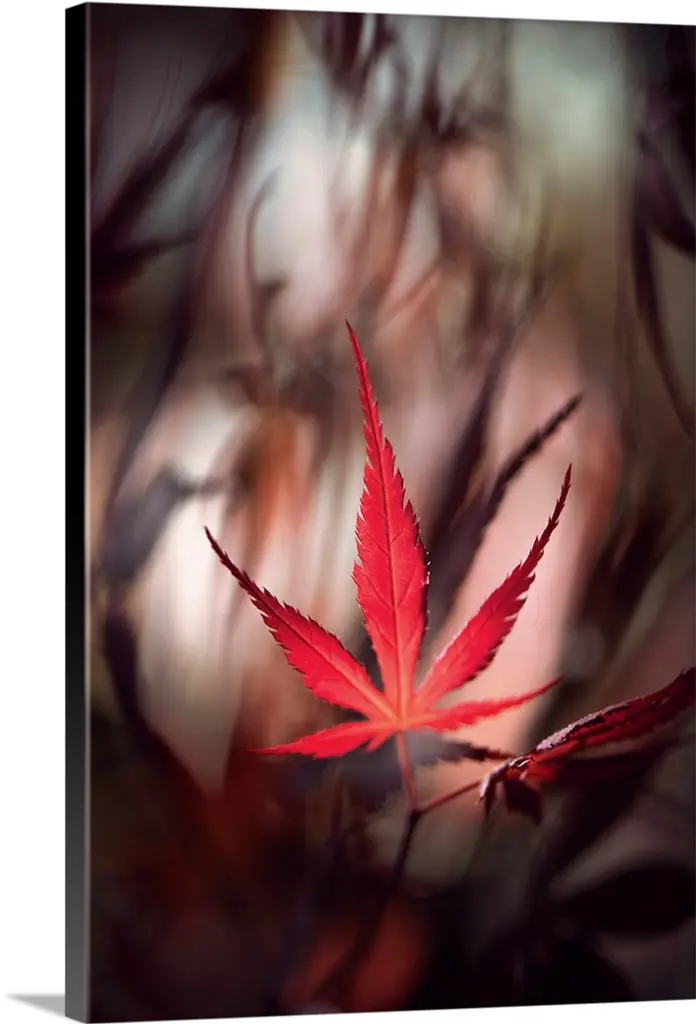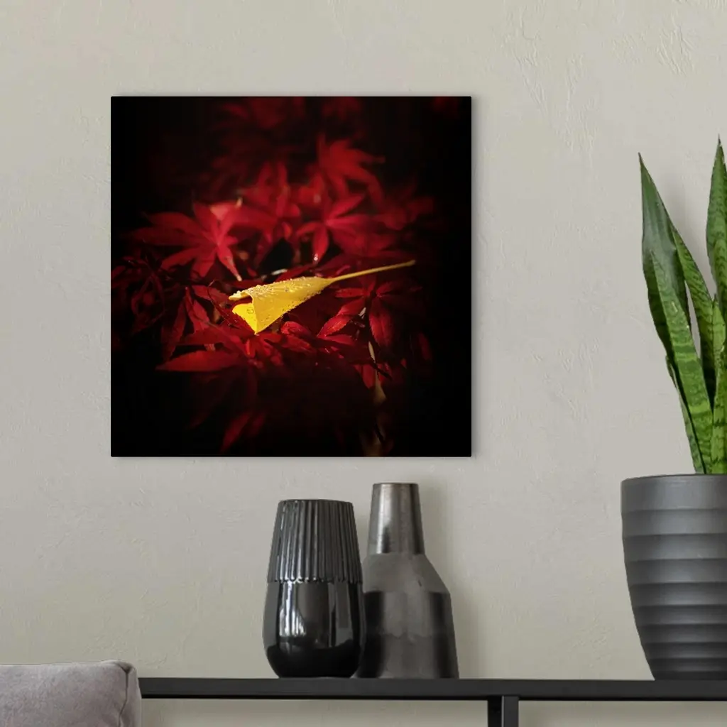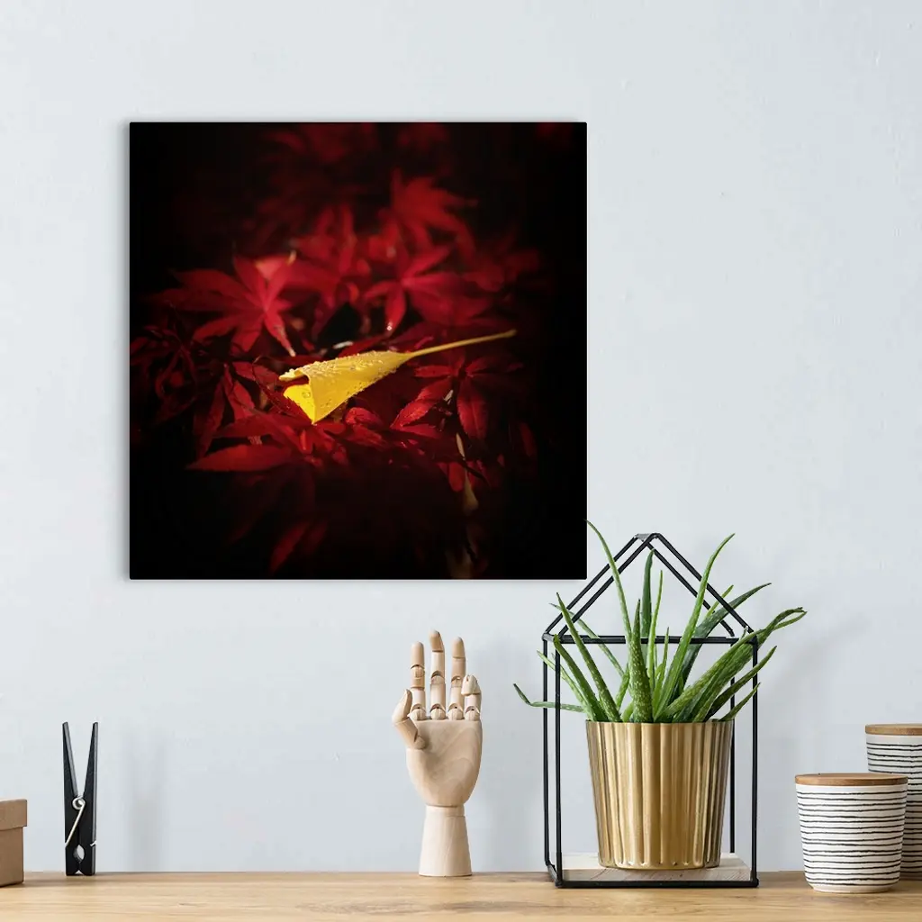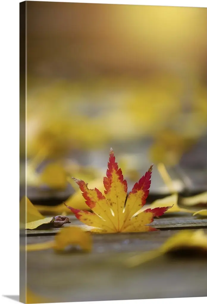 Fine art photograph of a single yellow ginkgo leaf on a bed of red maple leaves.