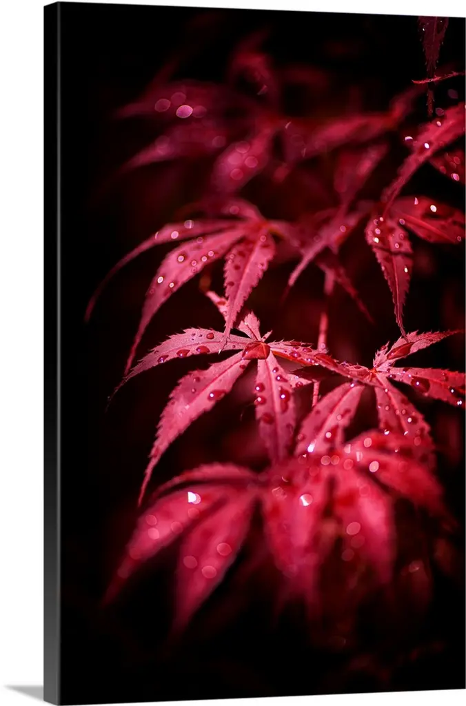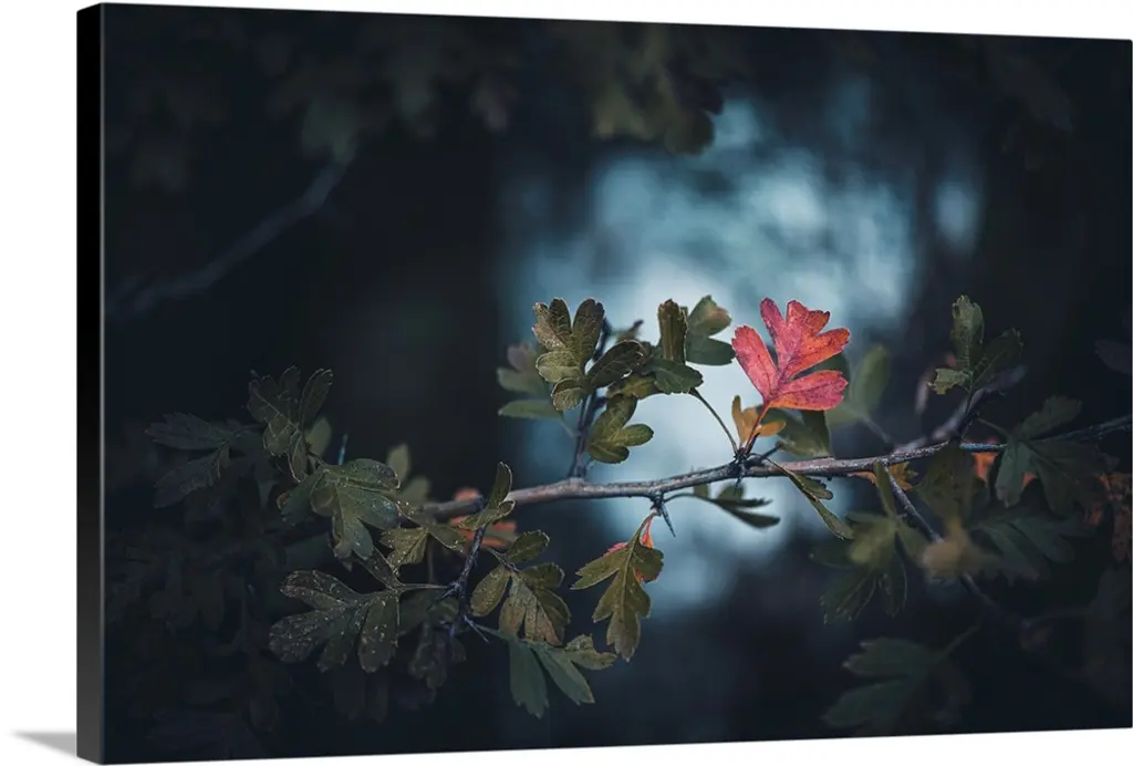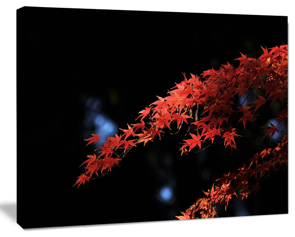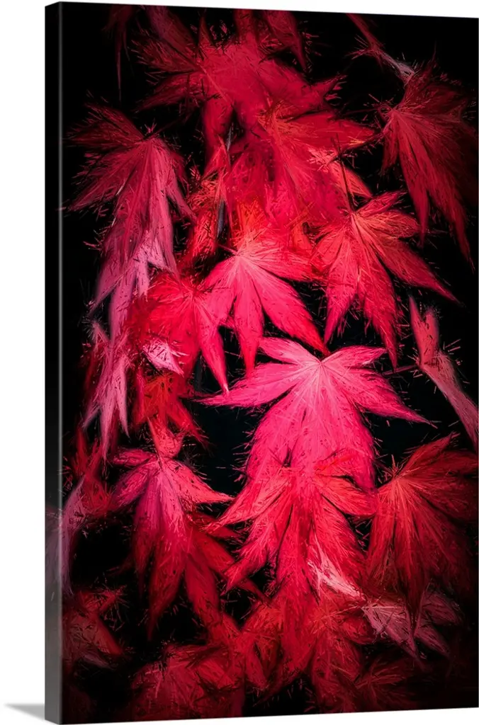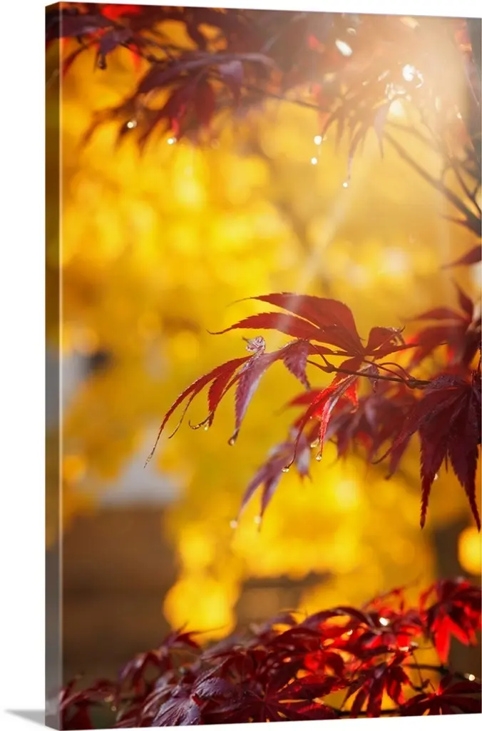 Fine art photograph of a single yellow ginkgo leaf on a bed of red maple leaves.