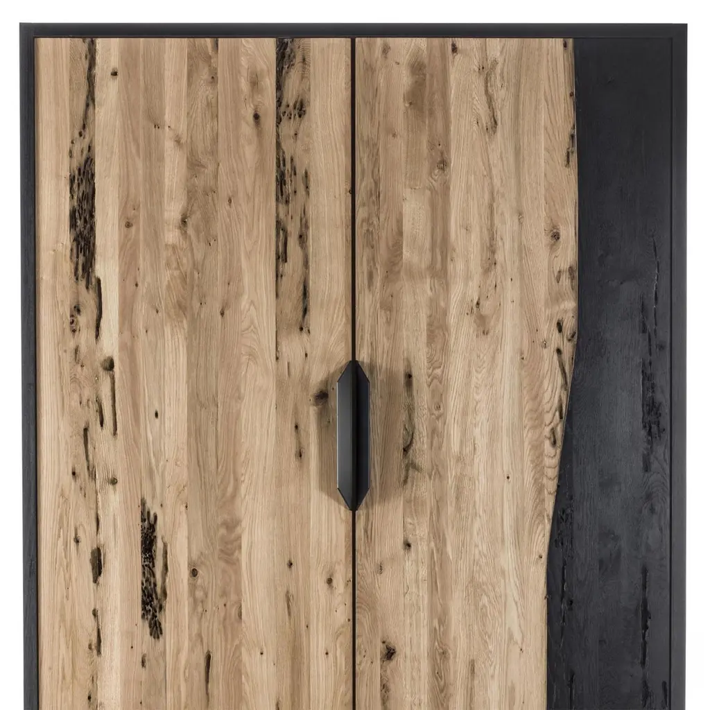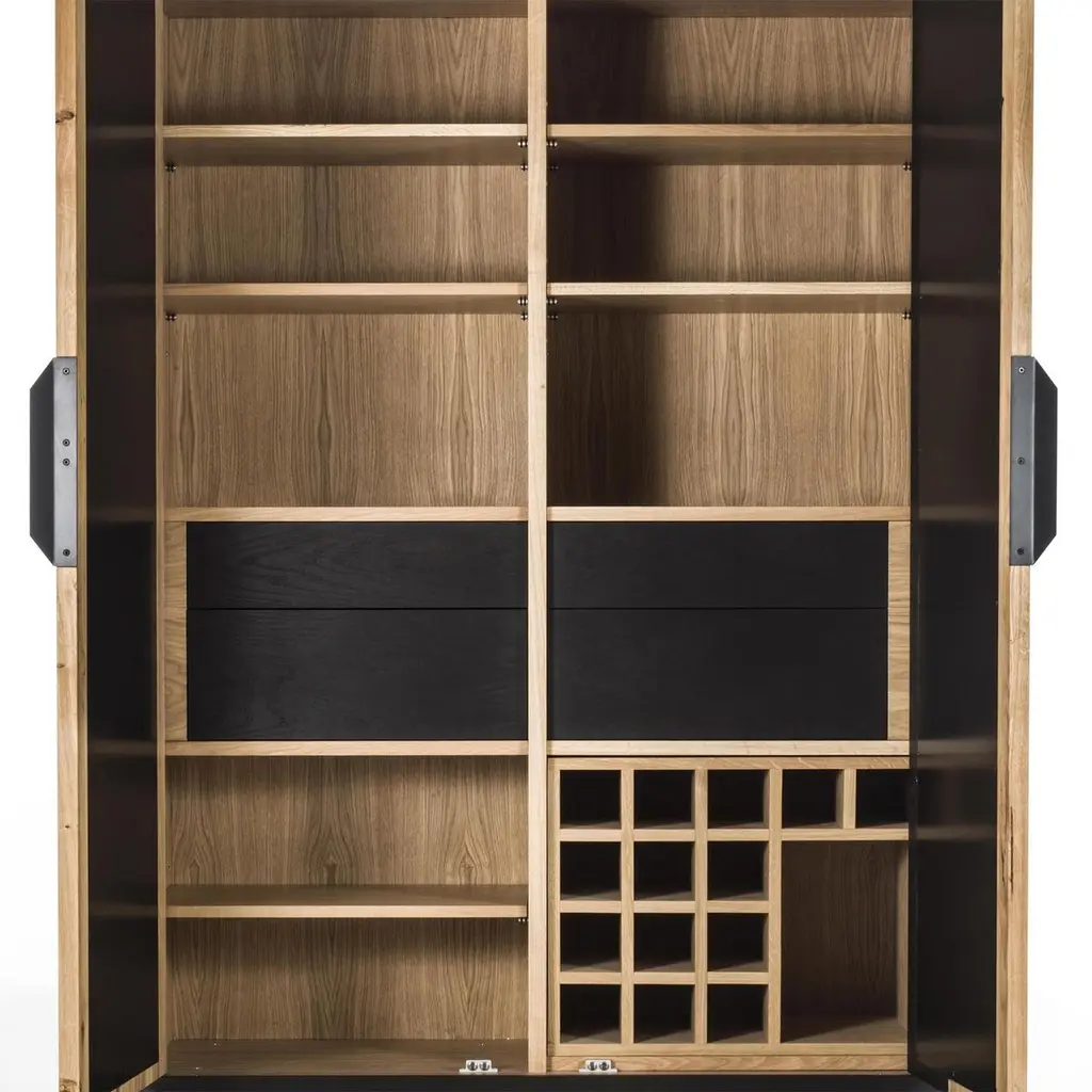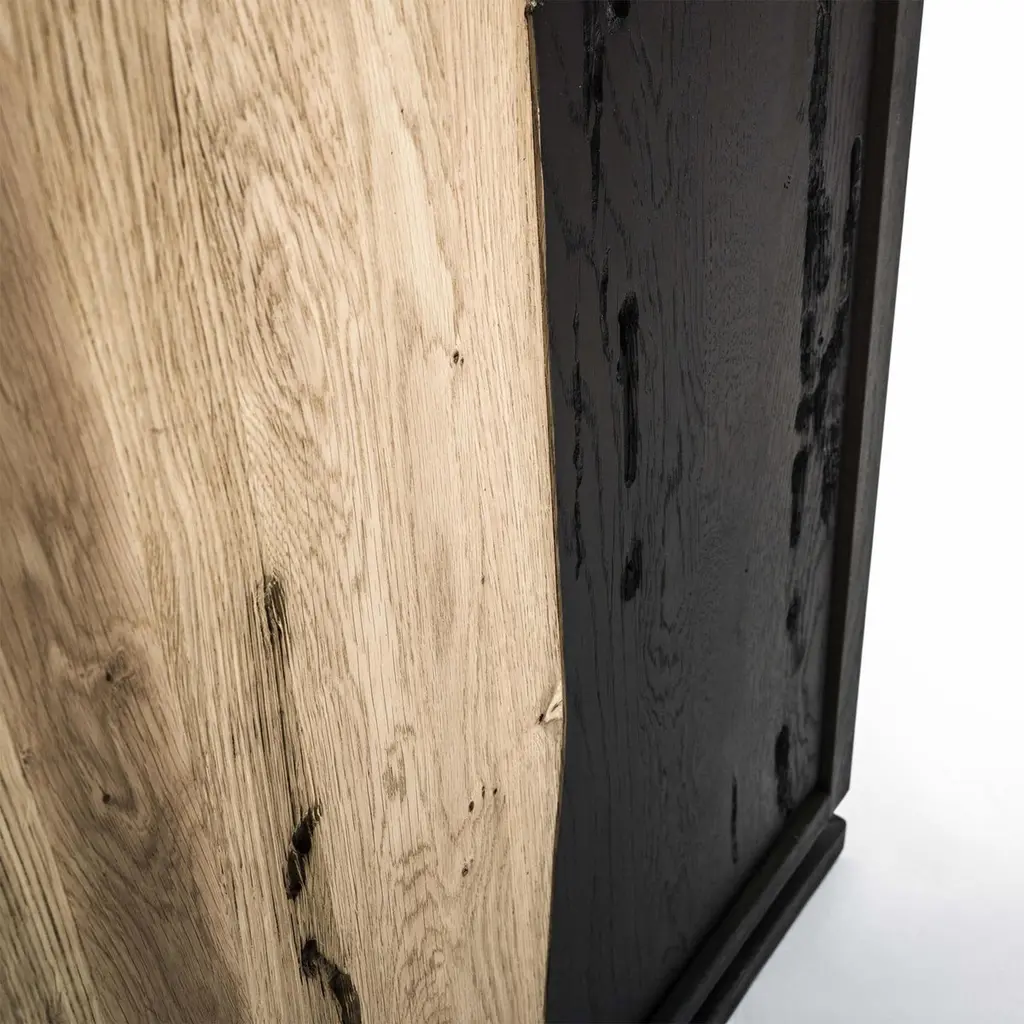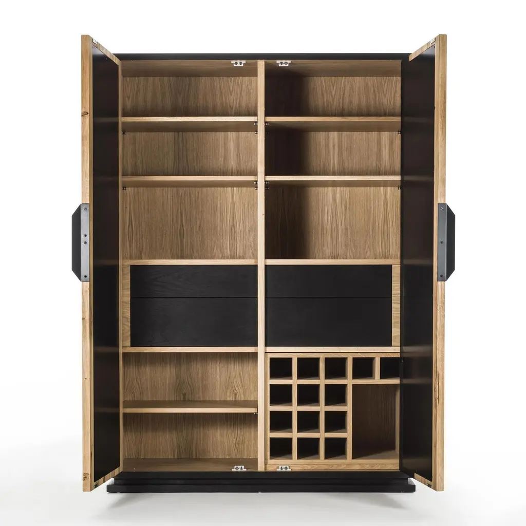 Wine bar natural and burnt oak raw withall structure in natural solid oak raw wood andwith natural burnt solid oak raw wood. With 2doors and with 4 drawers, 5 shelves and 14 bottlesrange inside. Treated with wax with natural pine extracts.