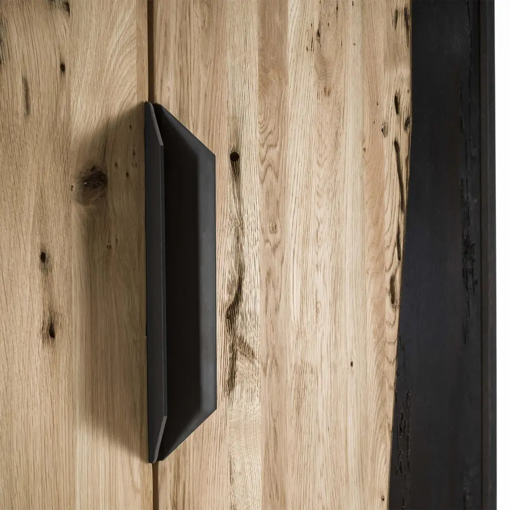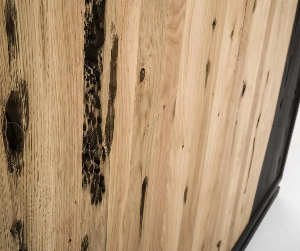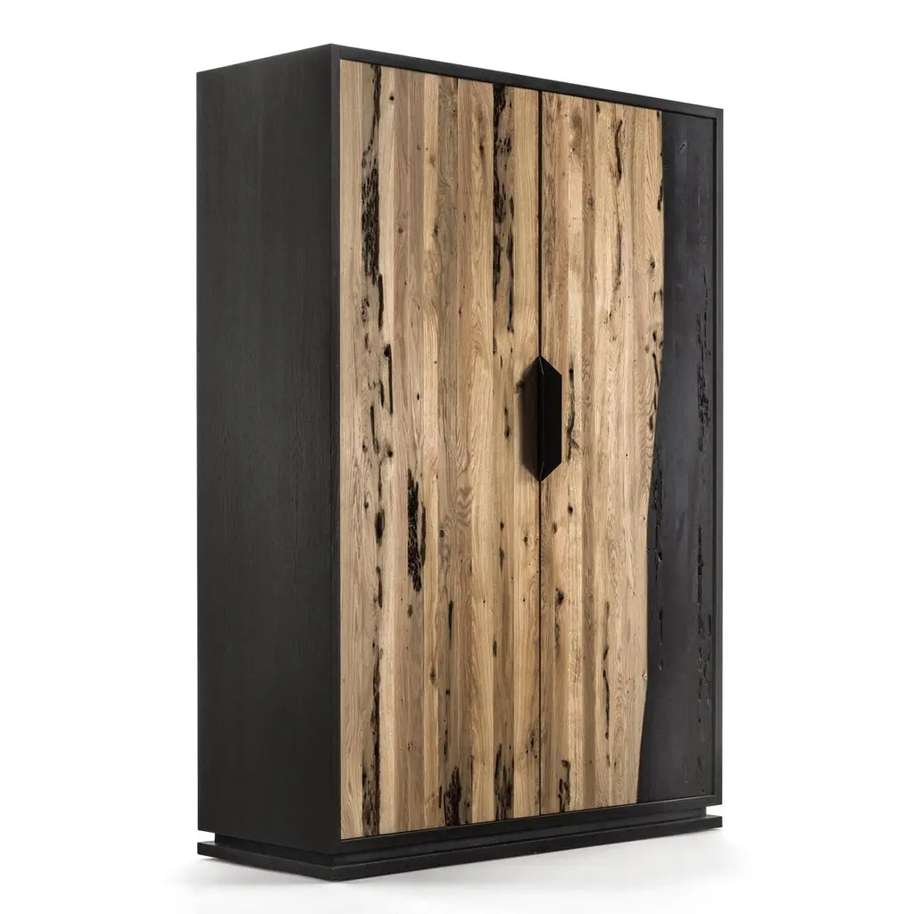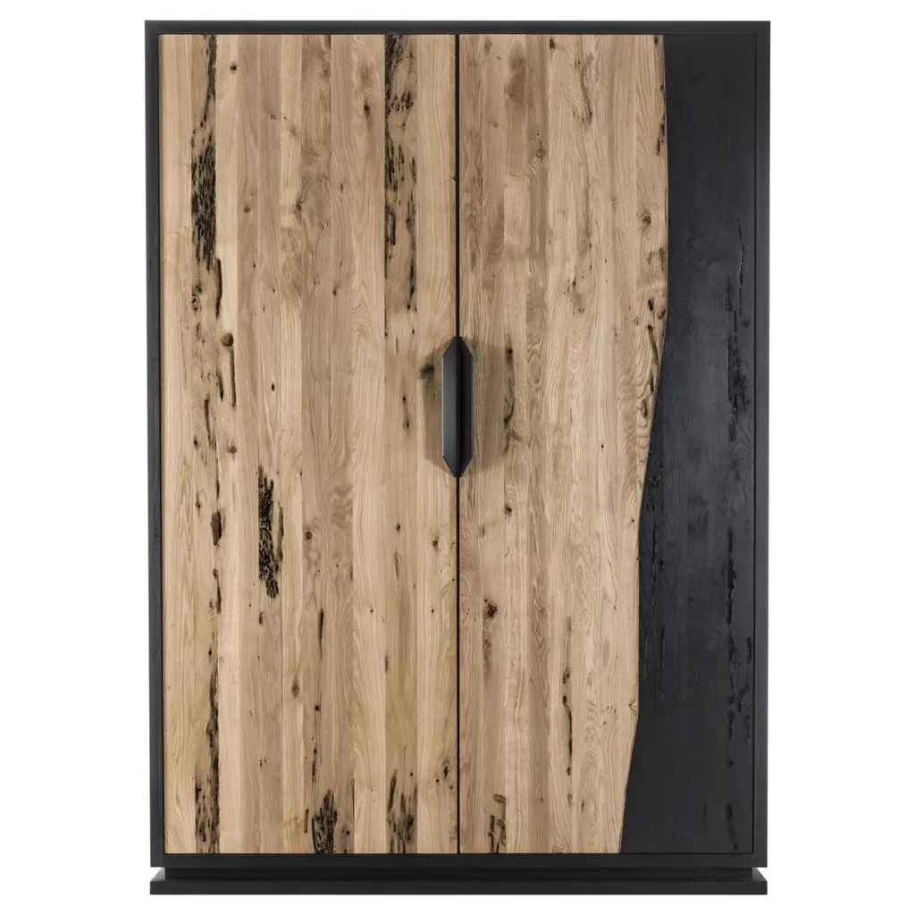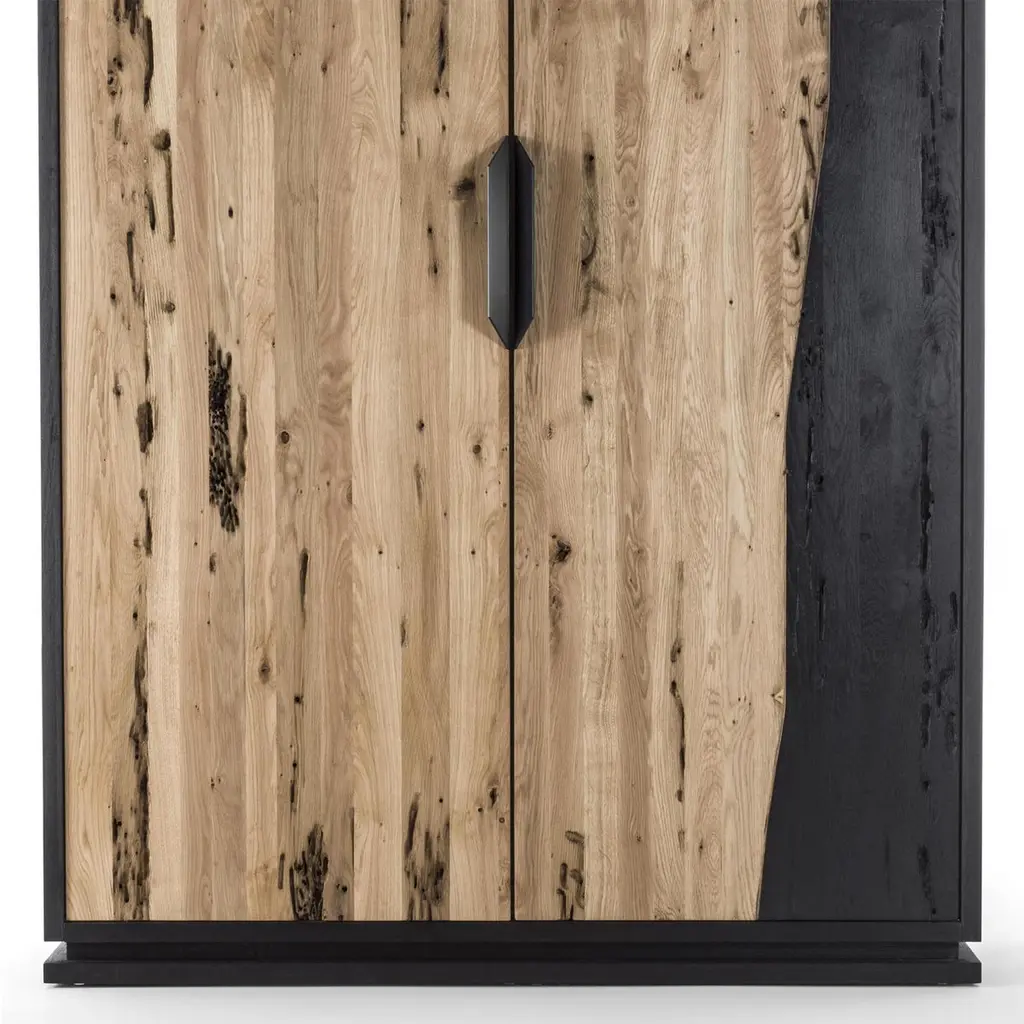 Wine bar natural and burnt oak raw withall structure in natural solid oak raw wood andwith natural burnt solid oak raw wood. With 2doors and with 4 drawers, 5 shelves and 14 bottlesrange inside. Treated with wax with natural pine extracts.