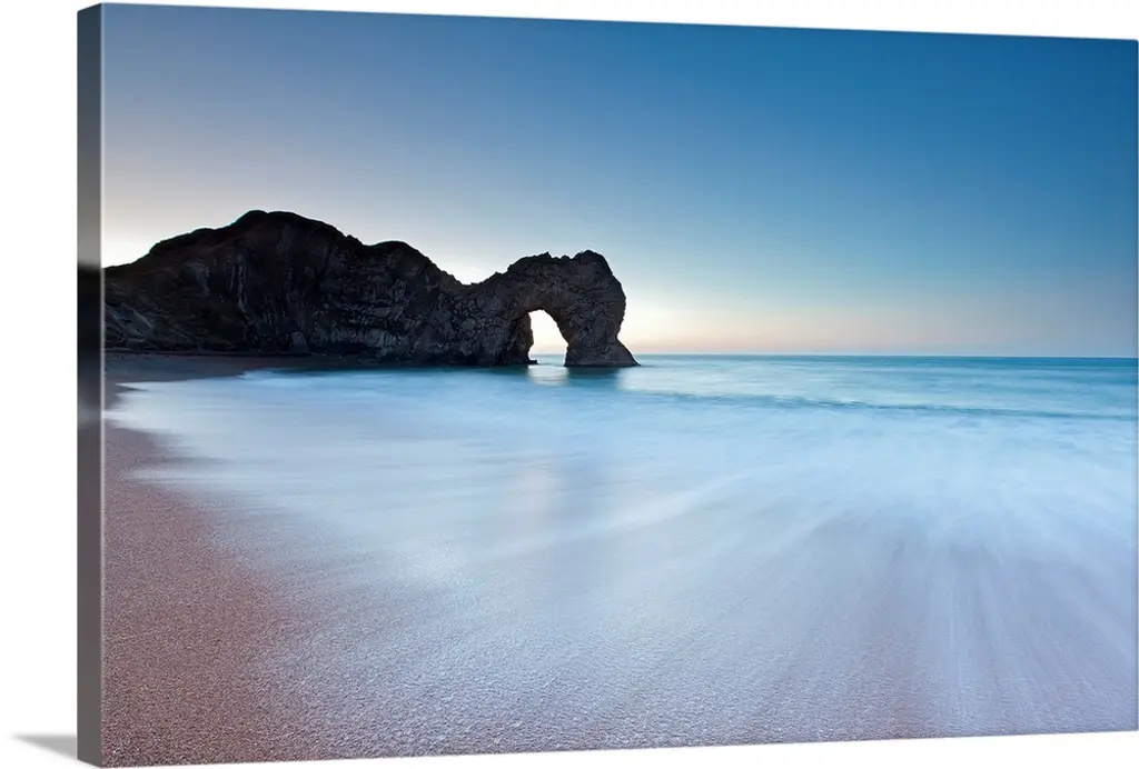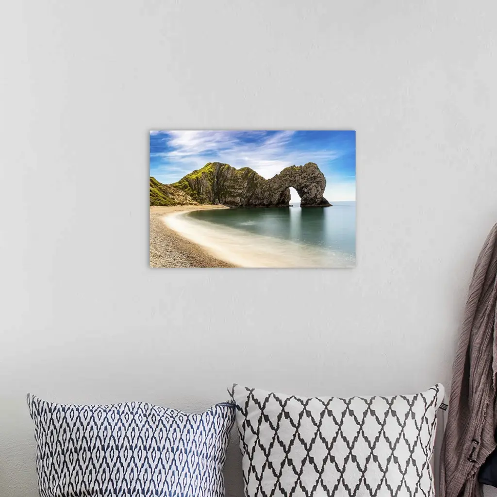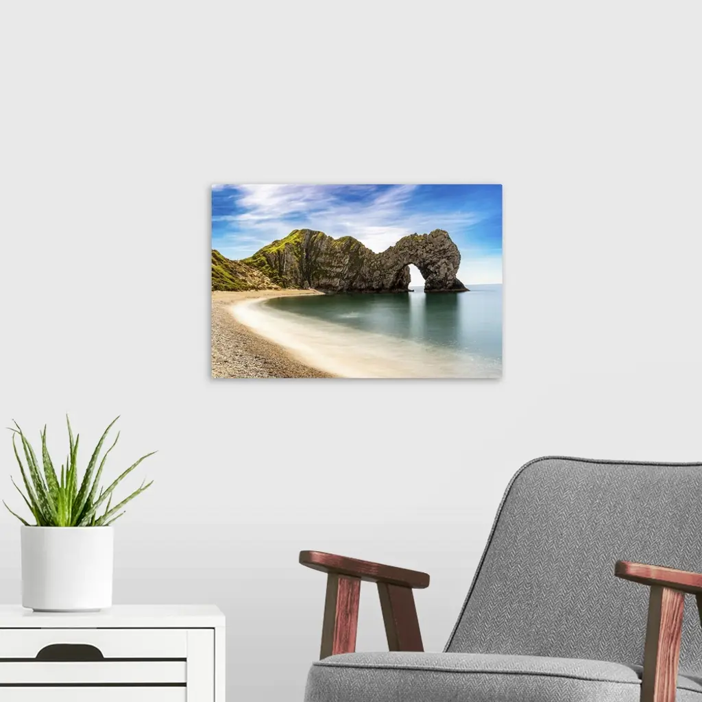 Scenic view of a natural arch on a coastline with a sandy beach and clear blue sky at Durdle Door, Jurassic Coast, UNESCO World Heritage Site, Dorset, England, United Kingdom, Europe