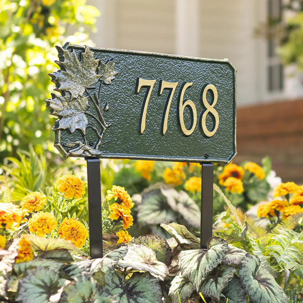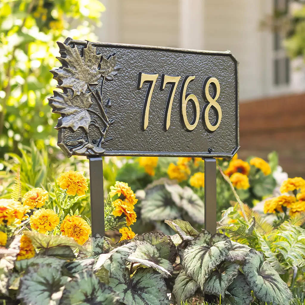 Our Natural Elements Cast Aluminum Address Plaque is the stylish and functional way to set your home apart from the rest on the block. This handsome Lawn Plaque is cast from eco-friendly, recycled aluminum with a rust-free finish that stands up to the elements. Personalized house marker makes a thoughtful wedding, housewarming or anniversary gift - or an attractive addition to your own yard and home. The designs feature branches from favorite trees for a look everyone loves. Handcrafted in Michigan, this attractive, well-made plaque is made to be used and enjoyed. It will stand up to the elements and still look good year after year. Made in USA.