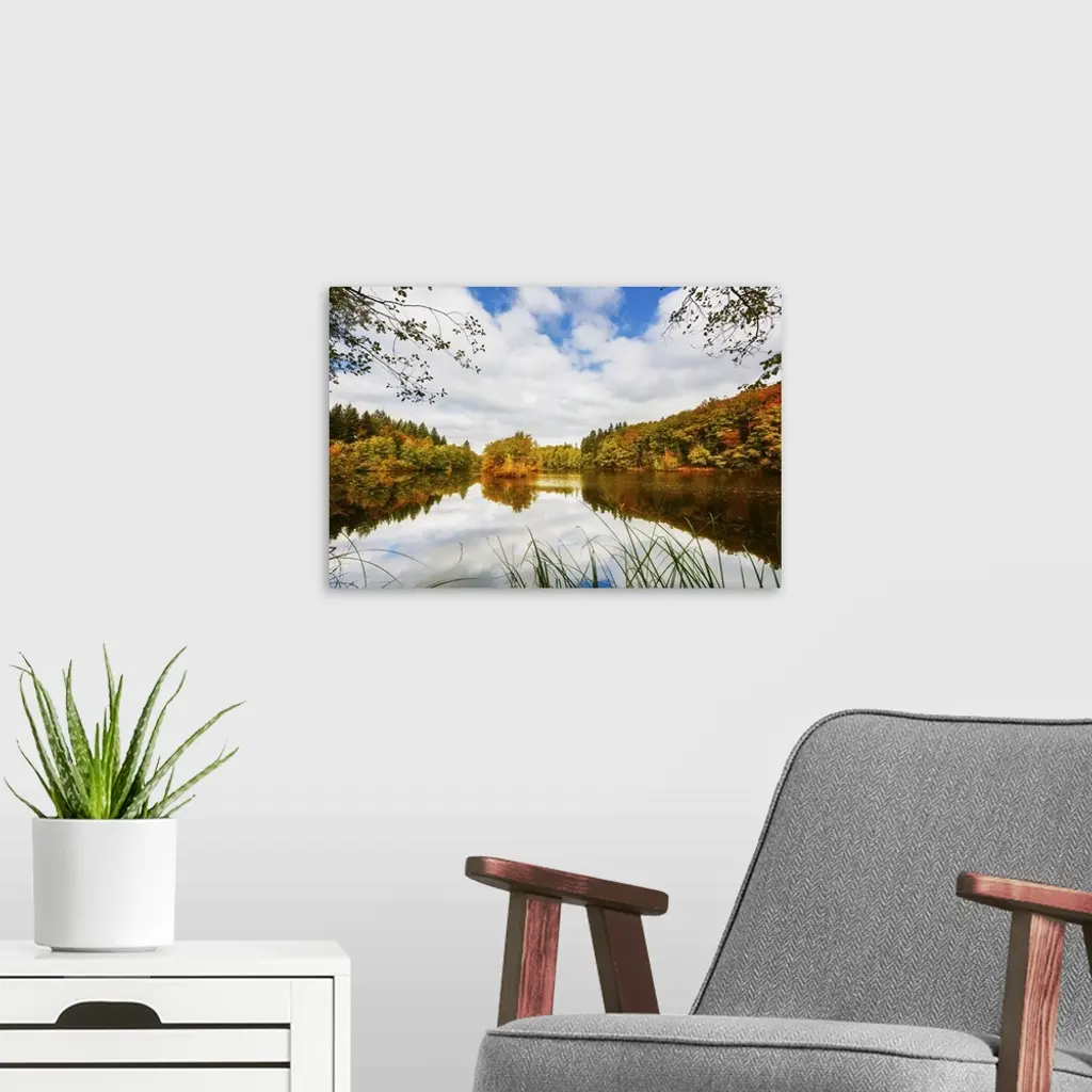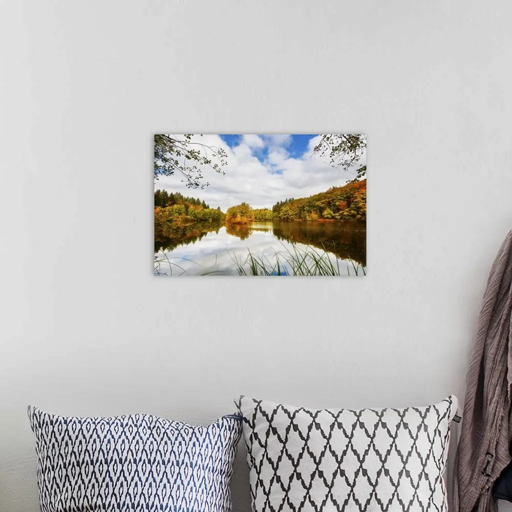 Trees in a variety of fall colors mirrored in a lake with a cloudy sky above.