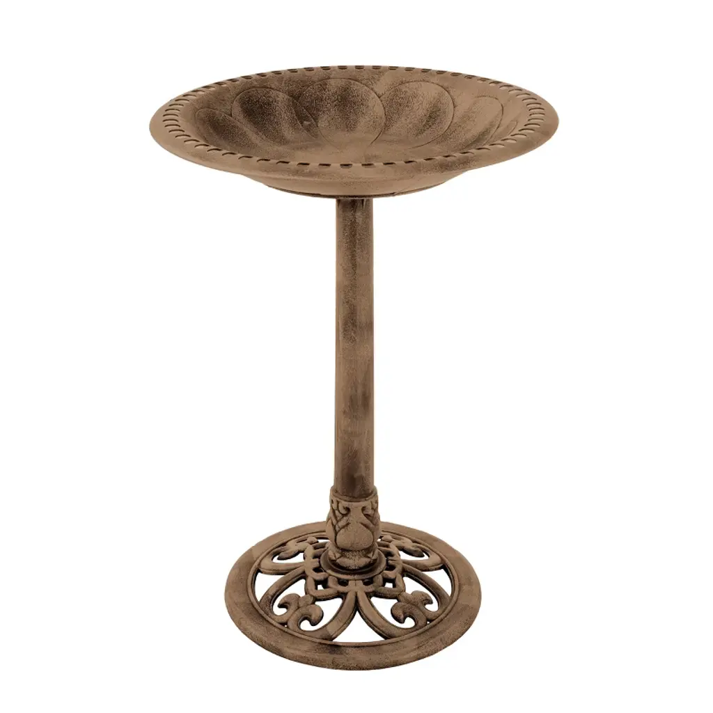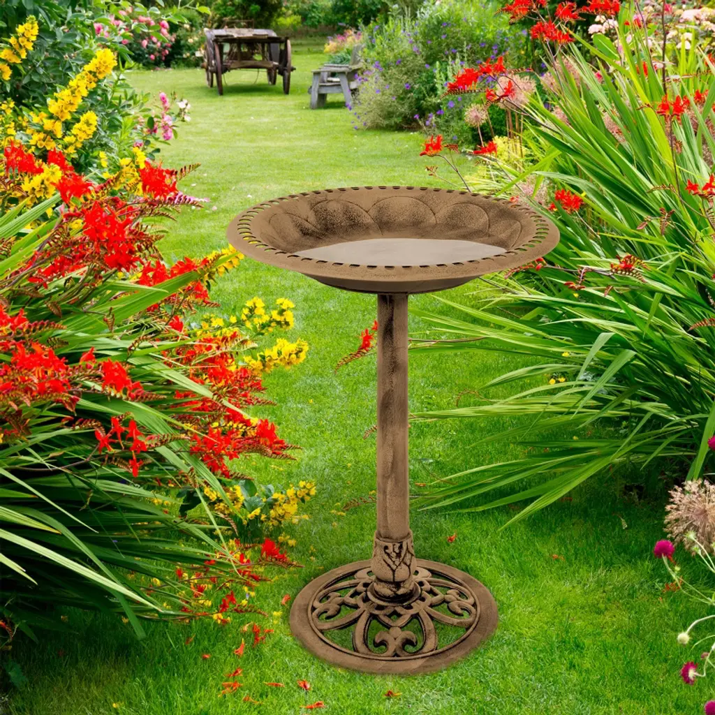 Elevate your outdoor decor with the old-school charm and vintage look of this Pure Garden Weather-Resistant Bird Bath. The antique-style finish and scrollwork detailing of this bird bath for outdoors add picturesque charm to outdoor areas while providing a comfortable space for local wildlife to rest. The bird bath bowl is constructed from weather-resistant polyresin and features a sturdy base with ground hooks and a center post that you can fill with sand for extra stability.