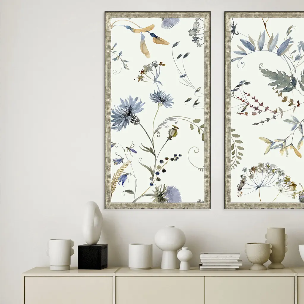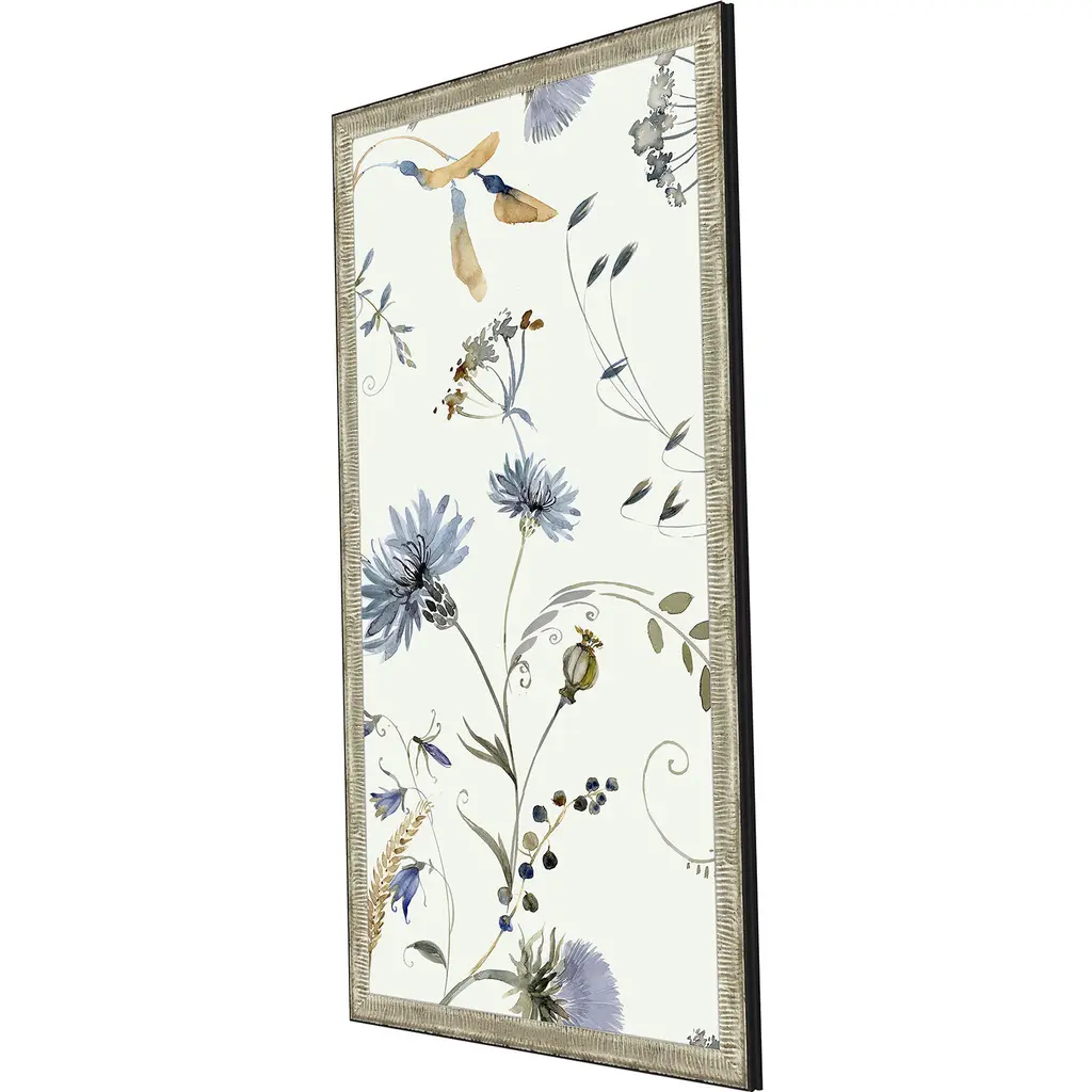 Wispy botanicals with a traditional feel are framed in a antique silver leaf sloped wood with embossed face and black painted side.