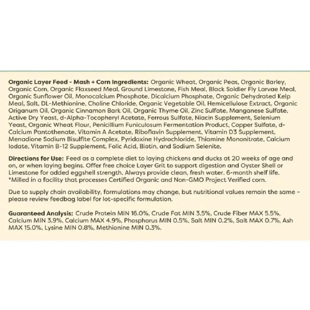 Natures Grown Organics 16% Layer Pellet Poultry Feed is a complete feed for laying chickens. Complete ration for laying chickens, ducks, and geese. Recommended for feeding mature hens and may be used during the entire. production cycle without requiring additional grain or free-calcium sources. Made with 100% certified organic ingredients. Contains a proper balance of energy, amino acids, vitamins and minerals. Contains a proper level of calcium. Wholesome source of nutrition in a single, complete feed. Optimal laying performance. Improved eggshell quality.