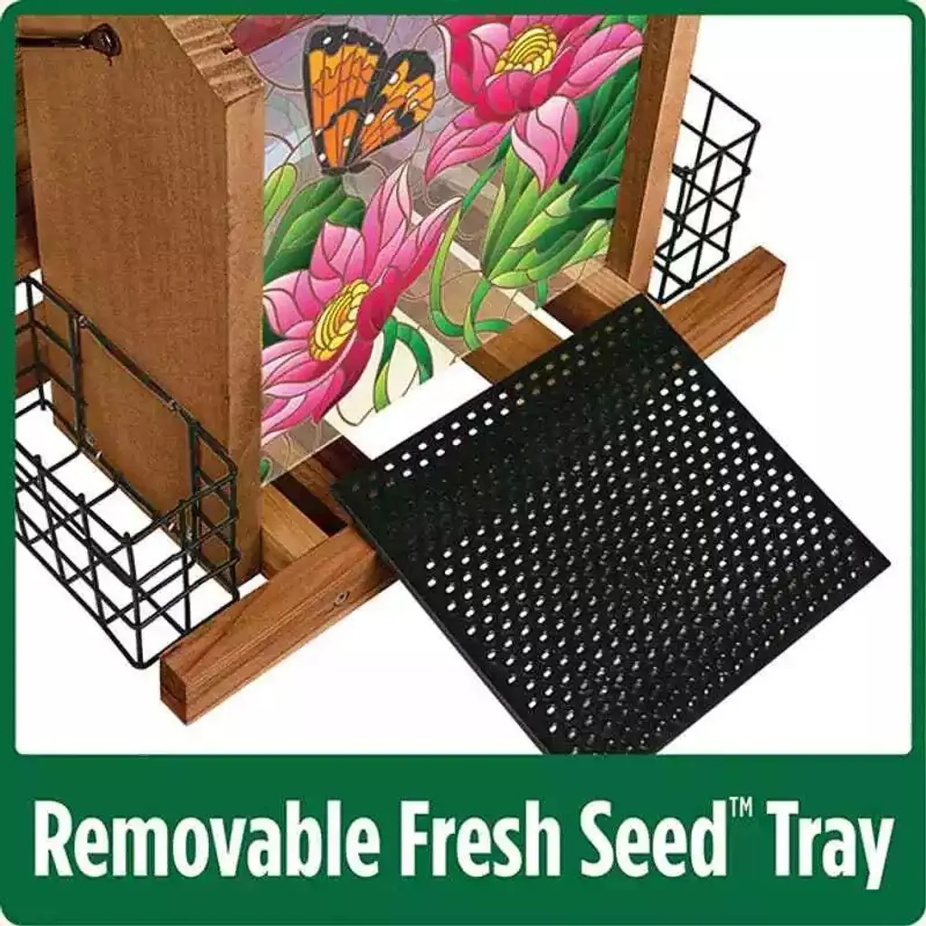 Nature's Way Stained Glass Hopper Feeder is an exquisite bird feeder that is designed to add style and beauty to your backyard or garden while providing your feathered friends with a comfortable and safe feeding experience. Boasting a captivating stained glass design, this feeder is sure to be a conversation starter among your guests. This feeder is made of high-quality materials that are built to last. The frame is made of rust-resistant brushed copper and features a large hopper that can hold up to 4 pounds of seed. Additionally, it comes with two suet cages to provide your birds with a variety of food options. One of the best features of this feeder is its easy-to-clean design. The hopper can be easily removed for cleaning and refilling, making it a breeze to maintain. The suet cages are also removable, making it easy to switch between different types of food. The Nature's Way Stained Glass Hopper Feeder is also environmentally friendly, as it is made from recycled materials.