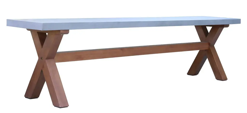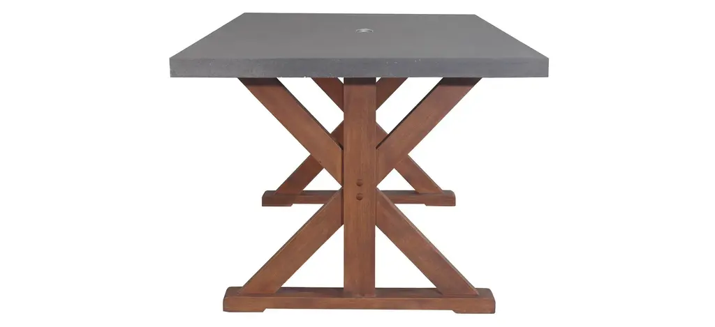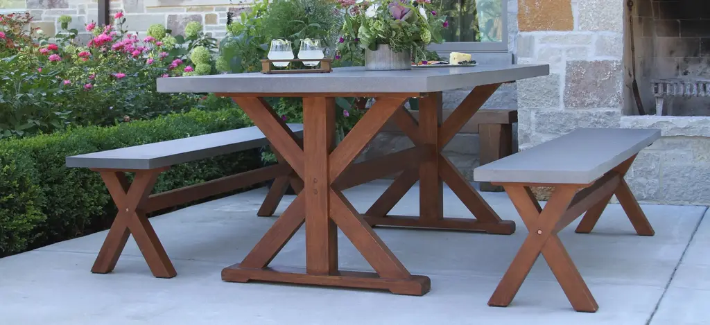 The Nautical 3-pc. Eucalyptus Rectangle Outdoor Dining Set w/ Benches is made from molded polyresin and blended with powdered concrete for texture, density, and long-lasting durability in all climates. The unique final finish, which appears like freshly poured concrete, is durable and resistant to many tough stains for years of use and enjoyment. The table includes an umbrella hole and a matching composite plug.