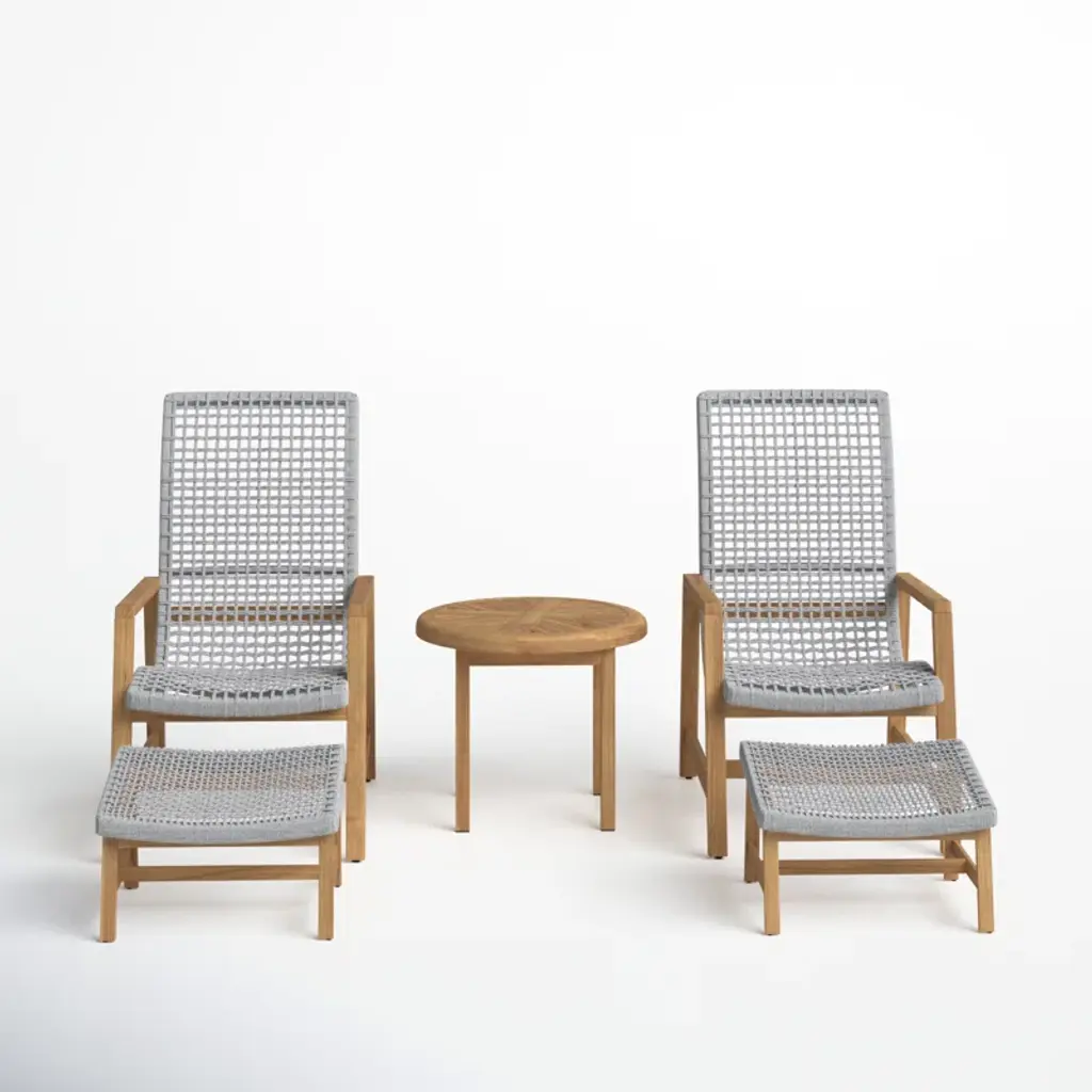 Add a luxury statement piece to your patio with the Nautical 5-pc. teak outdoor lounge set with ottomans. Perfect for the poolside paired with a all teak accent table, this set will become the focal point of your patio or deck. With teak hardwood and reinforced nautical rope, these chairs are genuinely one-of-a-kind.
