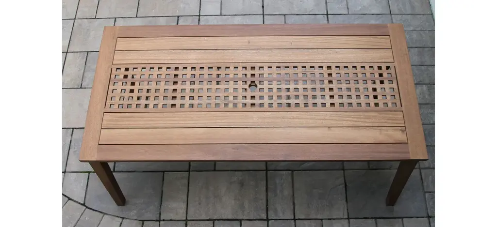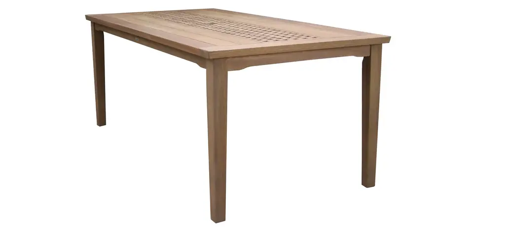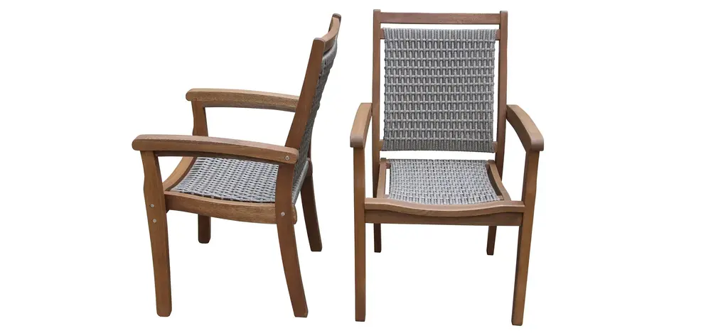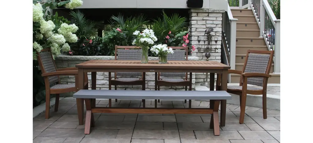 The Nautical 6-pc. Dining Set adds the perfect amount of subtle flair to your patio. It is finished with a beautiful brown umber stain. The center of the table displays a handmade checkerboard runner and beautifully carved legs. This table is accompanied by 4 wicker stacking chairs and a composite bench for optimal seating.