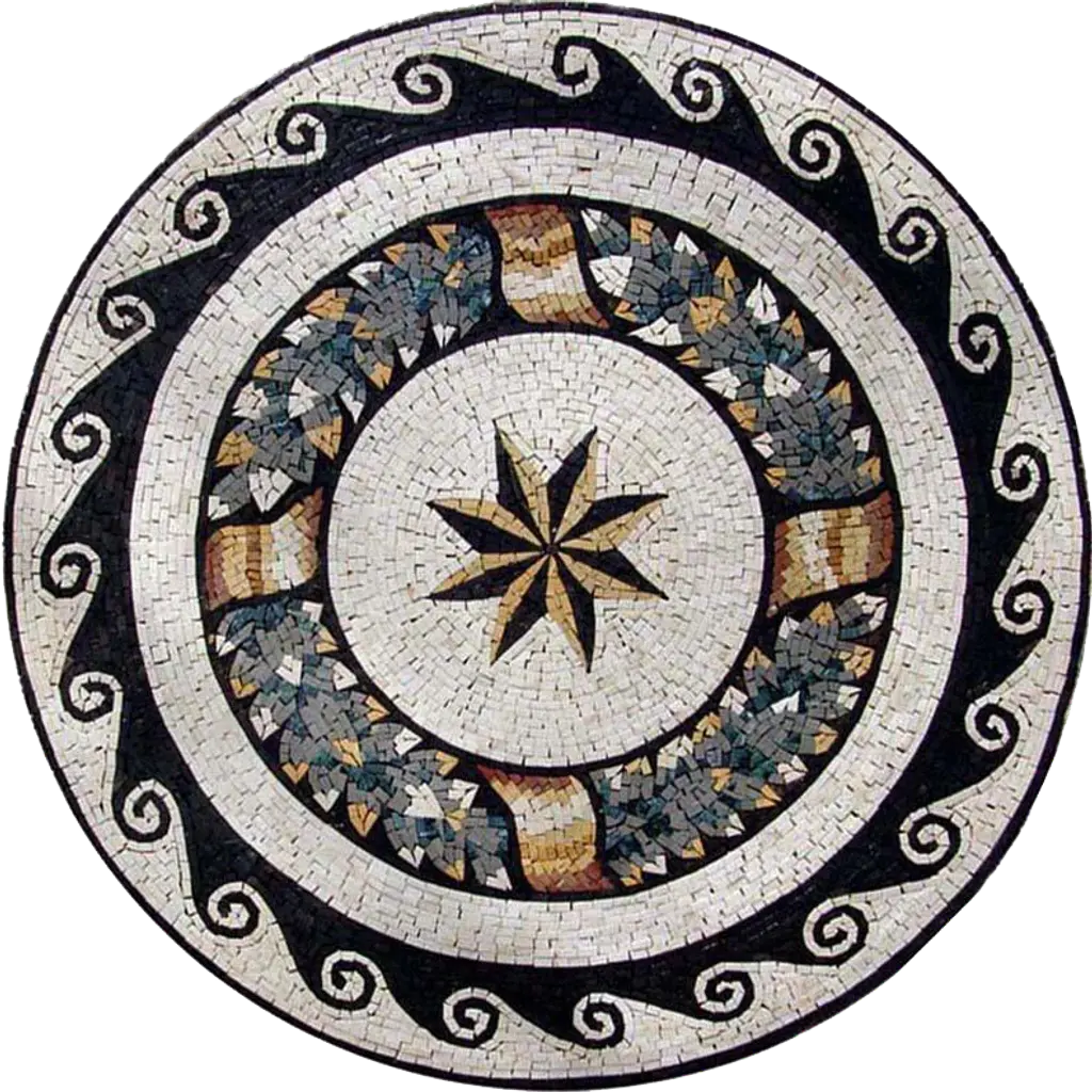 The Lido nautical accent mosaic brings a sea-worthy theme to your walls counter tops or decorative tile flooring. Starting with a gold and black nautical star center the design features gray green and gold tipped leaves with a border of curly black waves. This natural stone medallion makes a splash as a mosaic for pools or as a cornerstone to a water feature in the garden.
