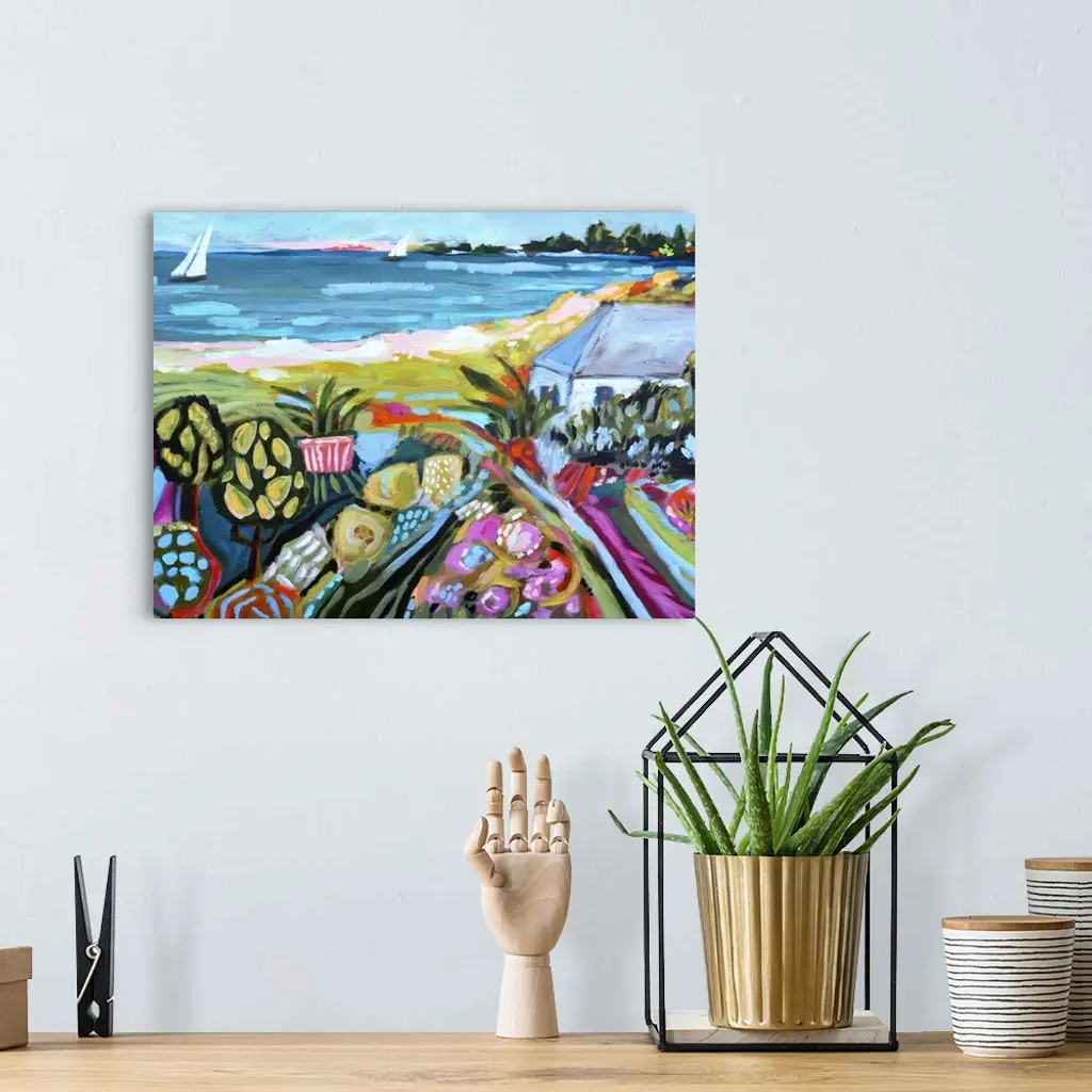 Bohemian style illustration of a coastal landscape with flowering fields and sailboats on the water.