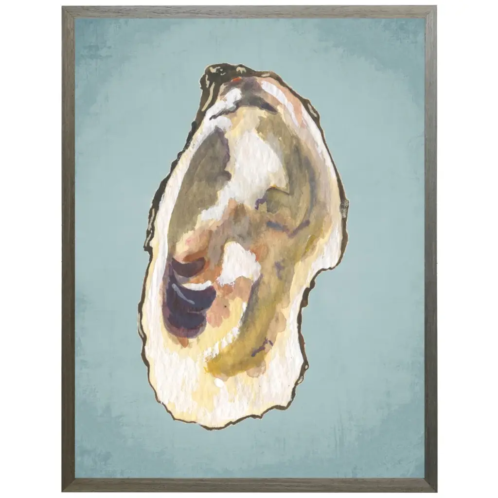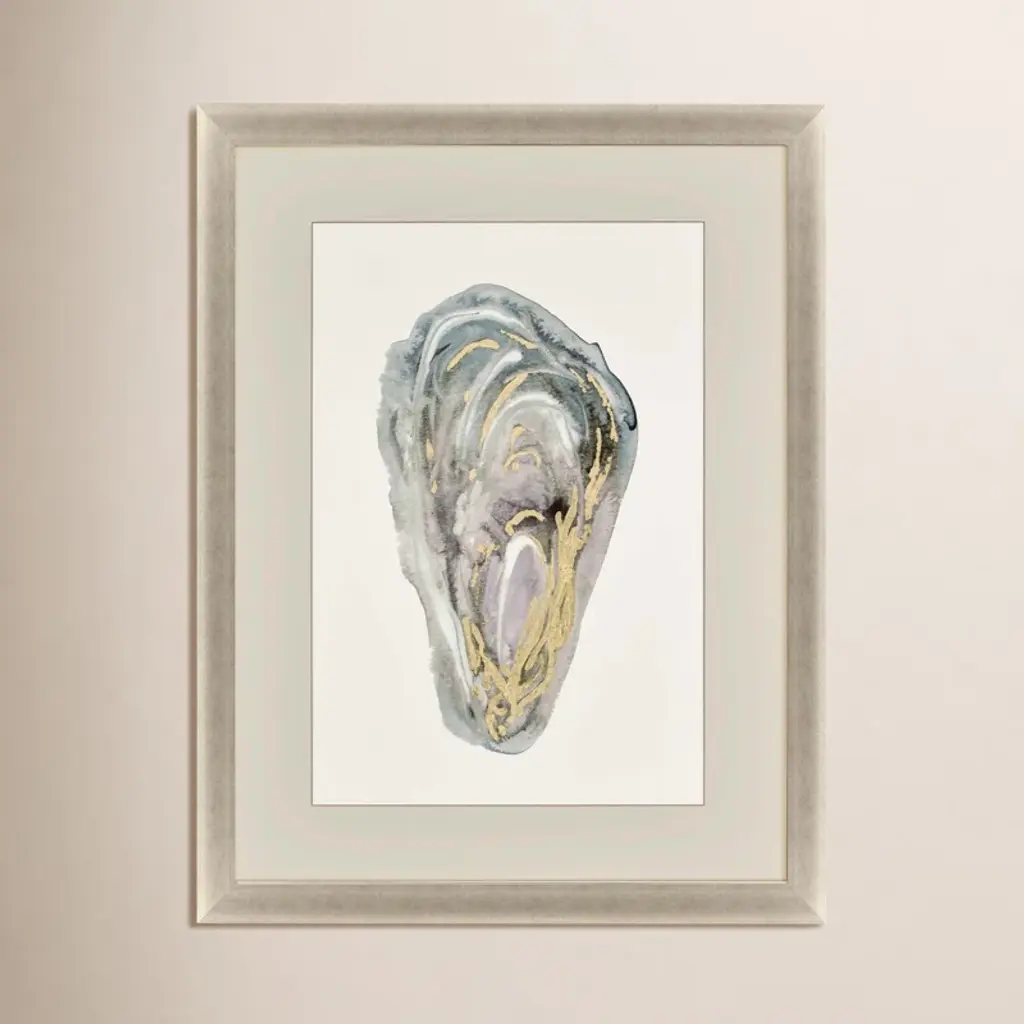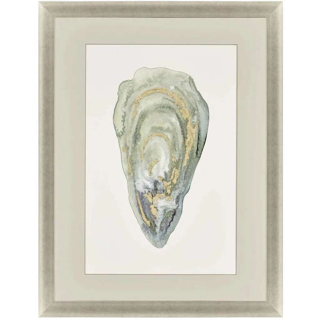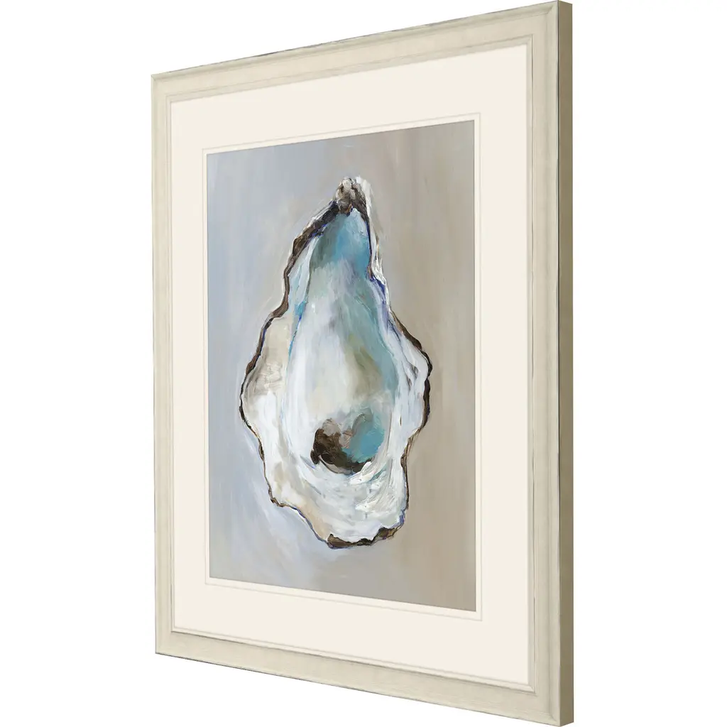 A beautiful beach find, an oyster shell in shades of blue and green is double-matted in white. Framed in a distressed ivory wood.