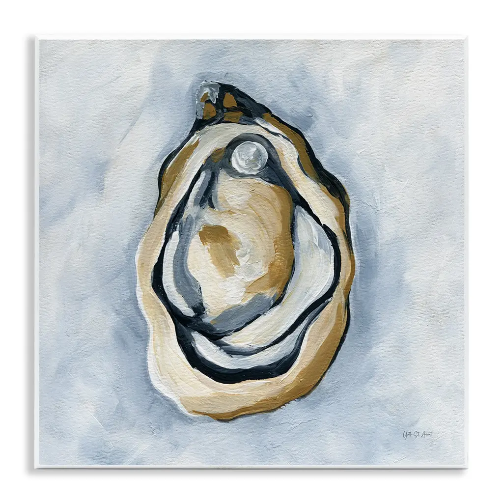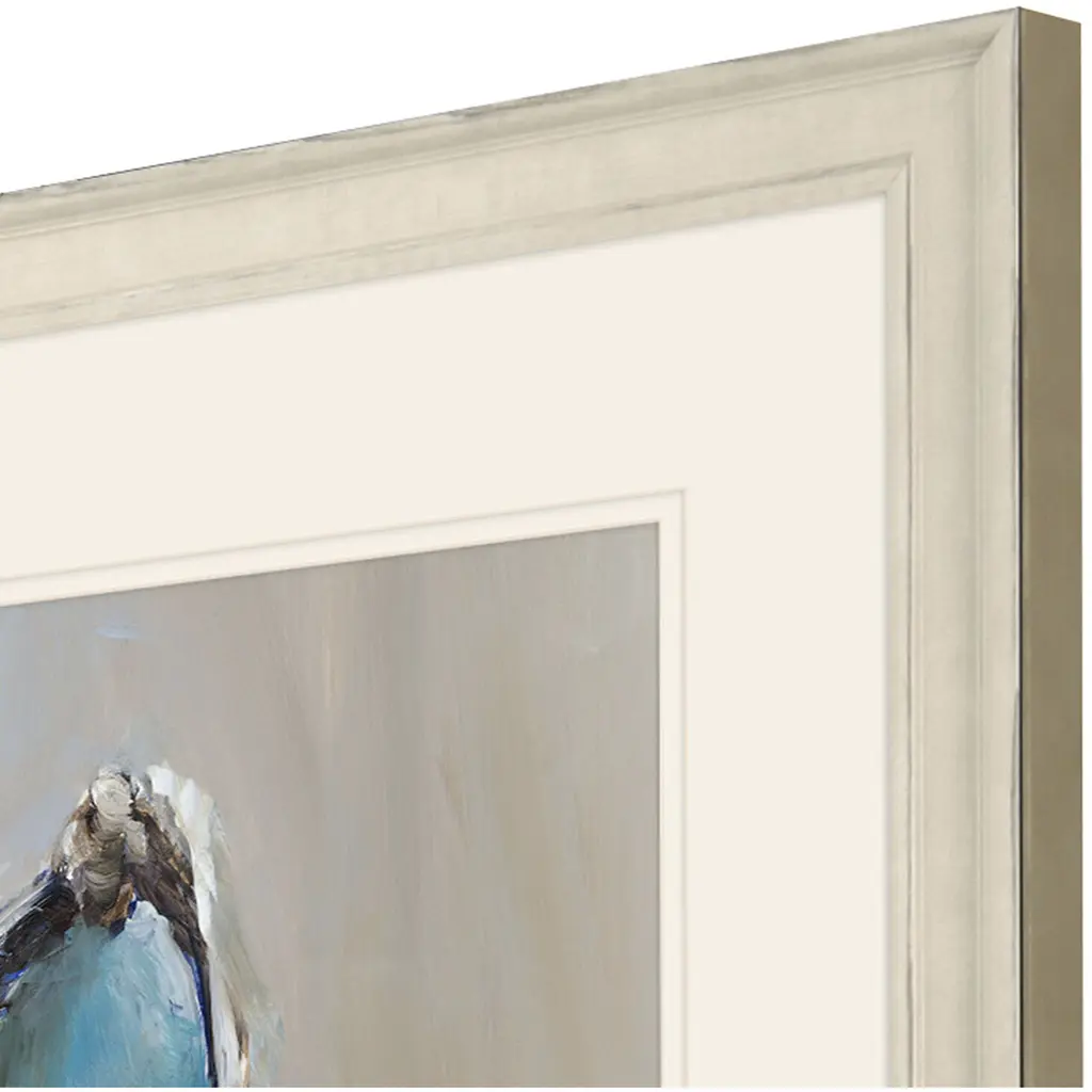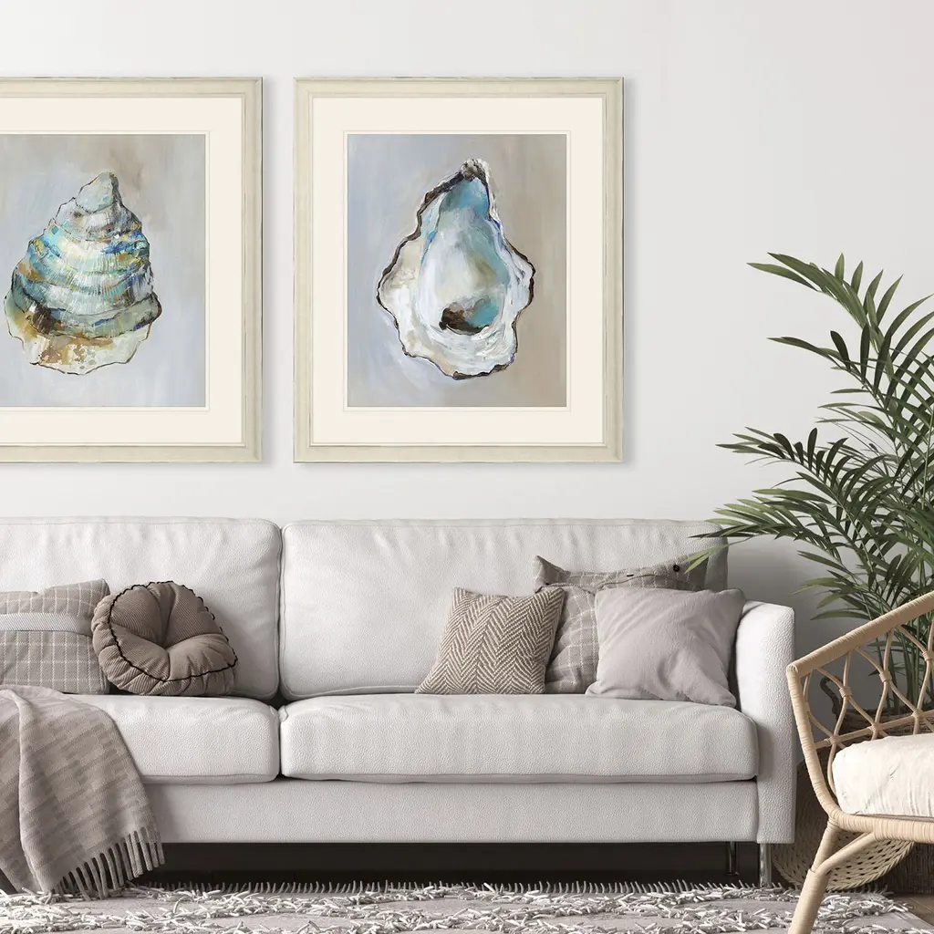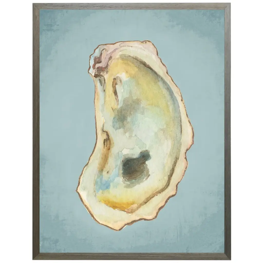 A beautiful beach find, an oyster shell in shades of blue and green is double-matted in white. Framed in a distressed ivory wood.