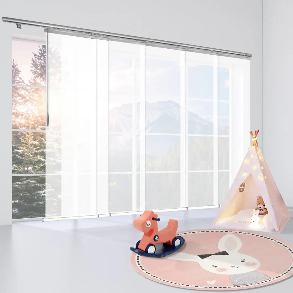 Central Design Products is pleased to introduce a new innovative panel track that offers easy 2-way installation, adding an alluring style and refined touch to your home decor. The single rail design of the track is sleek, compact, and reduces the overall footprint and weight of the installation, eliminating bulky, intrusive window treatments. Adjusting the panel height is a breeze � simply trim the panel, re-attach the liner, and install the panel weight. Detailed instructions are included.The panel track also features a patented slider design, made with aluminum and fitted with bearings that allow for durable and smooth operation. The sliders are stacked closer together than conventional panel tracks, reducing light bleed coming from the gaps between panels. This track has endless uses from dividing rooms, garages, offices, and closets to decorating windows and patios. Available in larger sizes including 8, 10, and 12 panels. Extends from 98-130� wide. Each panel measures 23.5" wide and 91.5" tall, with a total installation height of 94" (includes the 2.5" rail track). The track can be wall or ceiling mounted. The panels can stack on the left or the right. The clearance from the wall is extendable from 1.25� to 3.25� and projection from the wall is extendable from 3� to 4.25�. Navajo White panel is made from 100% Polyester, with a light filtering shade that blocks 50% of the light.