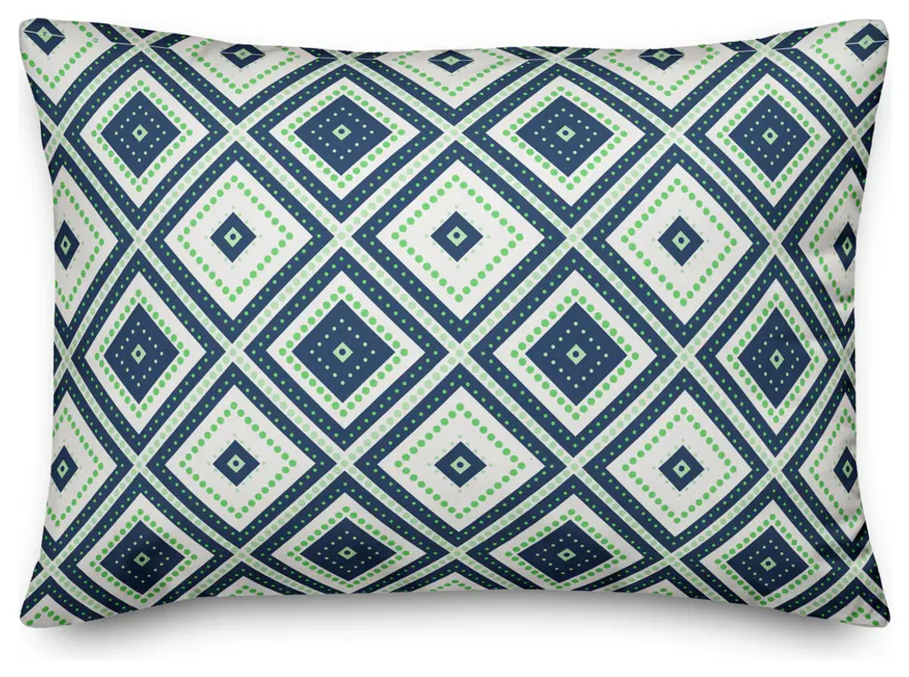 Spruce up your outdoor seating with this outdoor lumbar throw pillow, featuring a navy and green diamond design. The water and mildew resistant heavy weight stretch material provides great color definition and quality. The result is a unique pillow that is sure to add some personality to your outdoor living space!